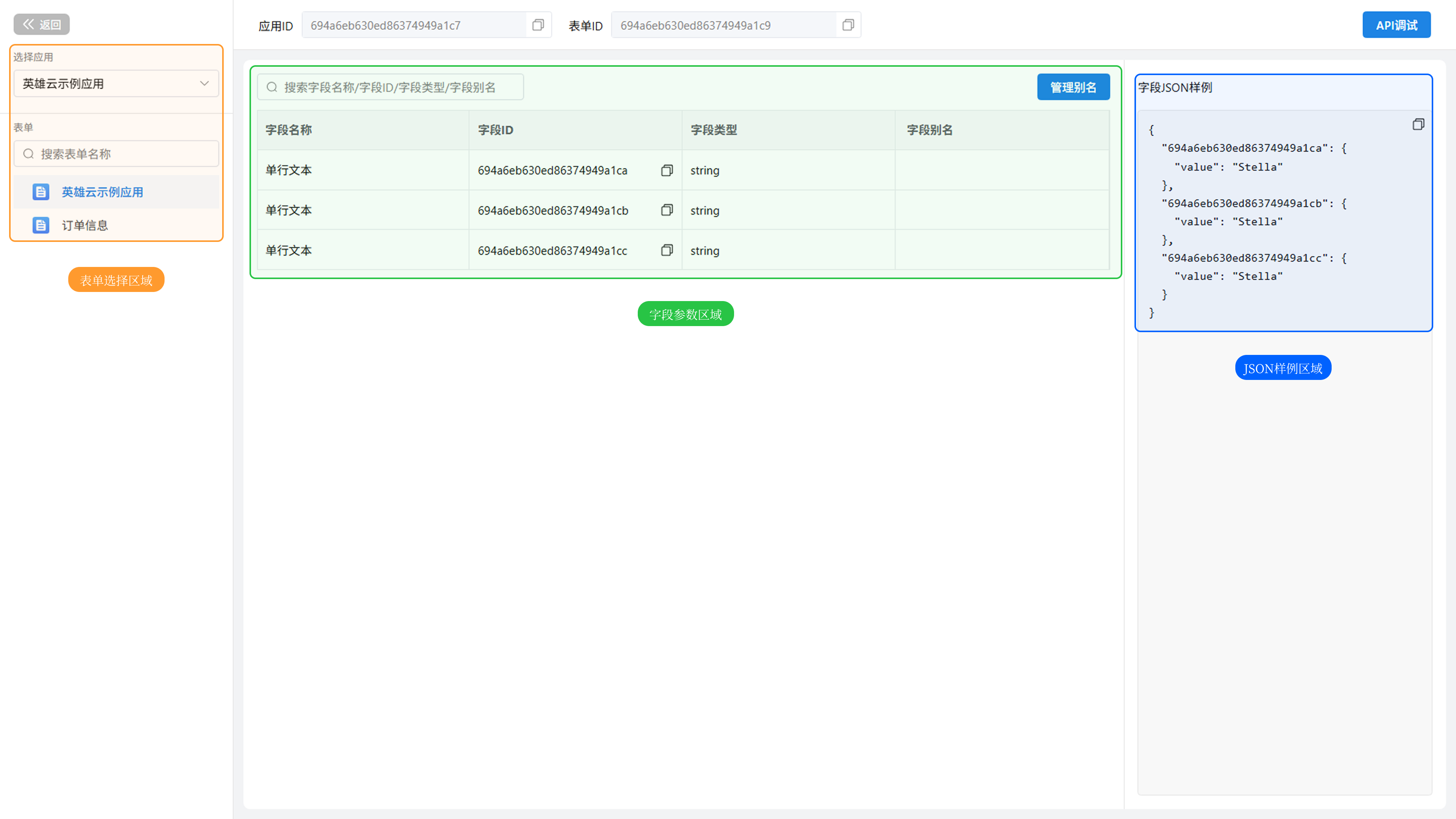 - 新增参数说明:可快速搜索定位应用/表单,直观查看字段参数、设置别名,并获取字段JSON结构样例。