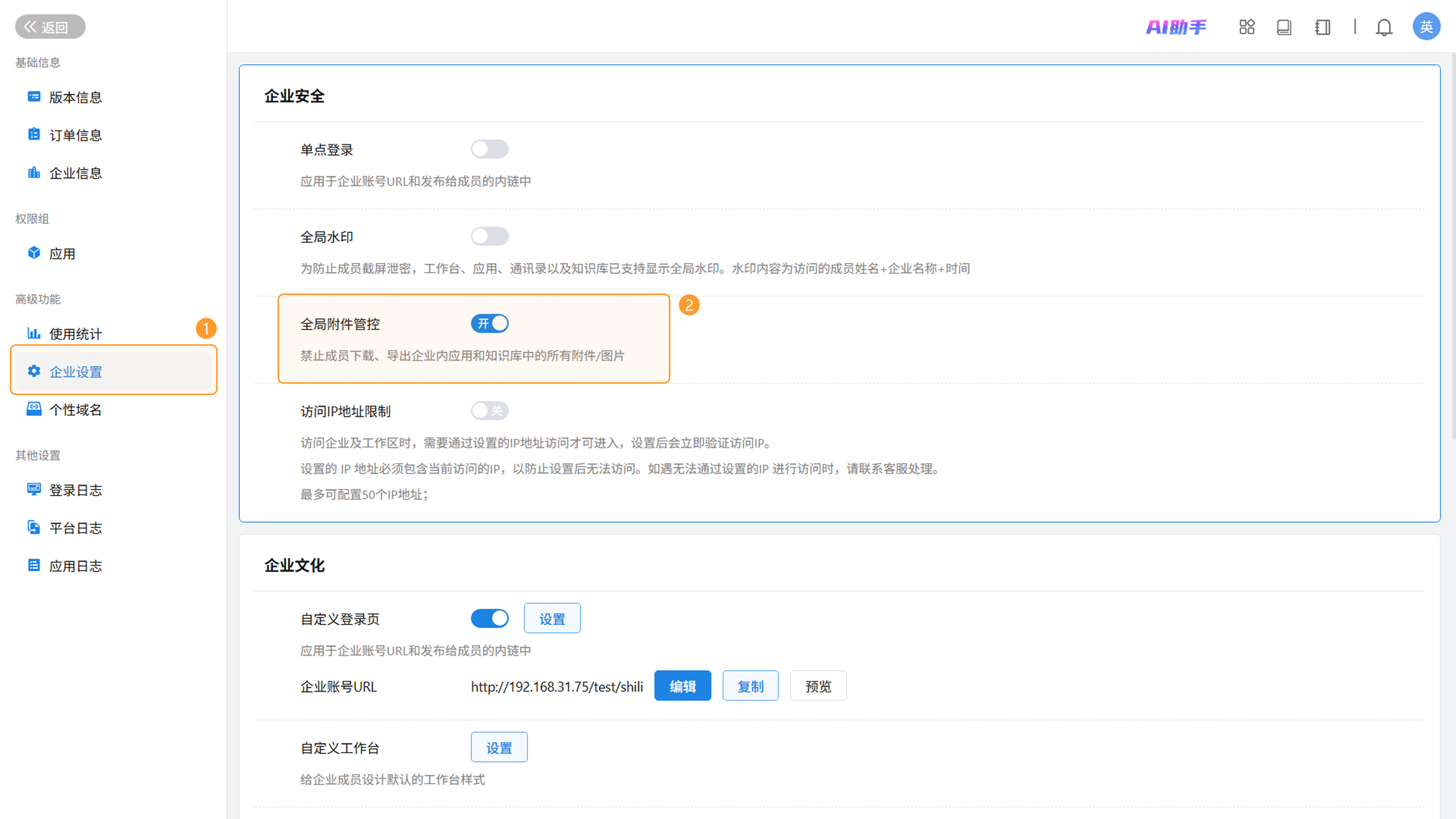 全局附件管控设置入口:个人头像>>企业管理>>企业设置>>全局附件管控
