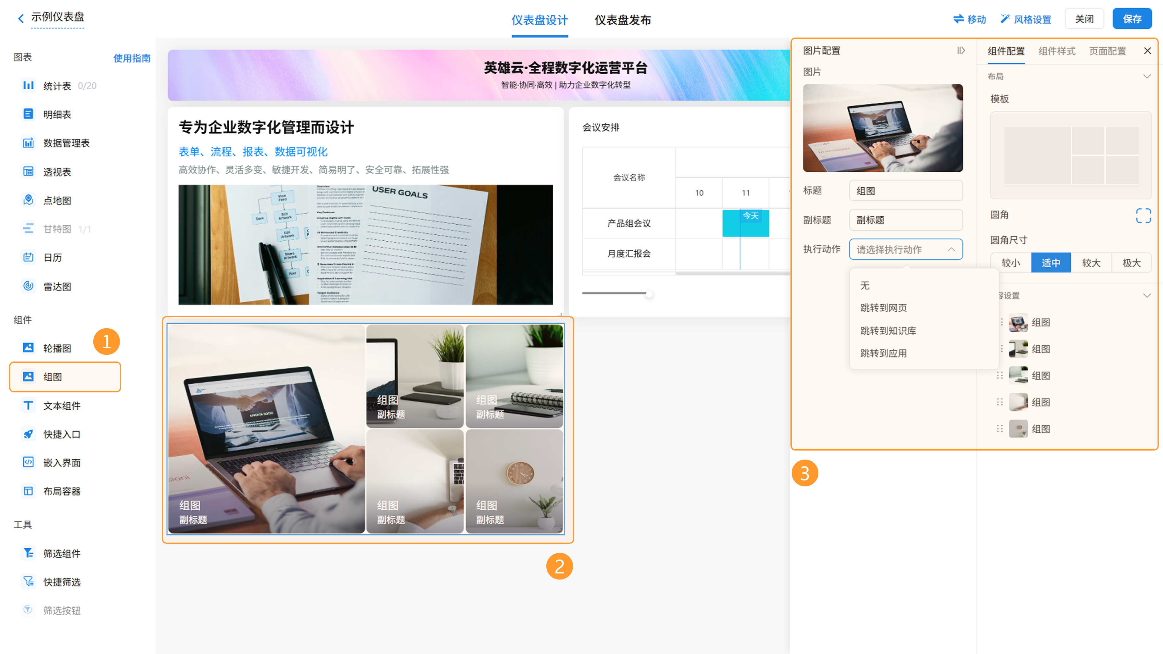 配置路径:编辑仪表盘 >> 添加组件 >> 组图