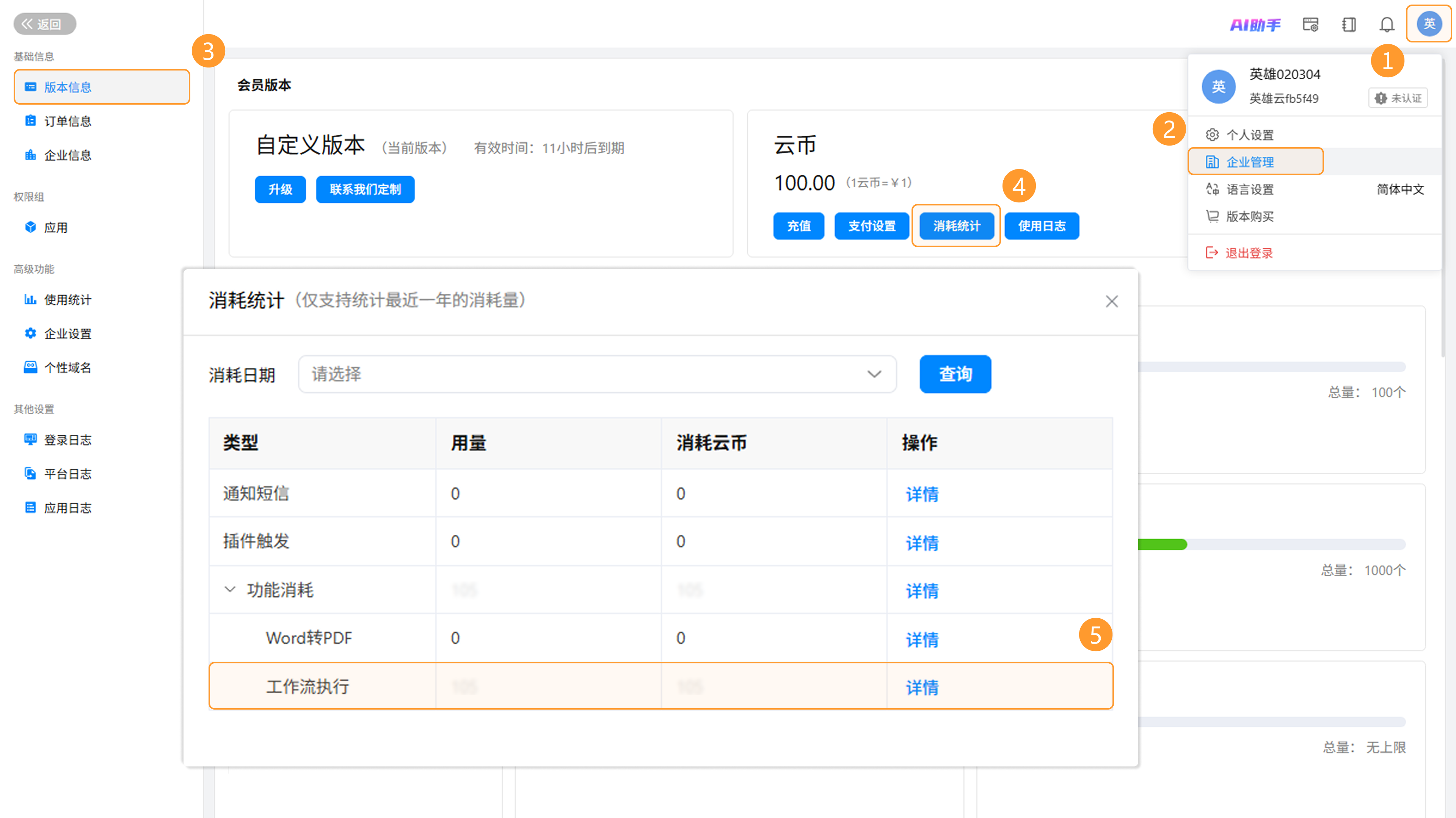 消耗日志查看入口:个人头像 >> 企业管理 >> 版本信息 >> 消耗统计