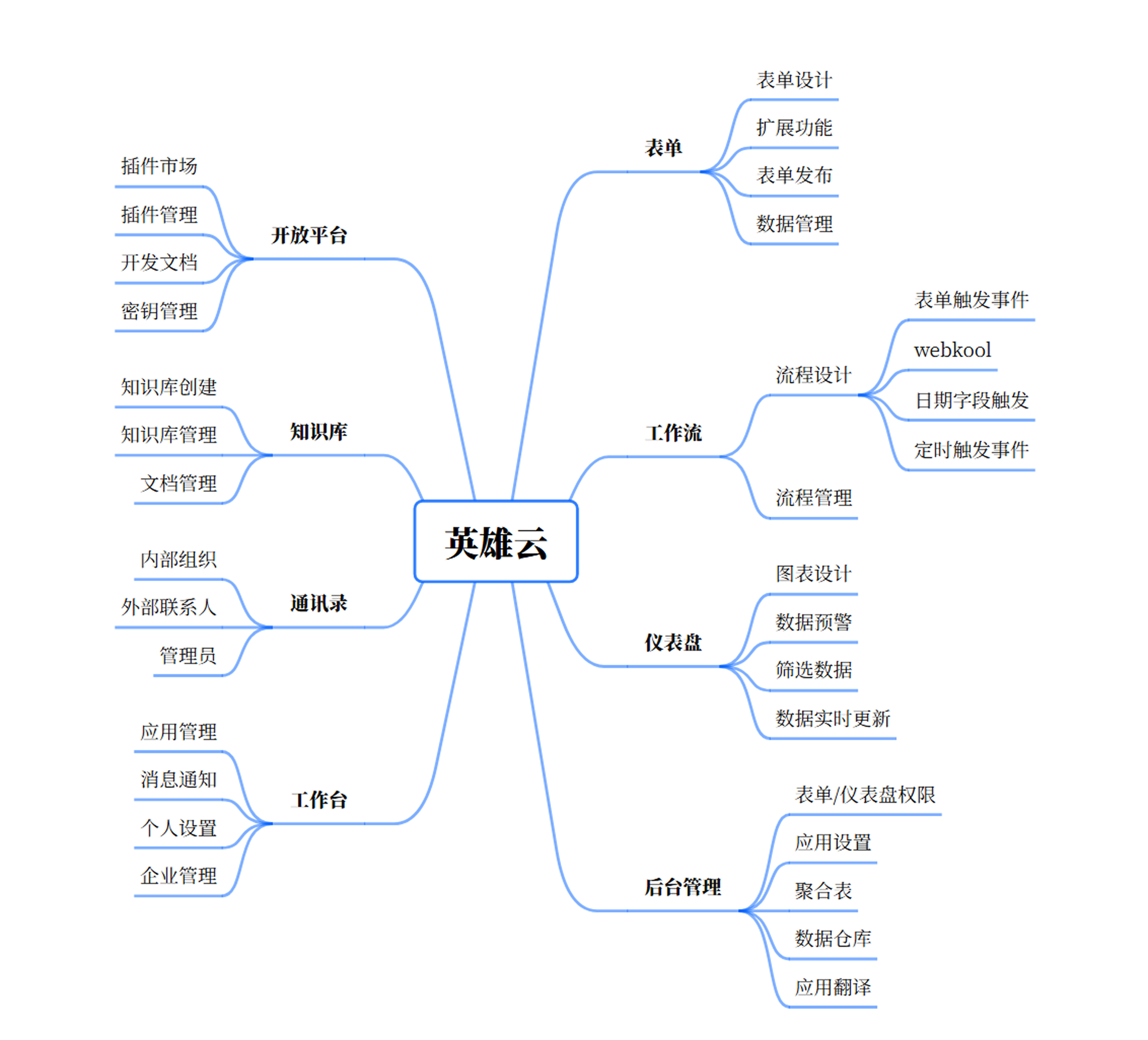 英雄云平台的基石在于其强大的应用功能,这些应用由表单、仪表盘和工作流三大核心板块构成,三者协同工作,构建出一个高效运转的系统。通过这个系统,企业能够轻松实现各类业务操作与精细化的企业管理。此外,平台还配备了工作台、知识库、通讯录、聚合表、插件等辅助功能,以全面满足企业多元化的管理需求,助力企业实现更加高效、智能的运营。平台的功能结构如下: