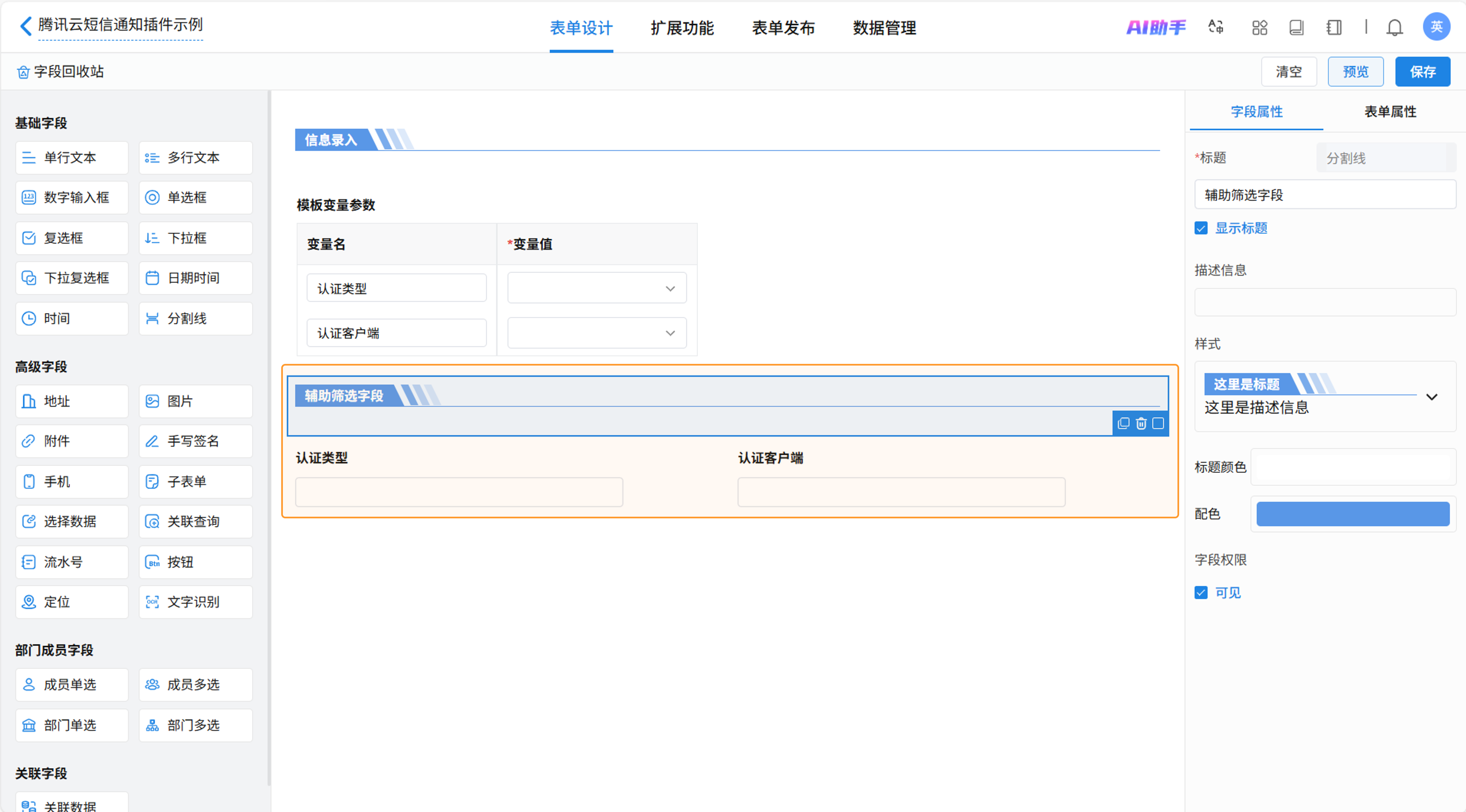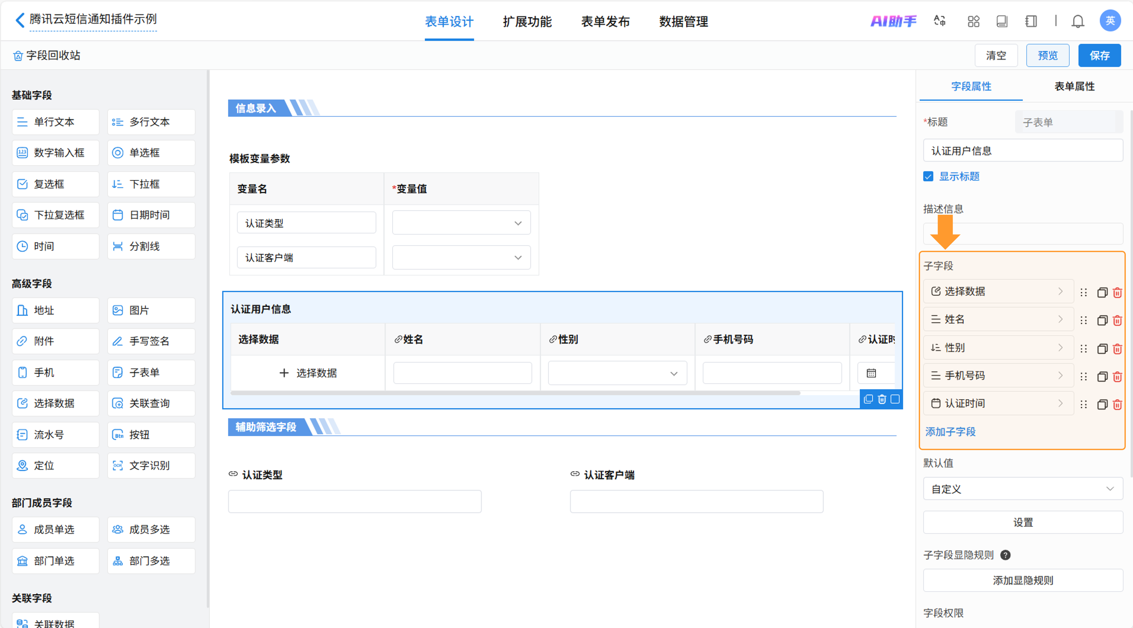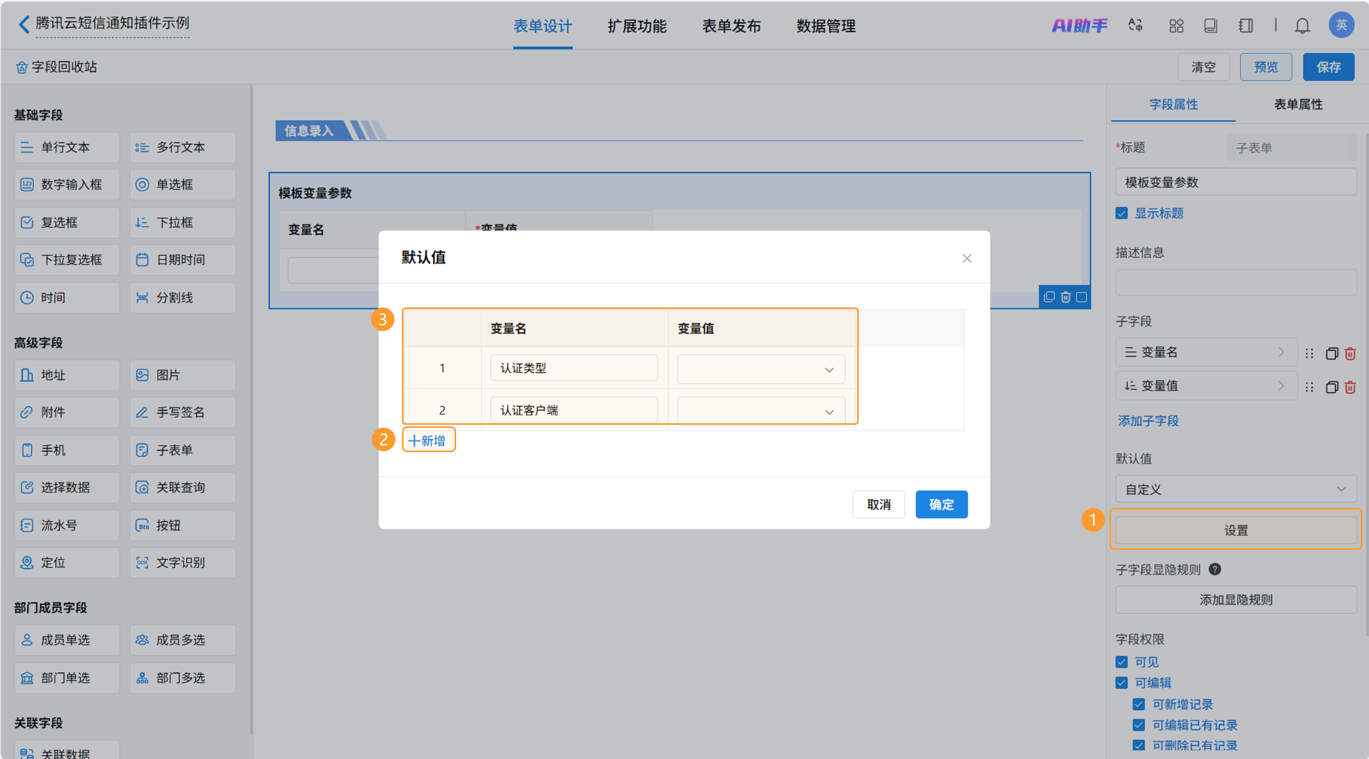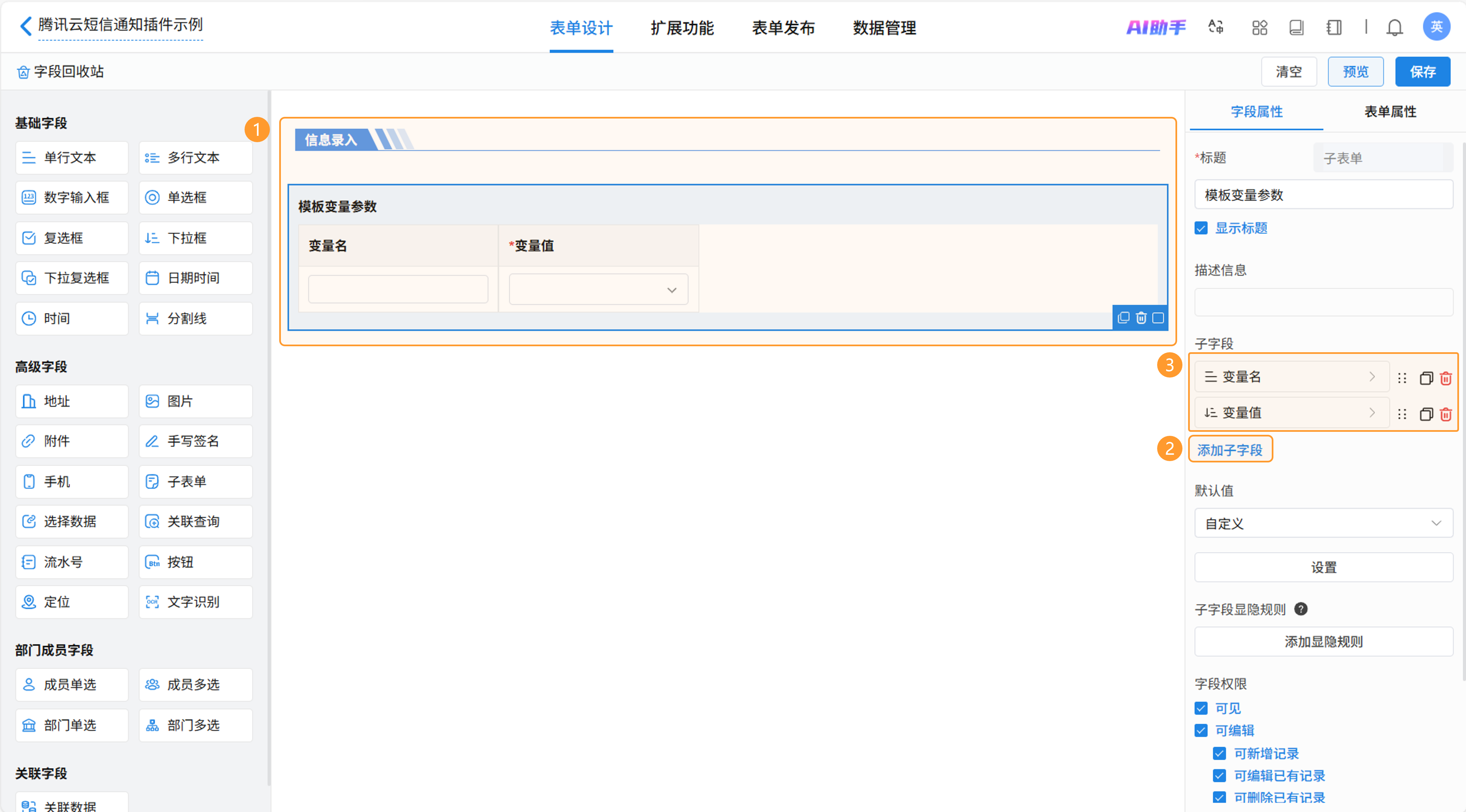 新建表单【腾讯云短信通知插件示例】用于发送短信。添加子表单用于放置短信变量值,子表单命名为“模板变量参数”,在子表单中加入“变量名”和“变量值”两个字段。