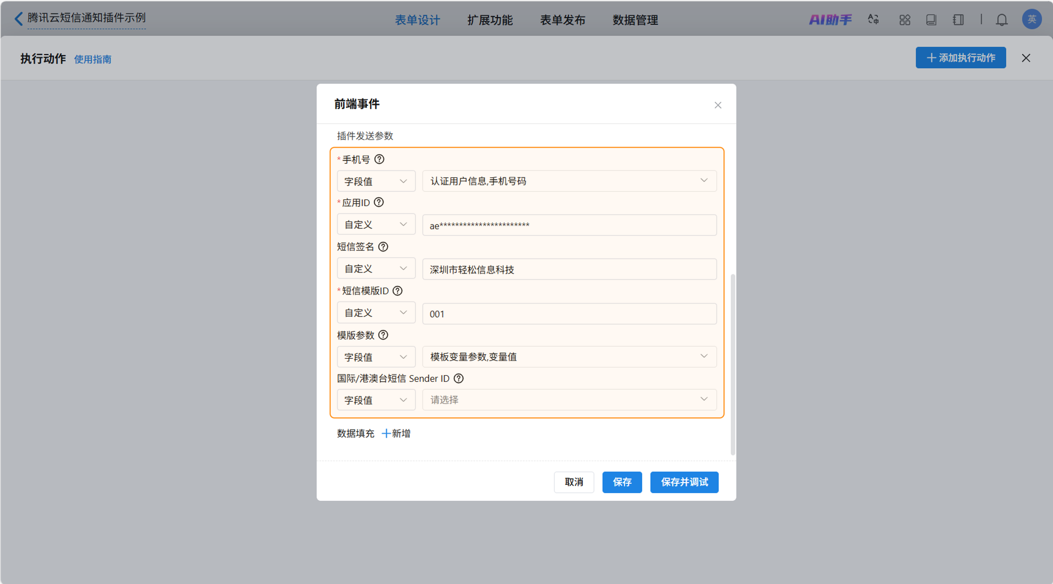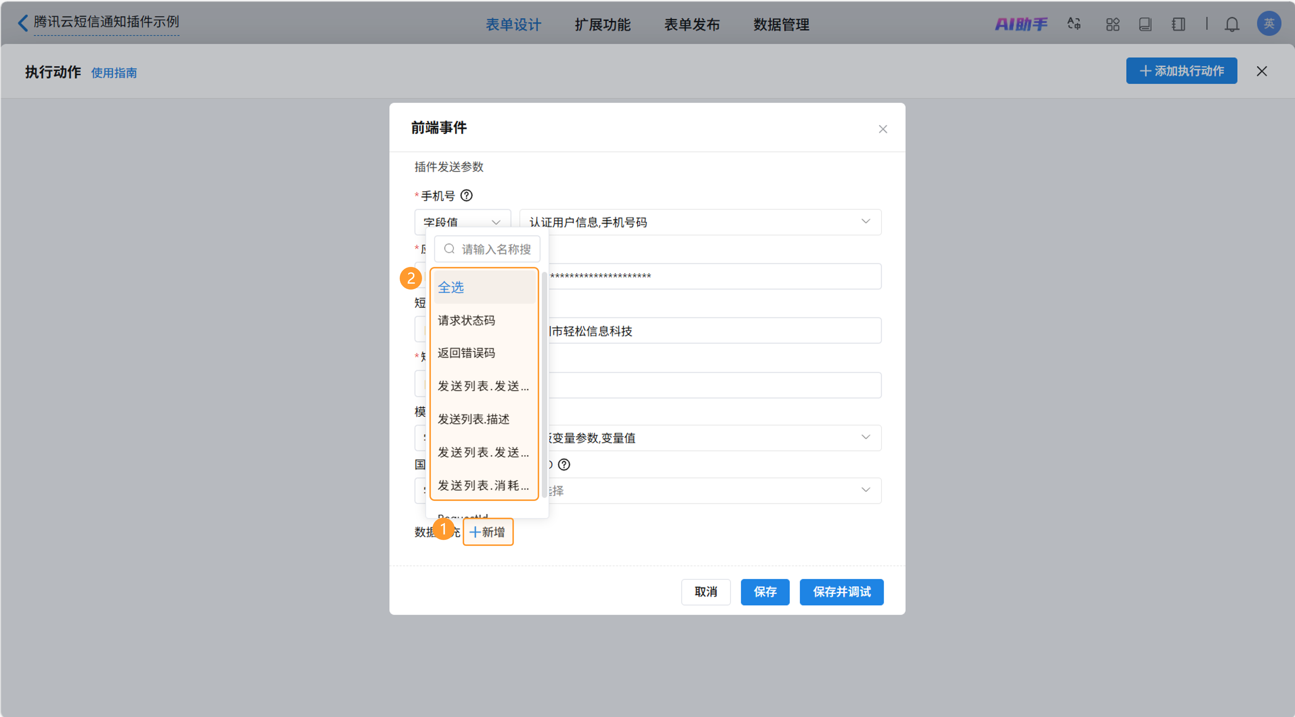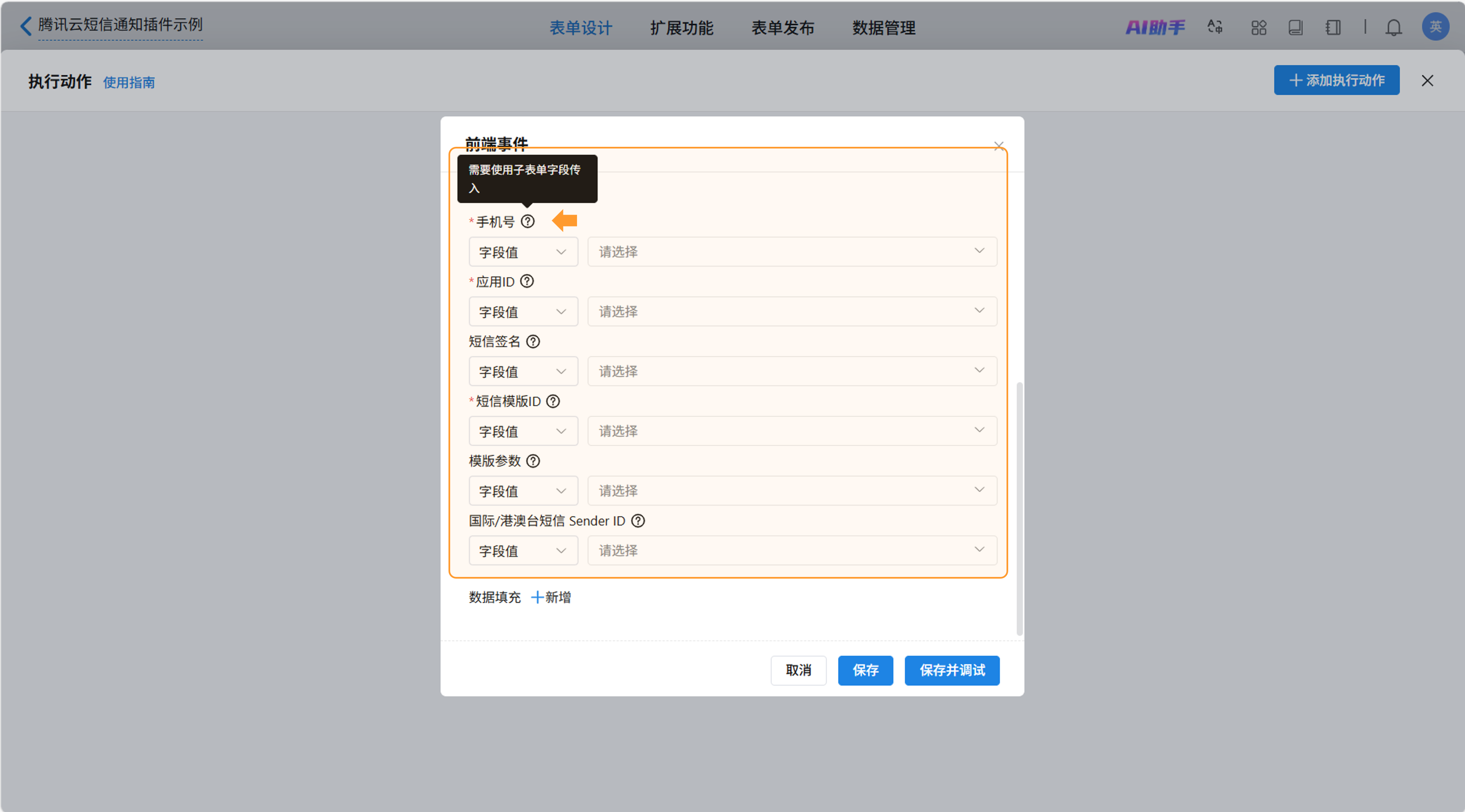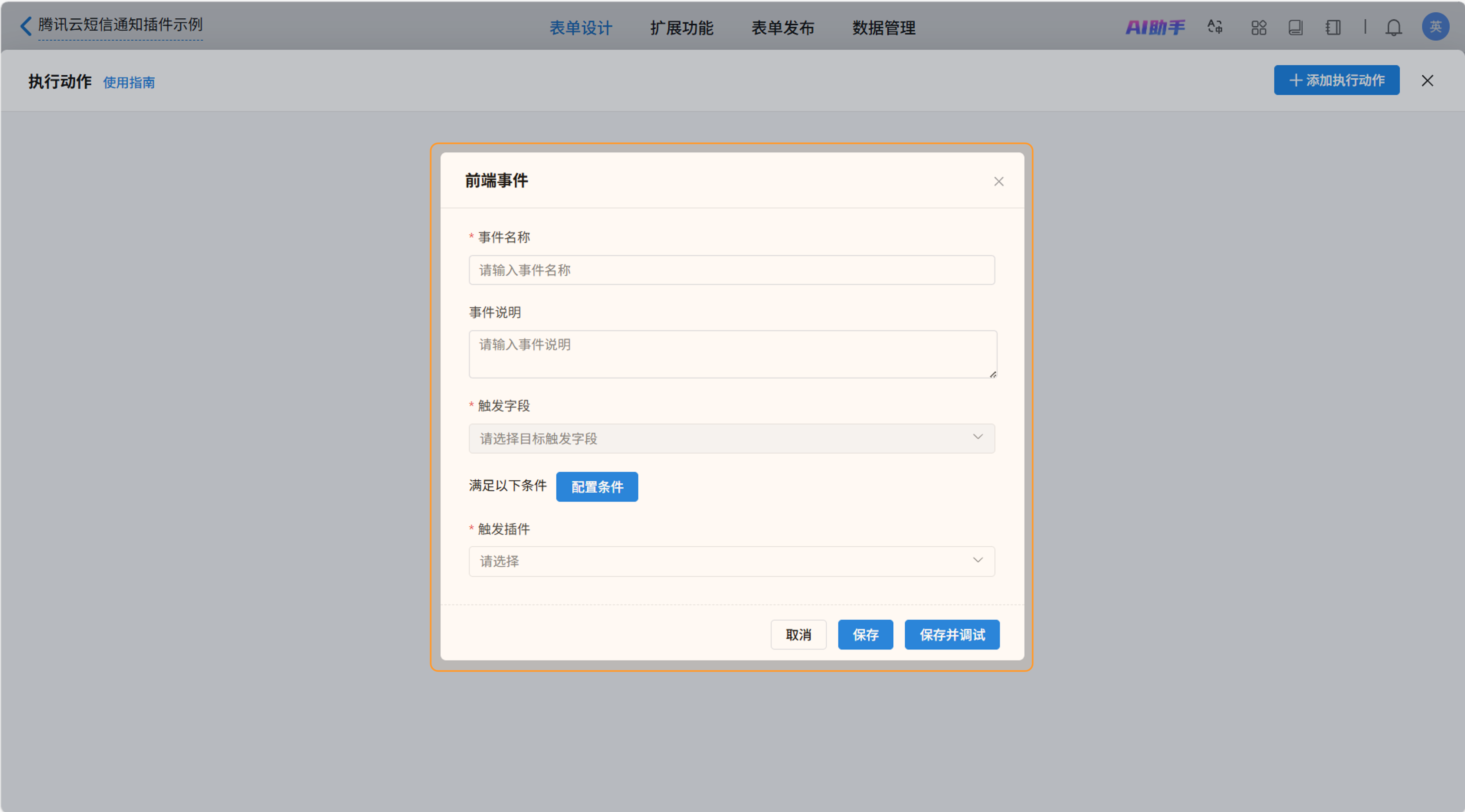 触发插件就是当前前端事件需要使用的插件。此处选择“腾讯云短信通知”。