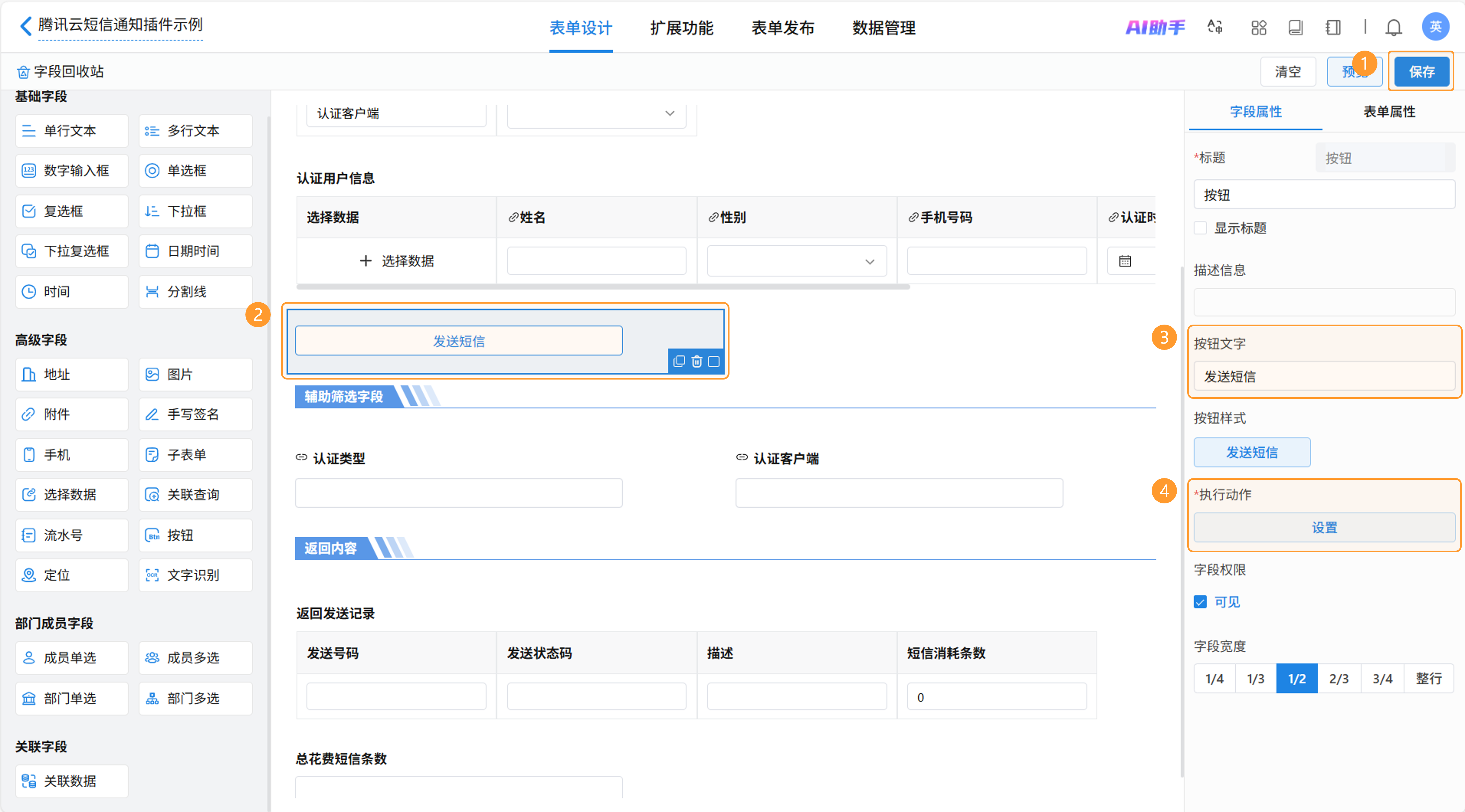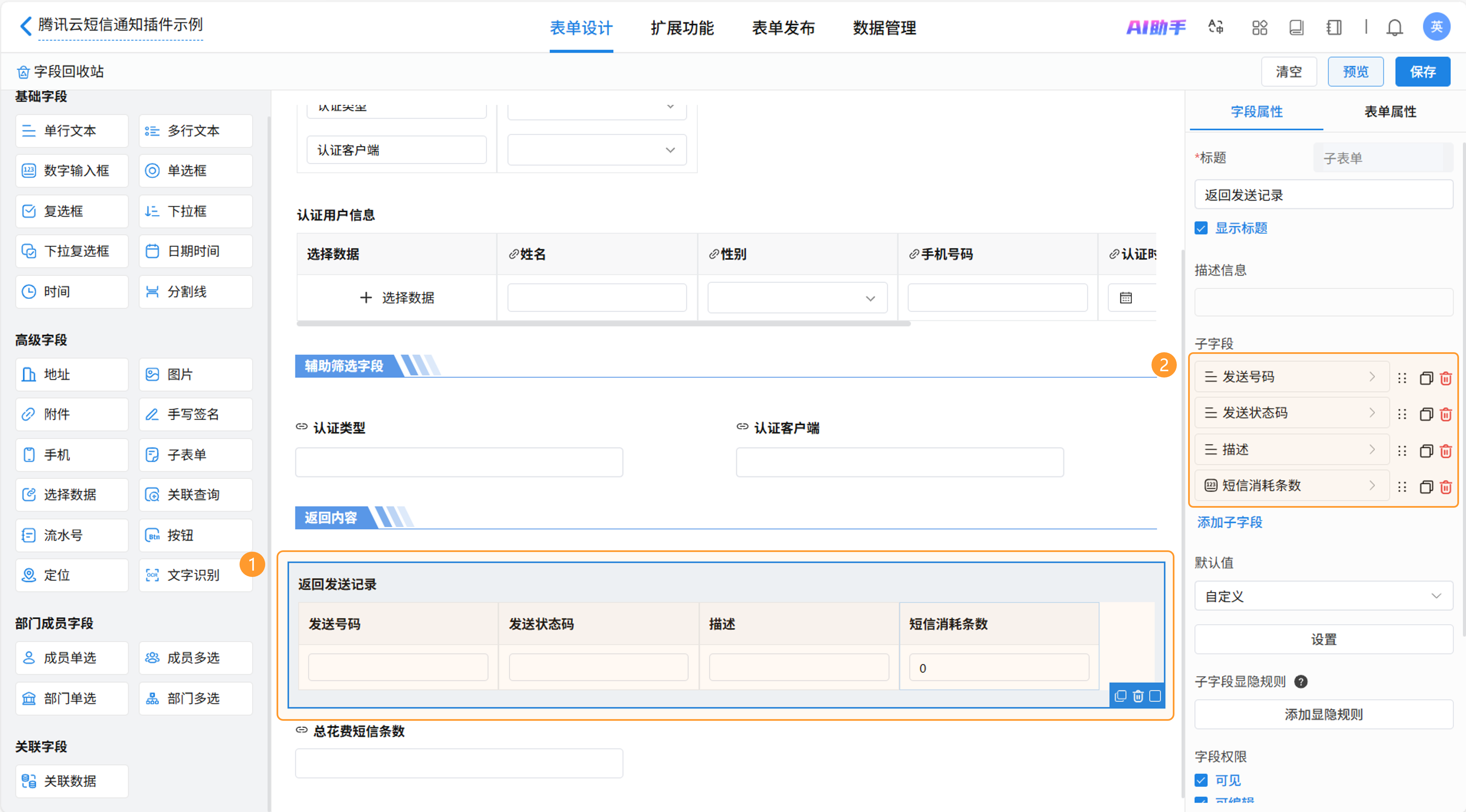 新增子表单用于记录返回的短信发送详细记录,需要在该表单中增加“发送号码”、“发送状态码”、“描述”、“短信消耗条数”。其中“短信消耗条数”用于计算发送消耗的总短信条数,因此需要以数字输入框类型字段,并设置默认值为0。其他使用单行文本类字段即可。