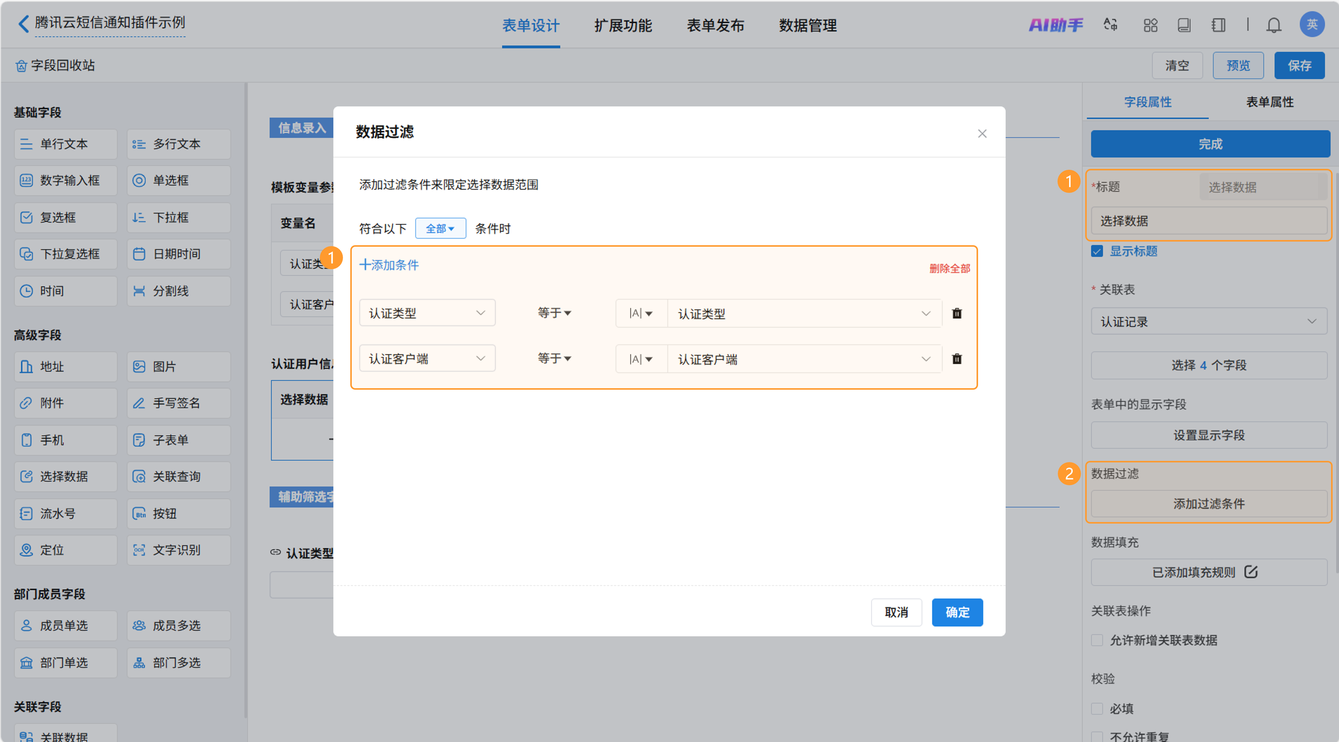针对“认证类型”和“认证客户端”分别新增单行文本字段用于对认证记录进行筛选,并使用公式拿取子表单中的对应值。筛选字段为辅助字段,可设置为不可见。