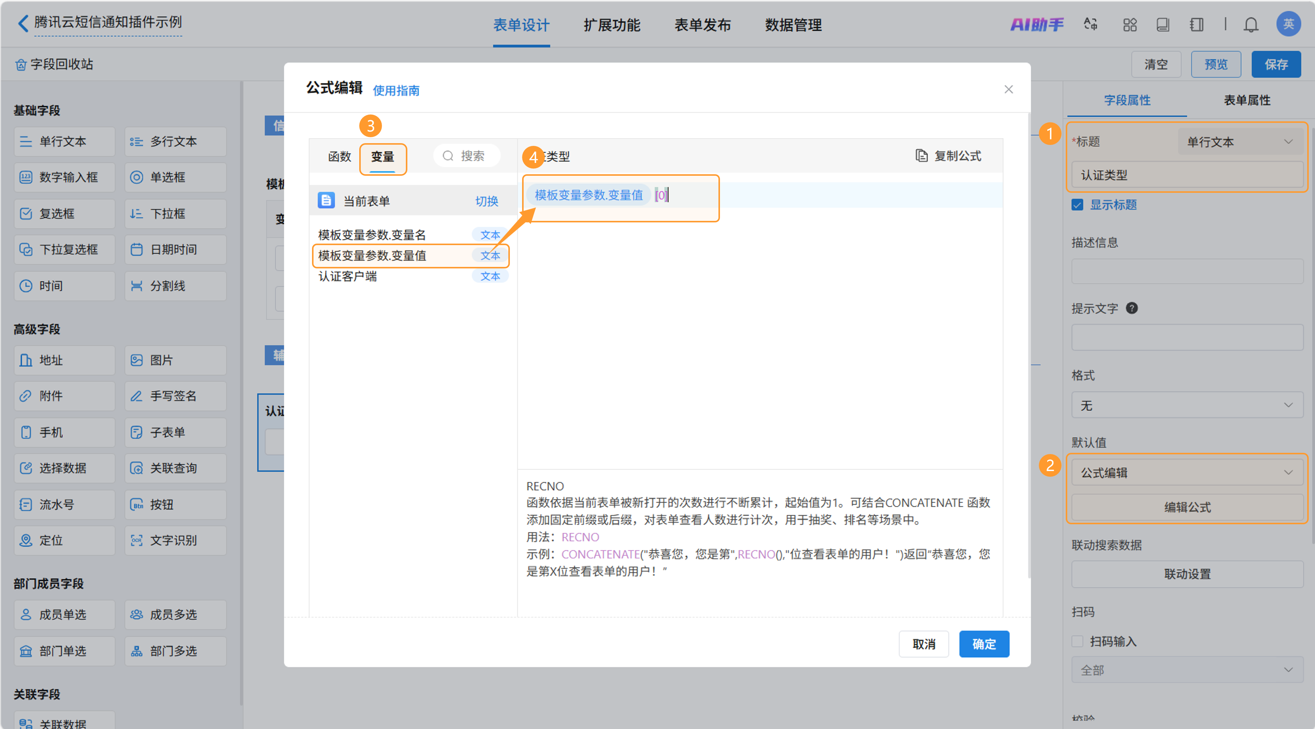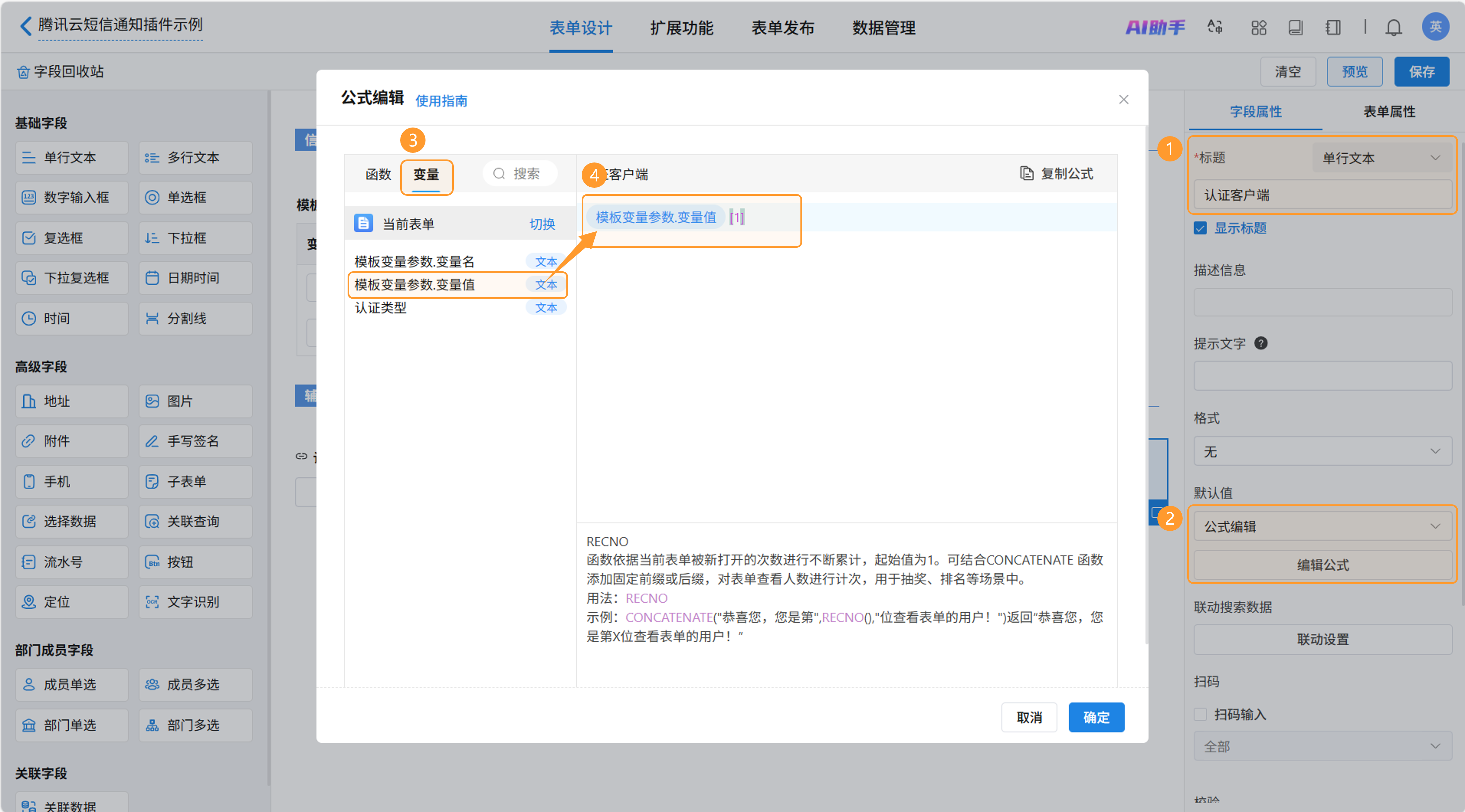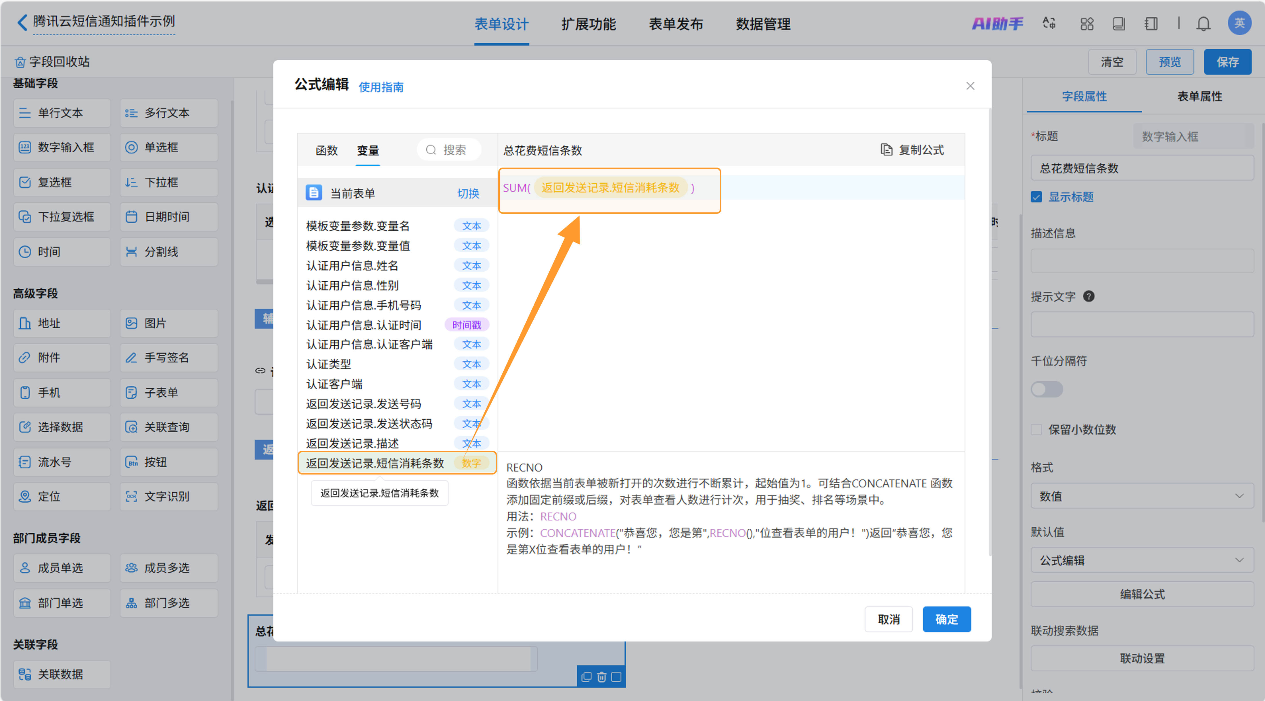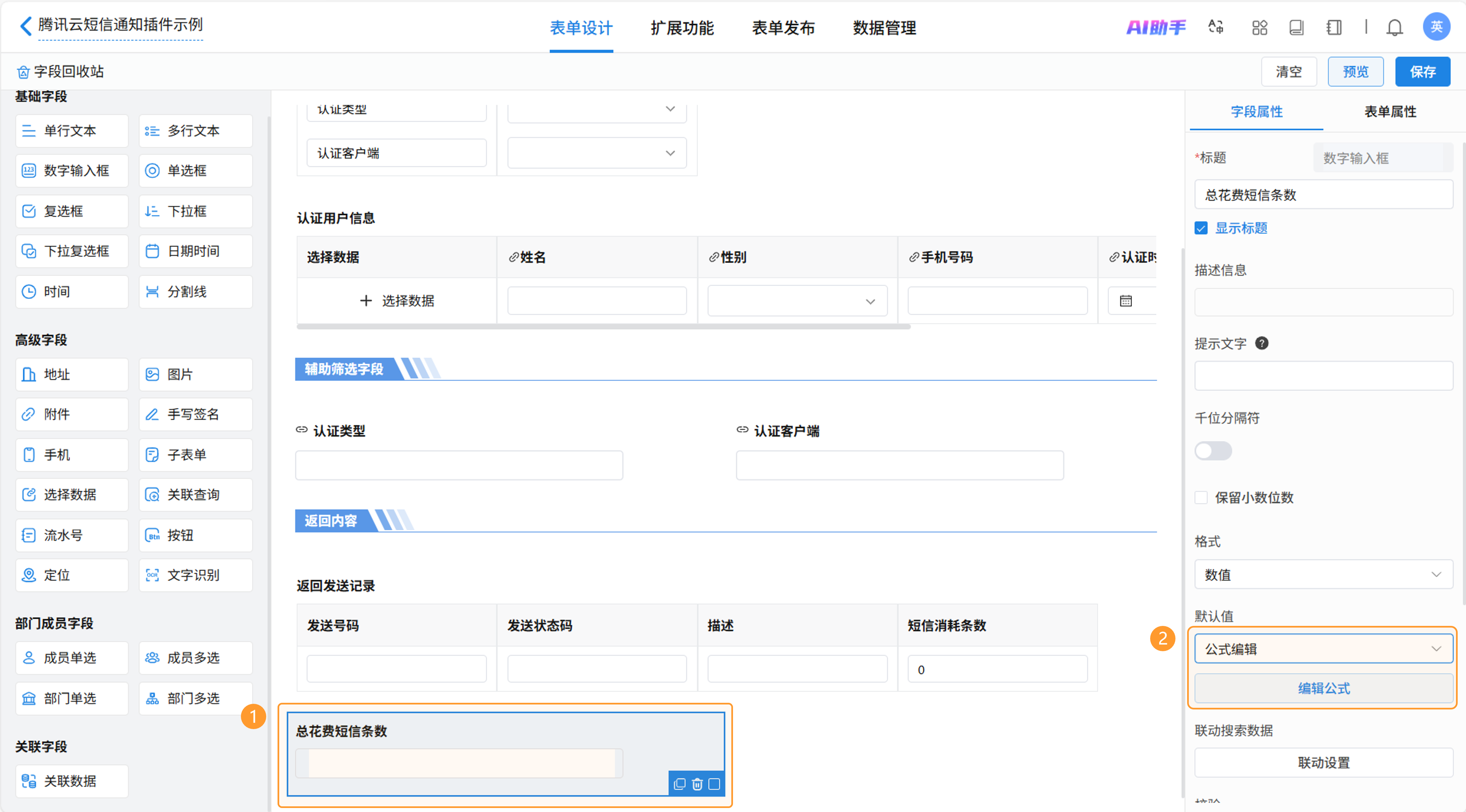 新增数字输入框字段“总花费短信条数”用于计算本次群发消耗的腾讯云平台短信总条数。设置默认值为公式编辑,打开编辑公式窗口。