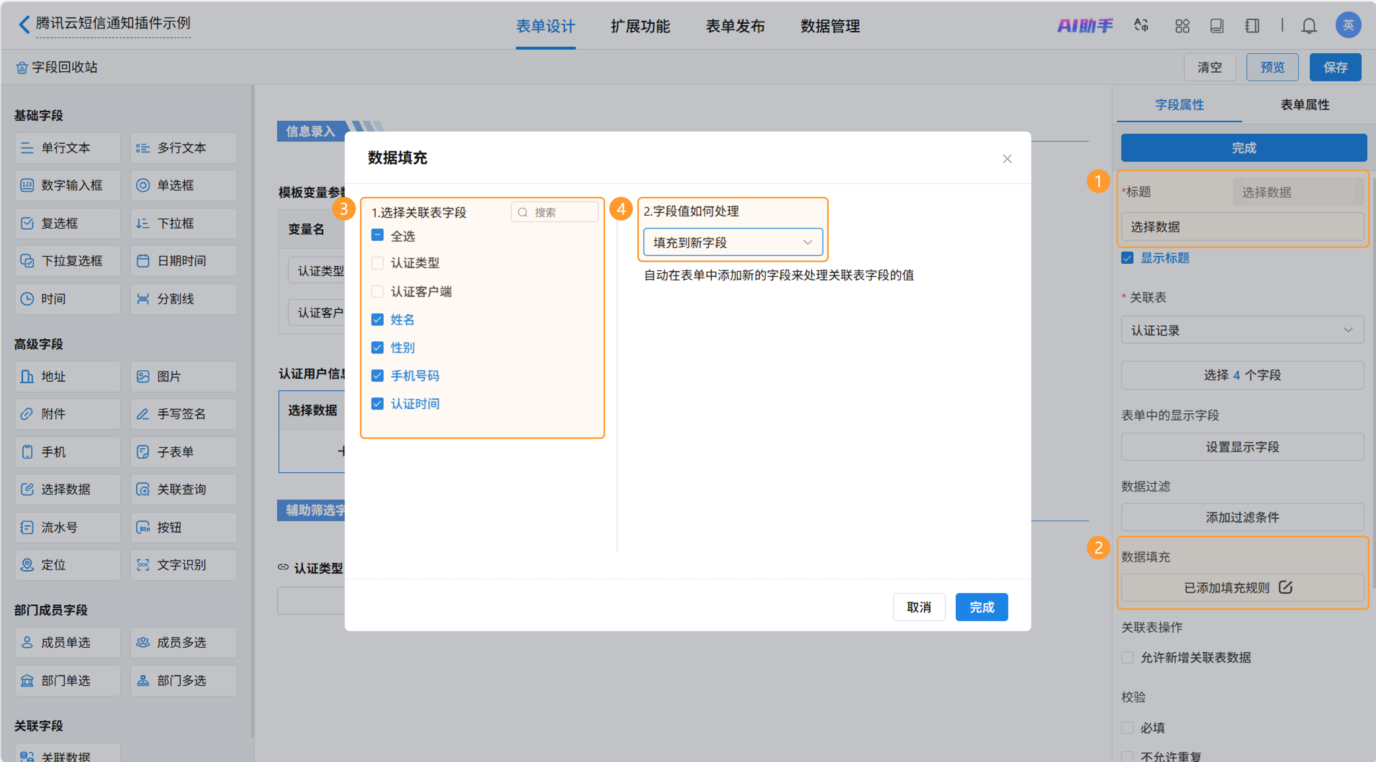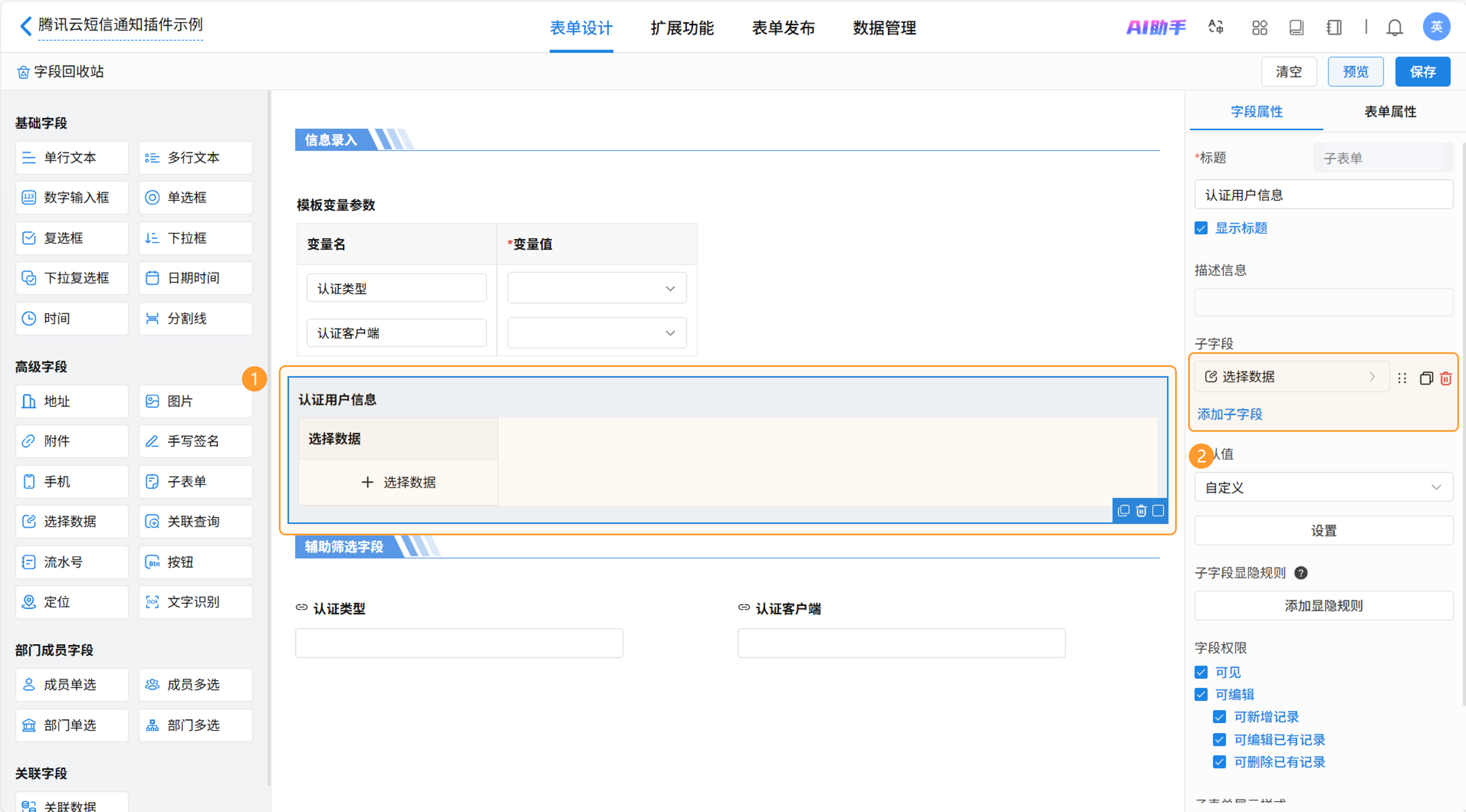 新增子表单用于选择认证记录,并加入选择数据子字段。