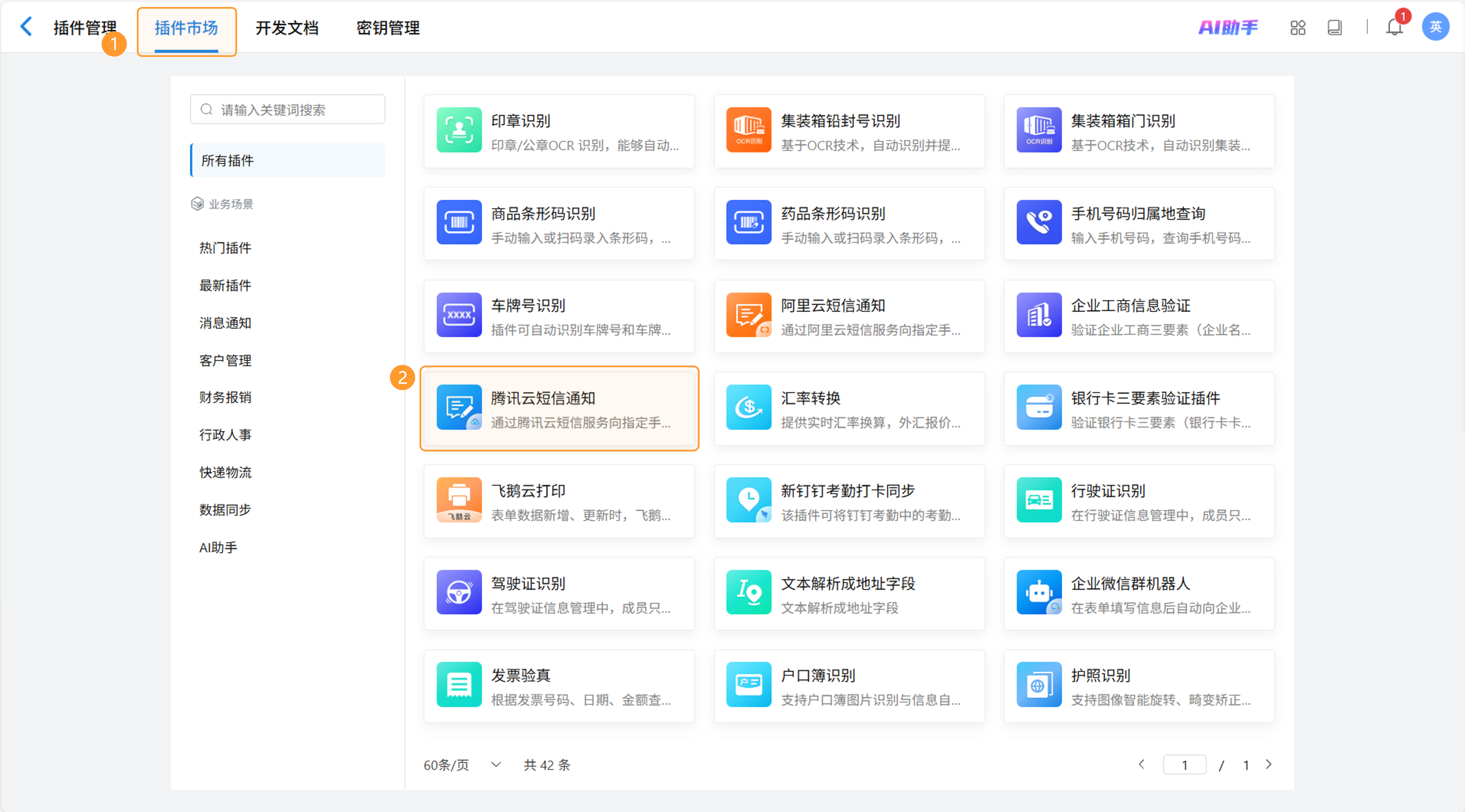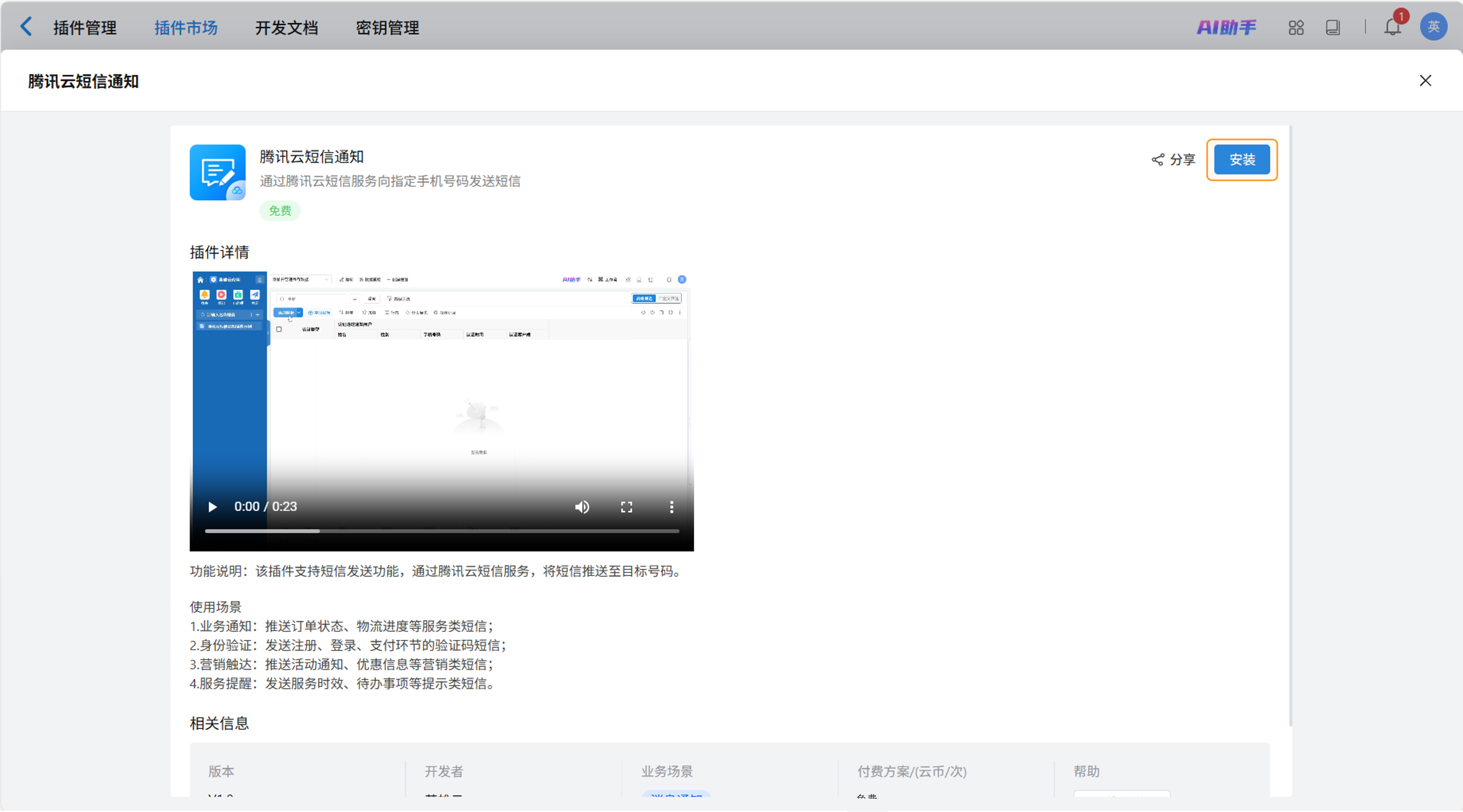 点击“插件市场”,选择“腾讯云-短信通知”,进入插件详情页。
