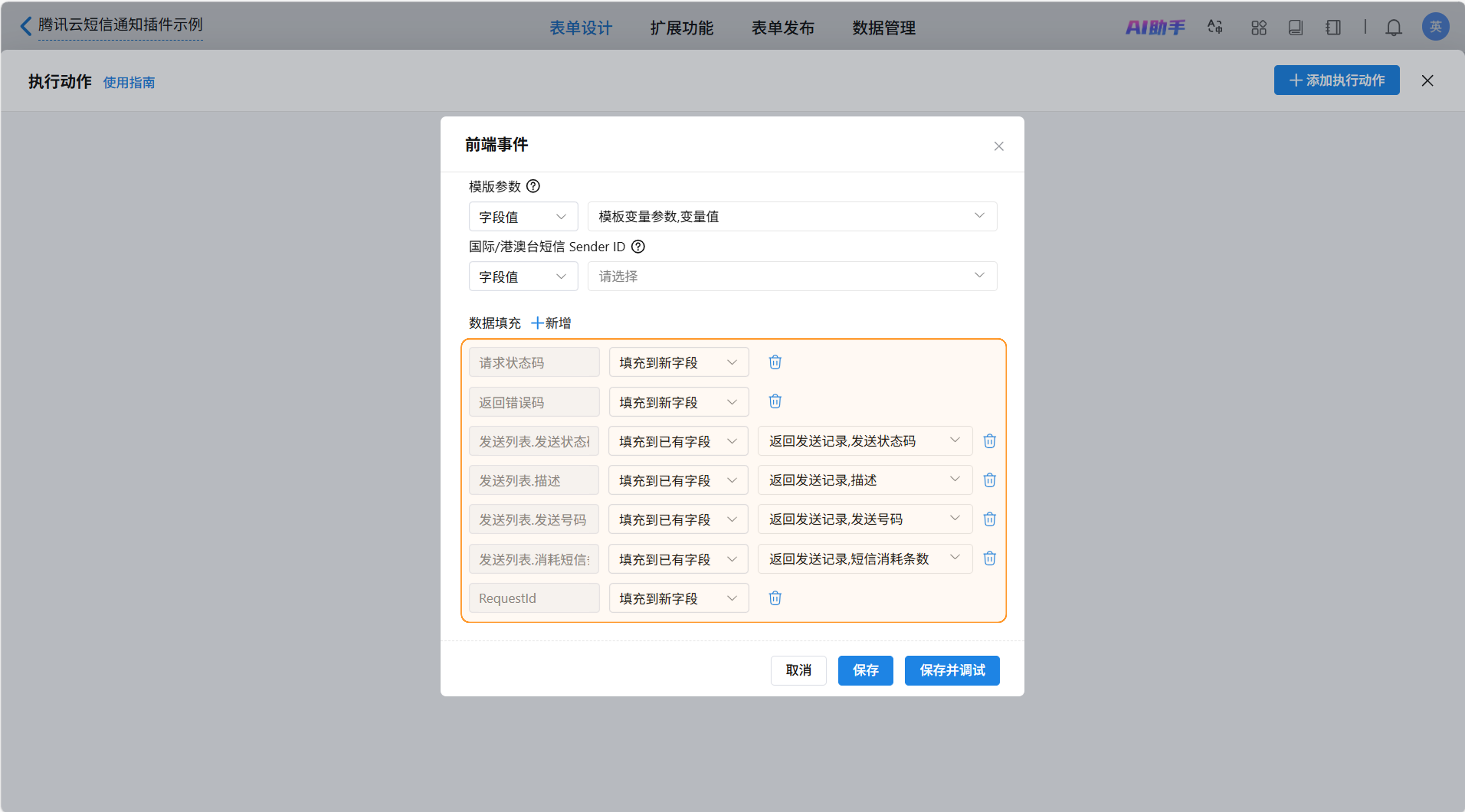 选择好所需要的返回信息之后,对“请求状态码”、“返回错误码”、“RequestId”可以使用默认的“填充到新字段”选项,保存后表单会自动新增同名字段以存储返回信息,对“发送列表”的子表字段,则需要手动设置填充到“发送记录”中的子表单字段。