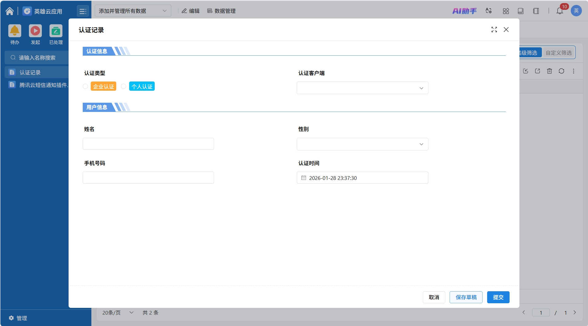 这里使用英雄云认证结果通知进行演示,使用一个认证记录表单放置用户认证信息。表单设计如下图所示: