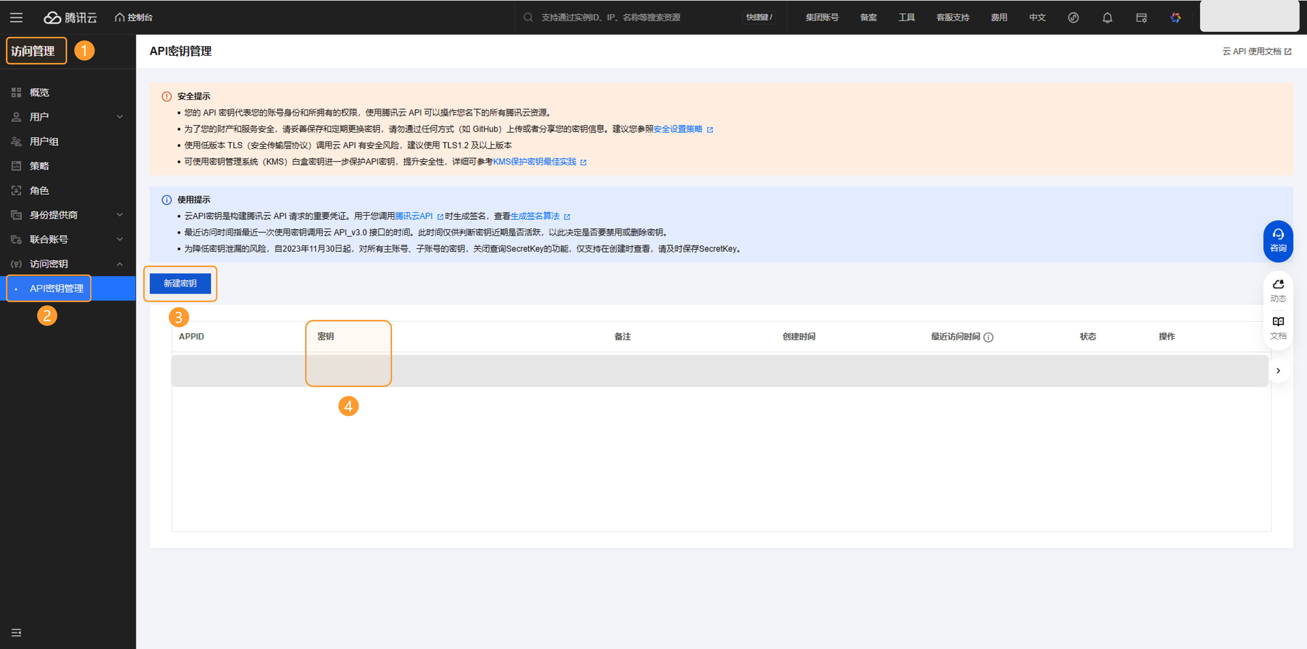 在“访问管理>>访问密钥>>API密钥管理”中新建密钥并保存SecretId 和 SecretKey。