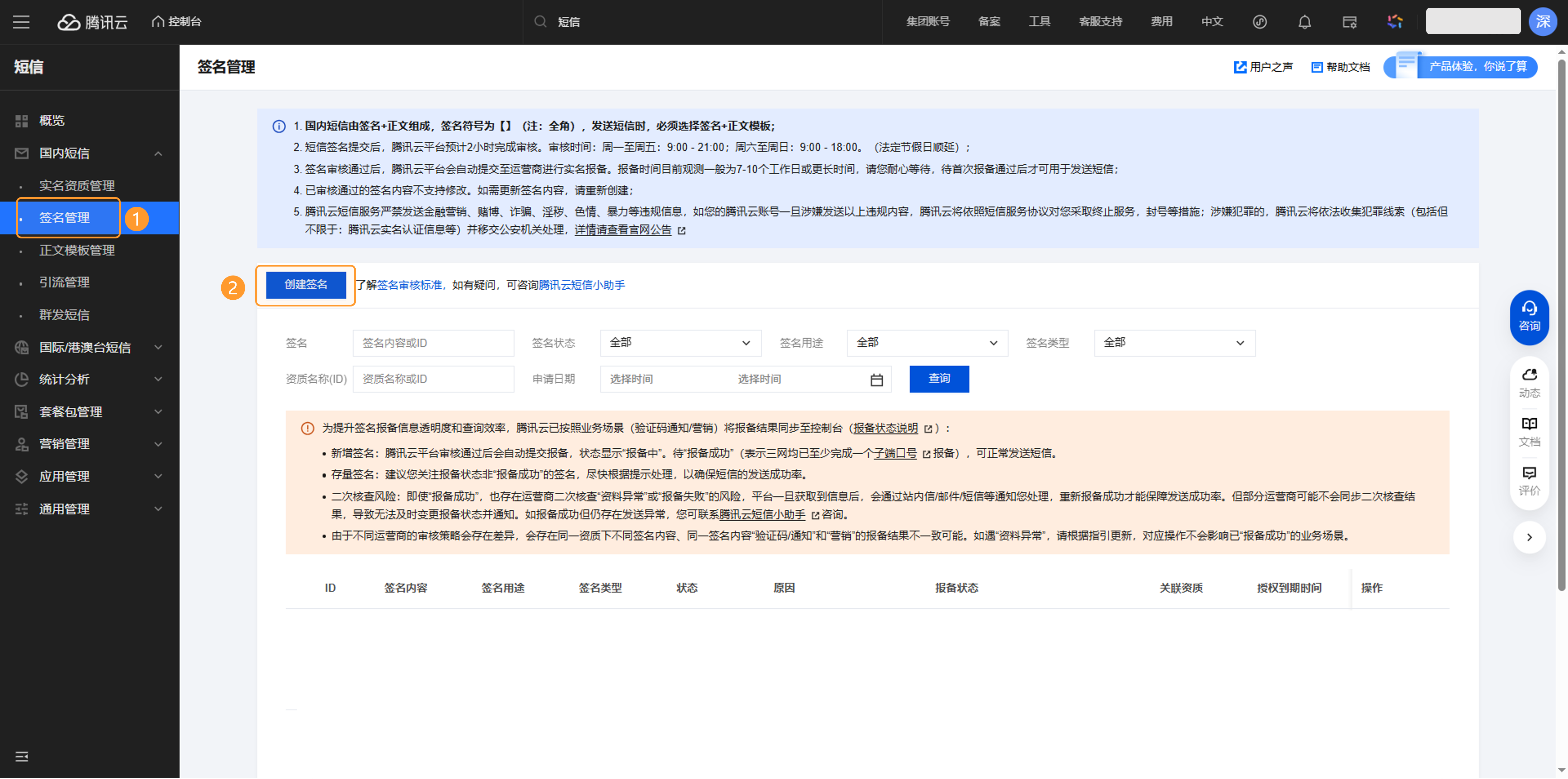 - “短信签名”指在腾讯云控制台创建的短信签名内容,可登录腾讯云控制台在“国内短信>>签名管理”列表中查看;