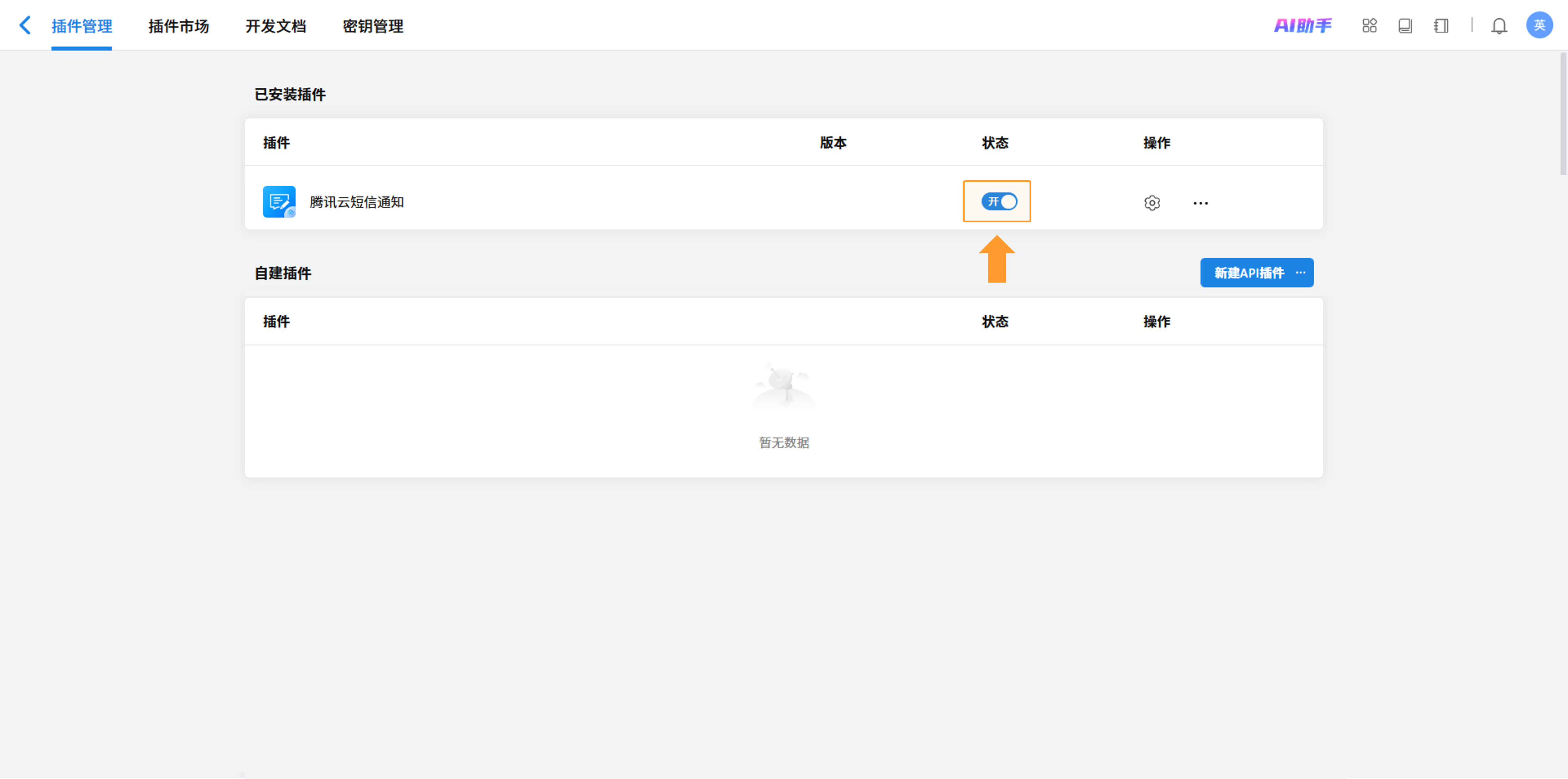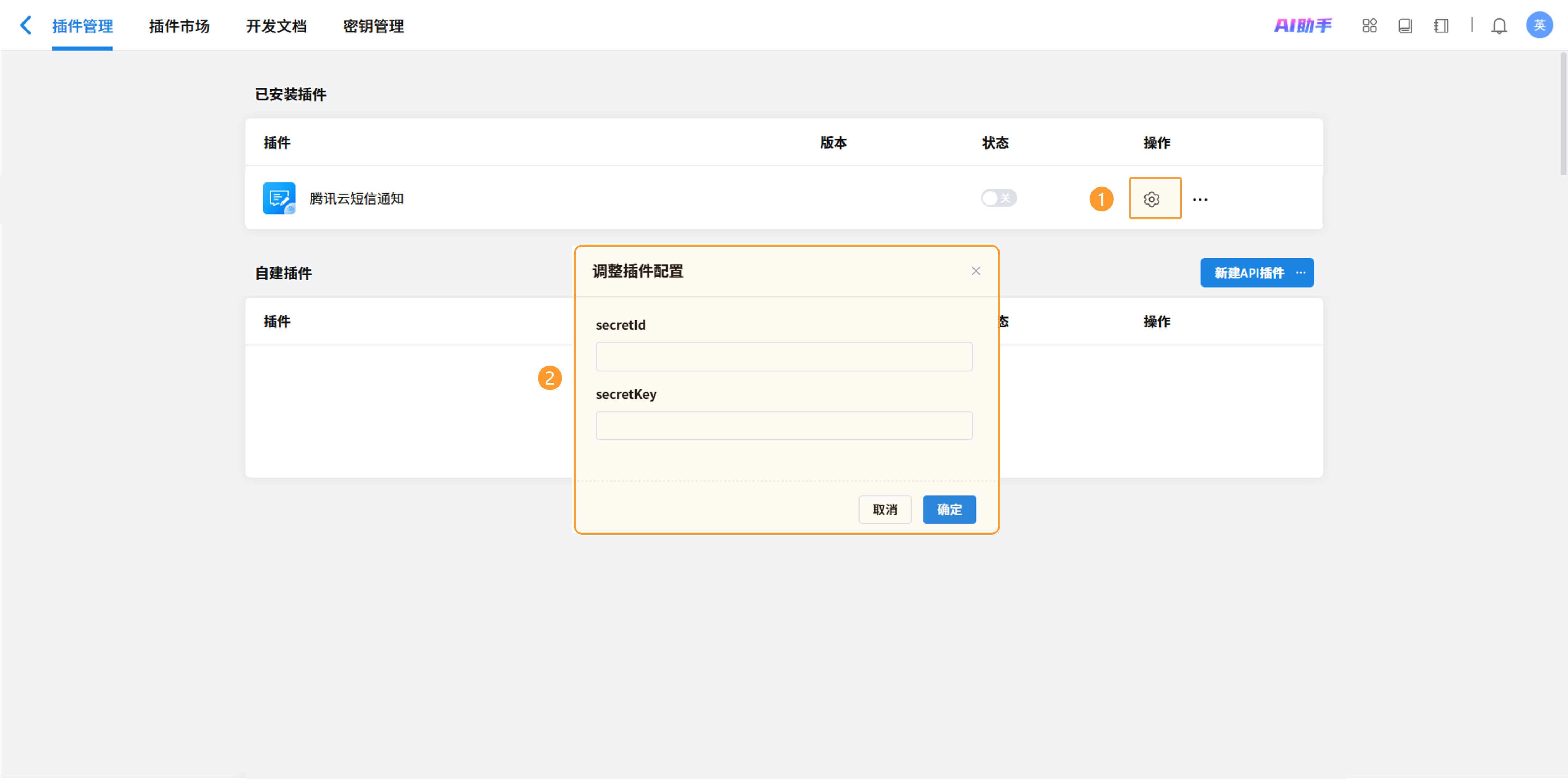 点击“插件管理”,在“已安装插件”中找到刚安装的插件。点击设置按钮,将2.2中获取的SecretId 和 SecretKey录入插件配置。