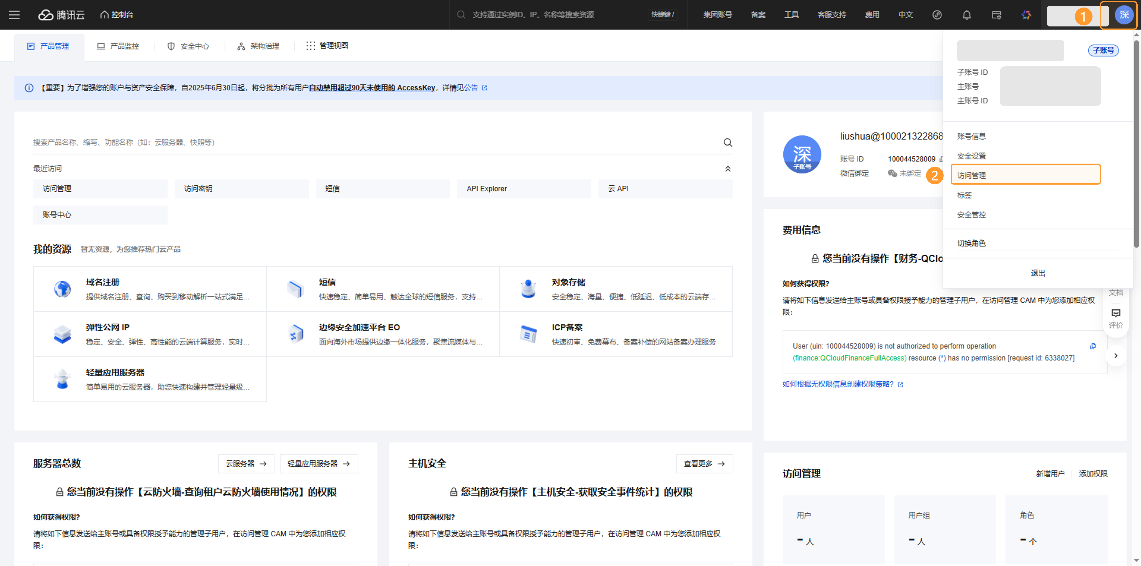 点击右上角头像框,在弹出框中点击并进入“访问管理”。