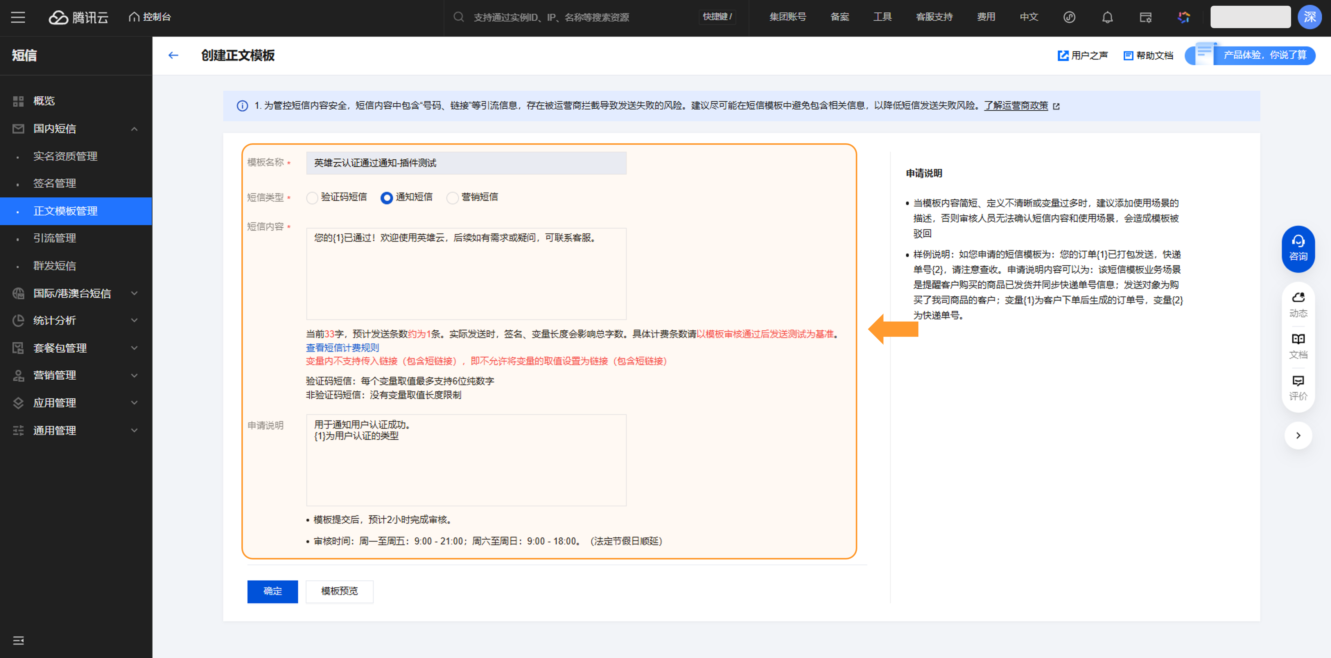 本文的案例是对用户成功认证结果的通知,案例的变量认证类型设置为{1},变量命名规则可参考腾讯云正文模版审核标准。