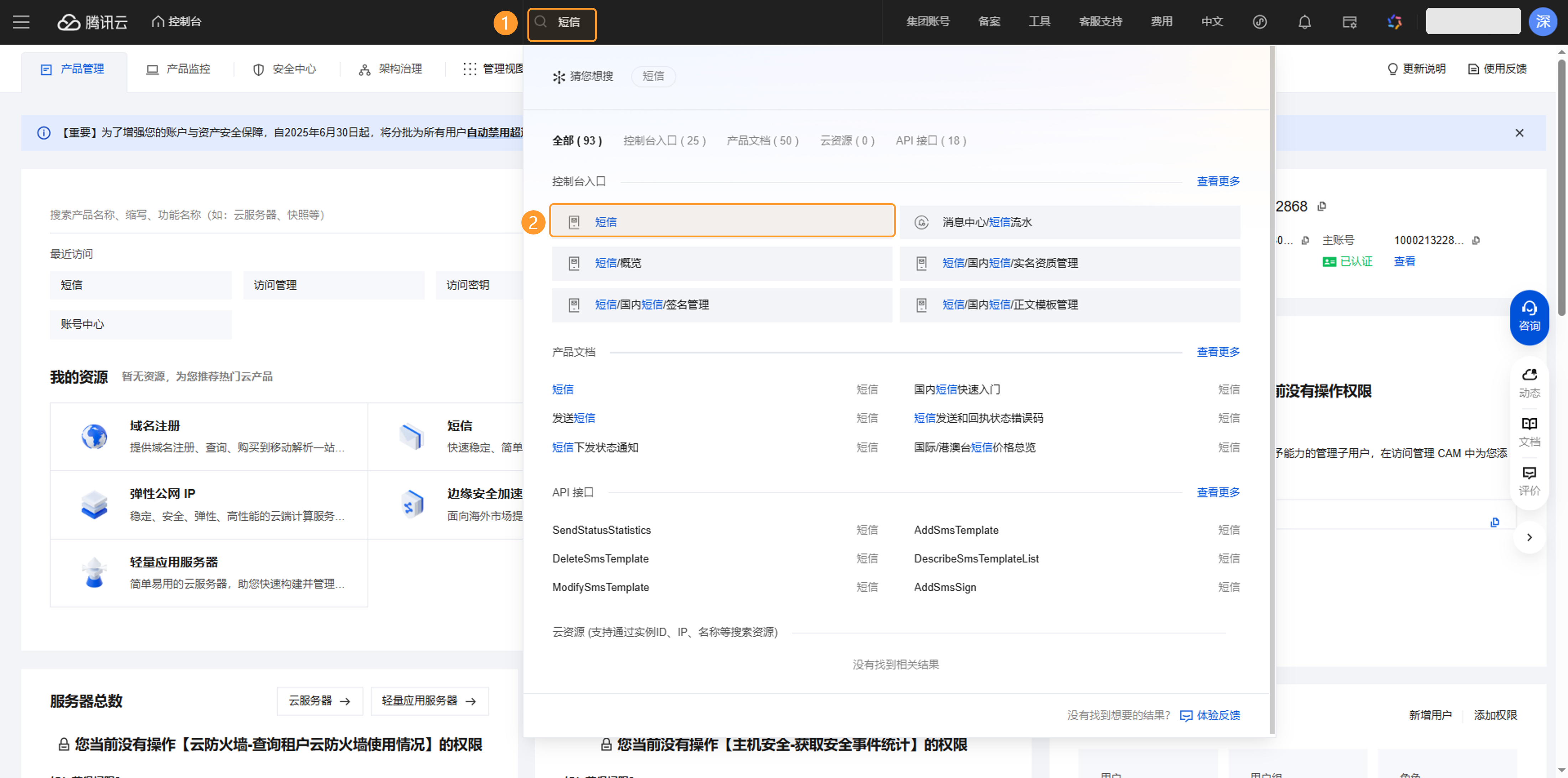 在“搜索栏”输入“短信”,点击并进入“短信”控制台入口。