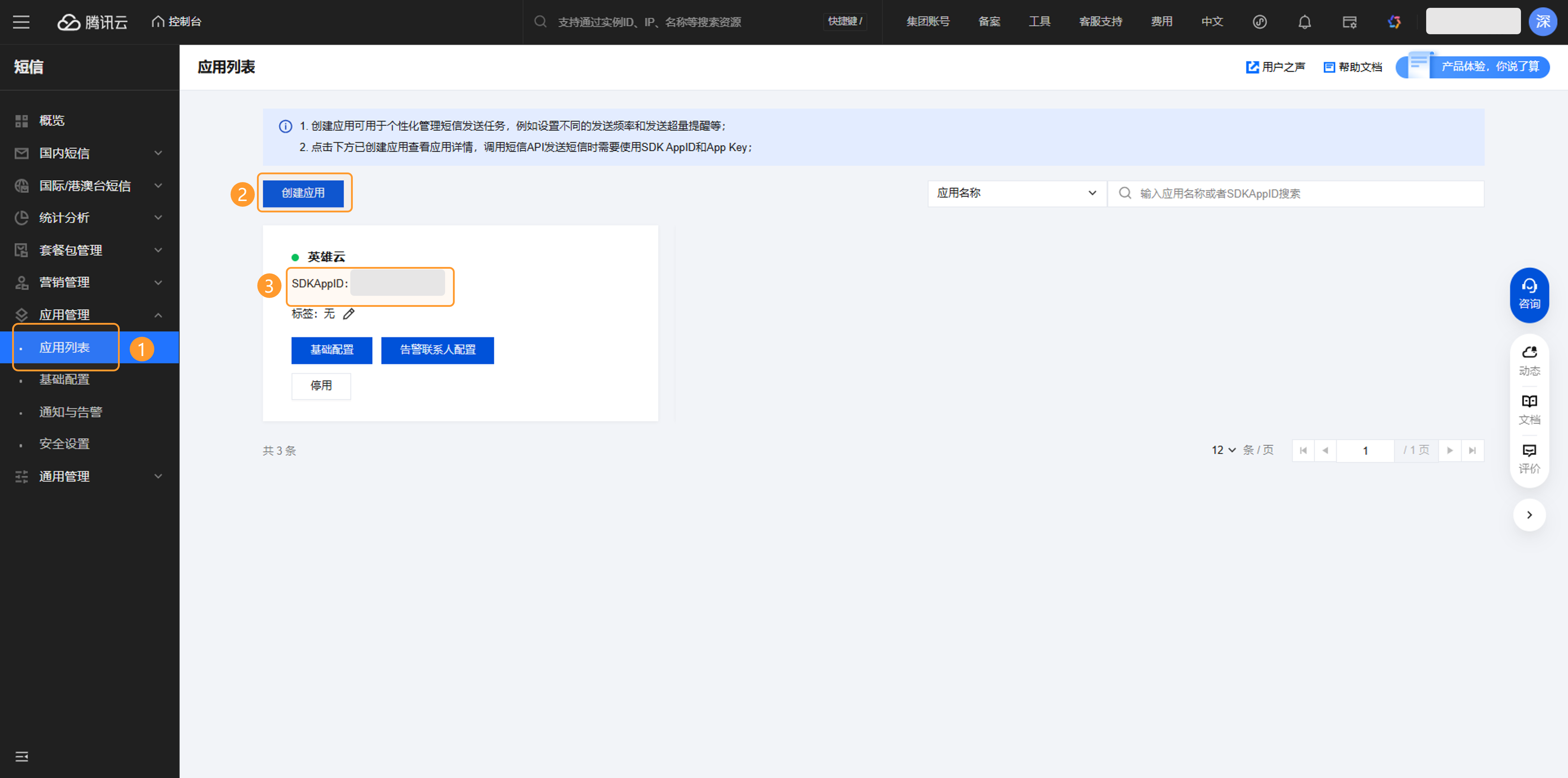 - “应用ID”指在腾讯云控制台“短信>>应用管理>>应用列表”中创建应用的【SDKAppID】,参考本文档2.3.4;