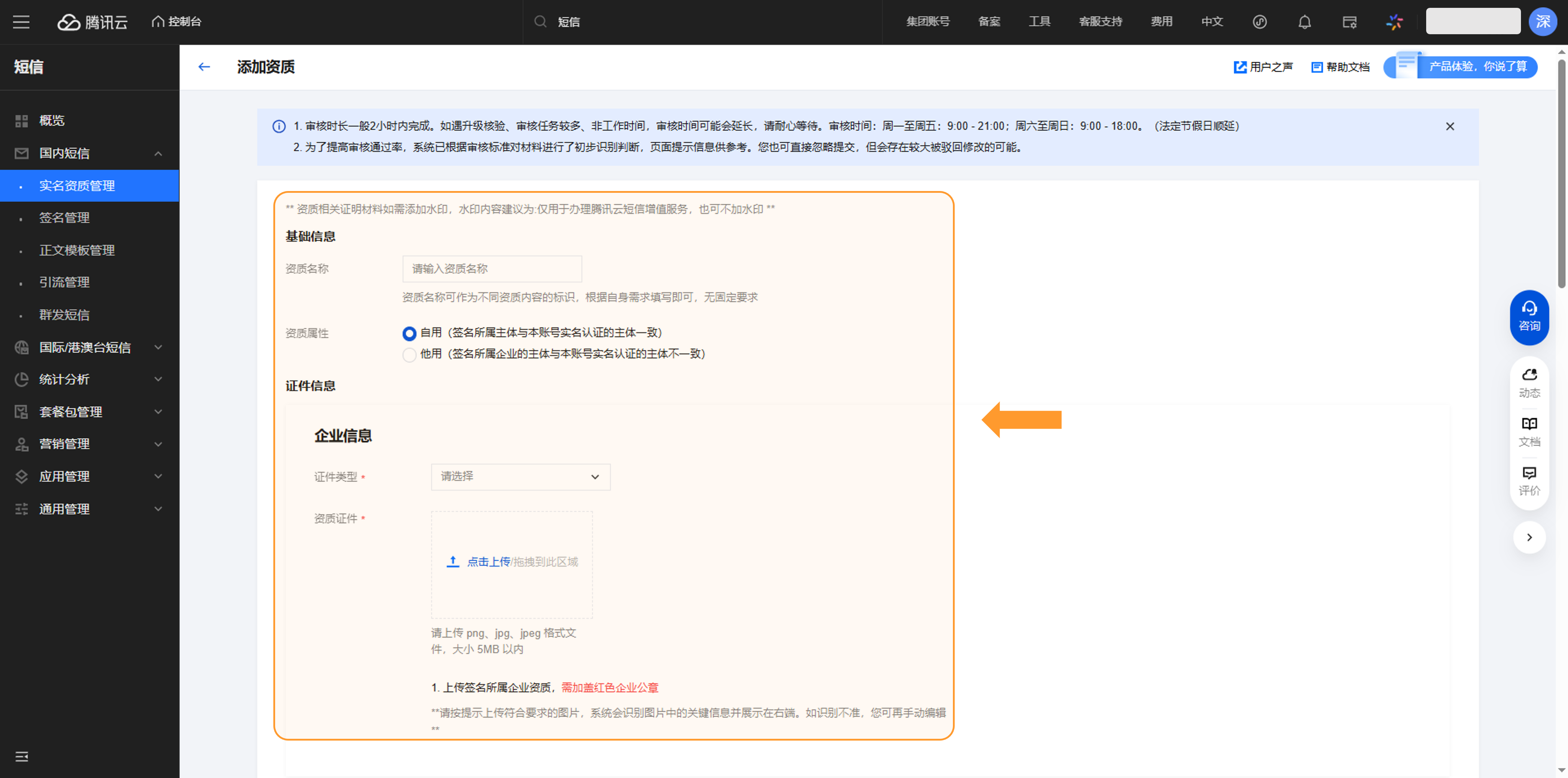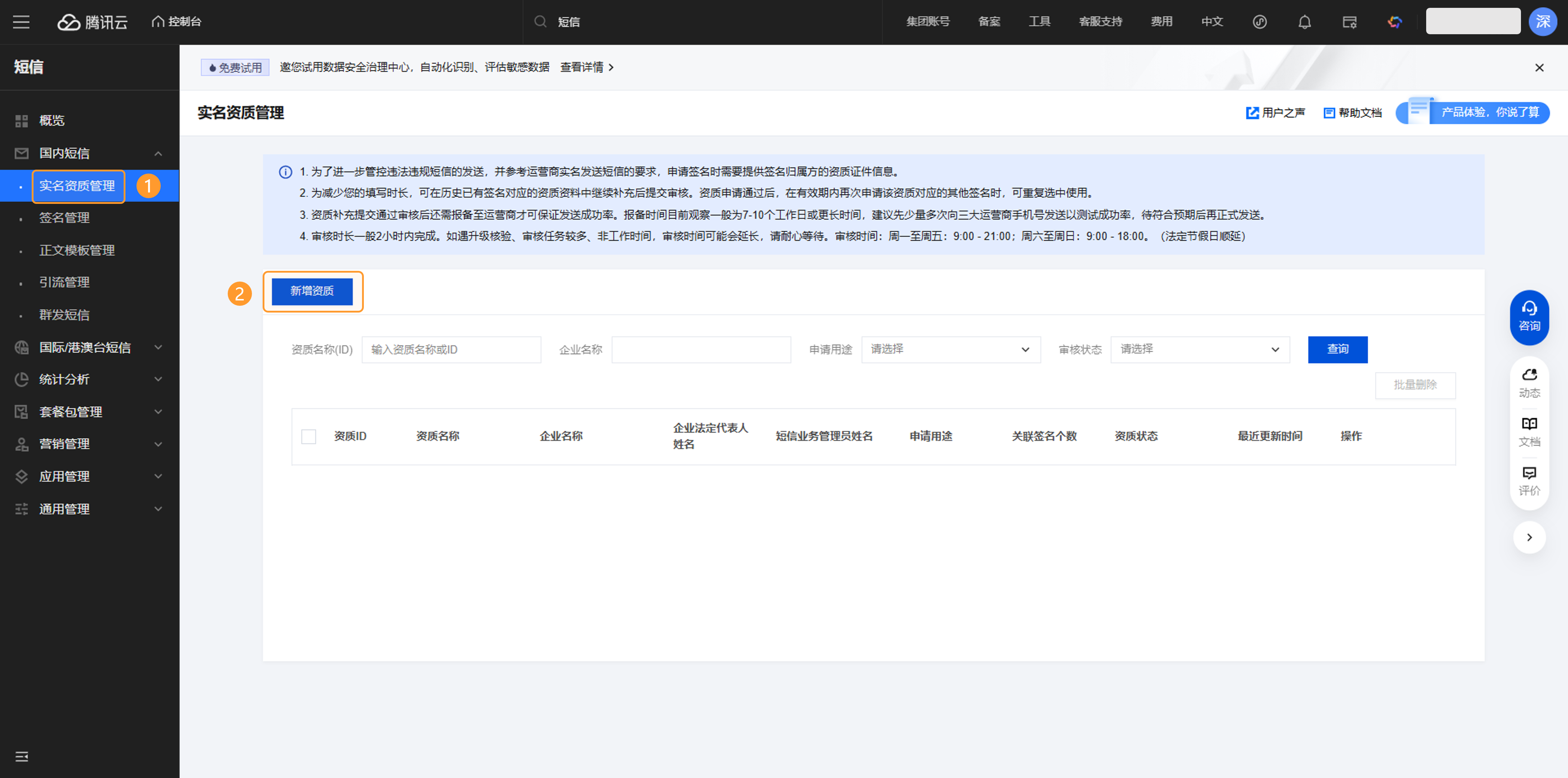 进入“国内短信>>实名资质管理>>新增资质”,根据企业自身信息填写内容并完成提交。