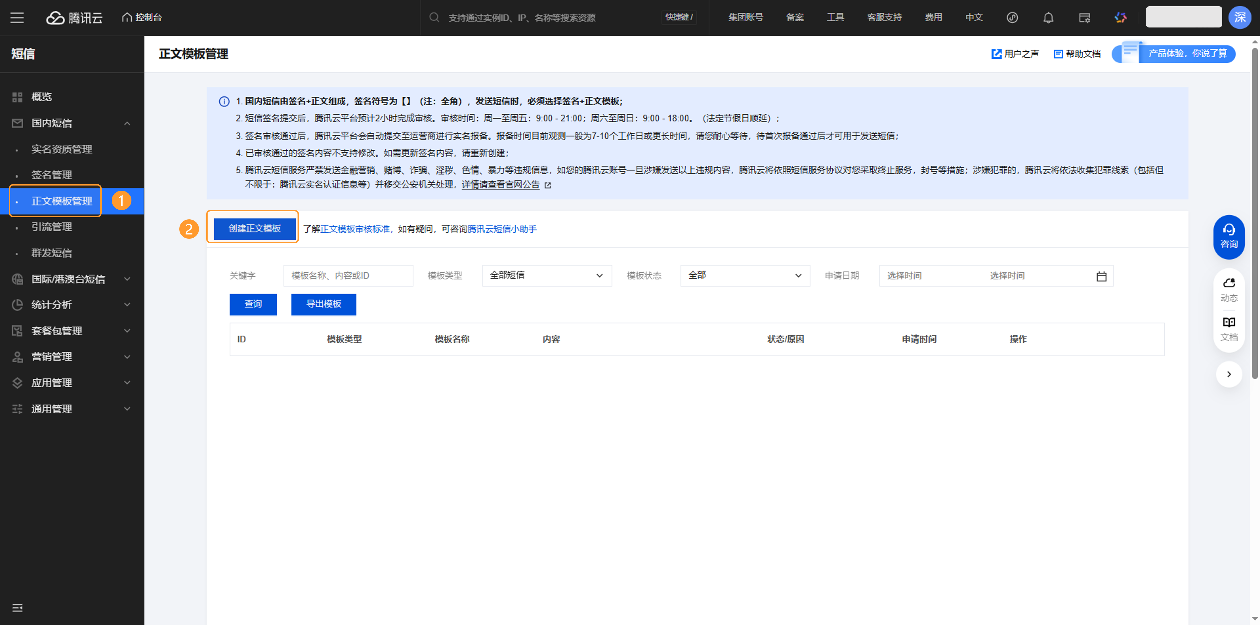 - 短信正文模板即具体发送的短信内容,短信正文模板的申请和规范详见 管理国内短信正文模板-腾讯云 和 正文模板审核标准-腾讯云 。