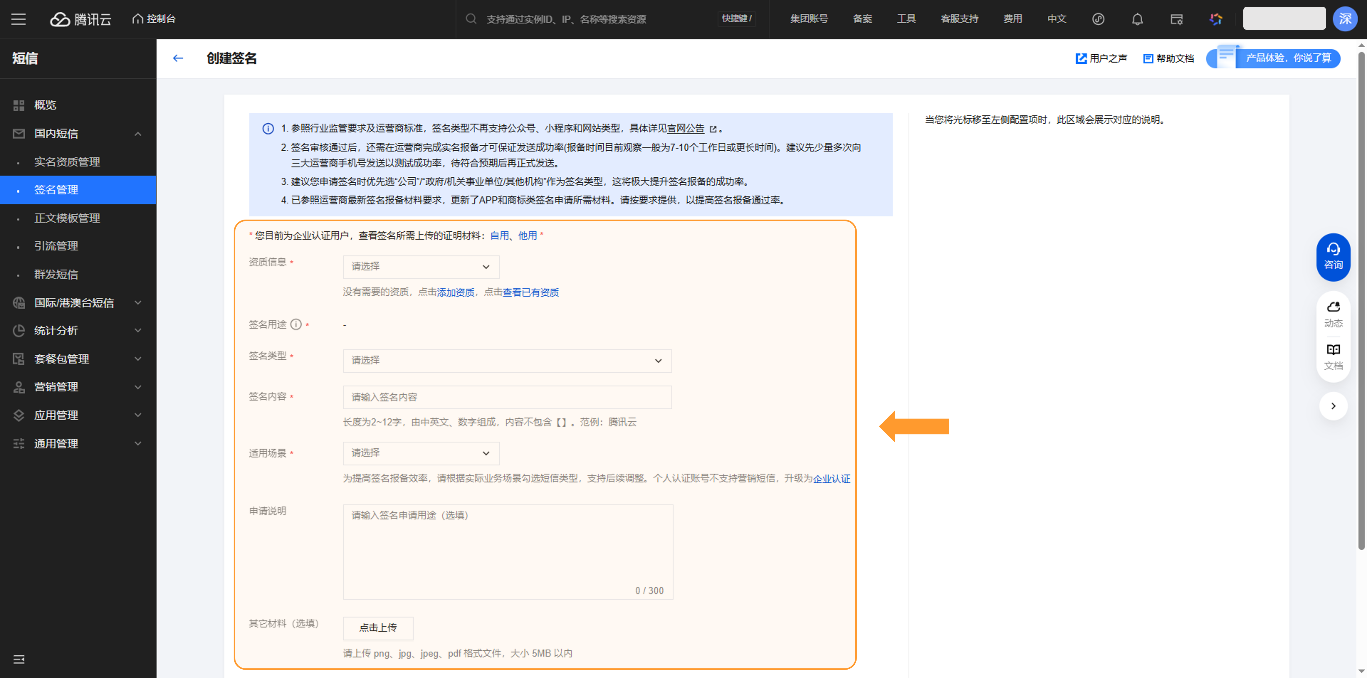 根据企业的业务需求设置信息,这里需要录入“资质信息”、“签名用途”、“签名类型”、“签名内容”等。