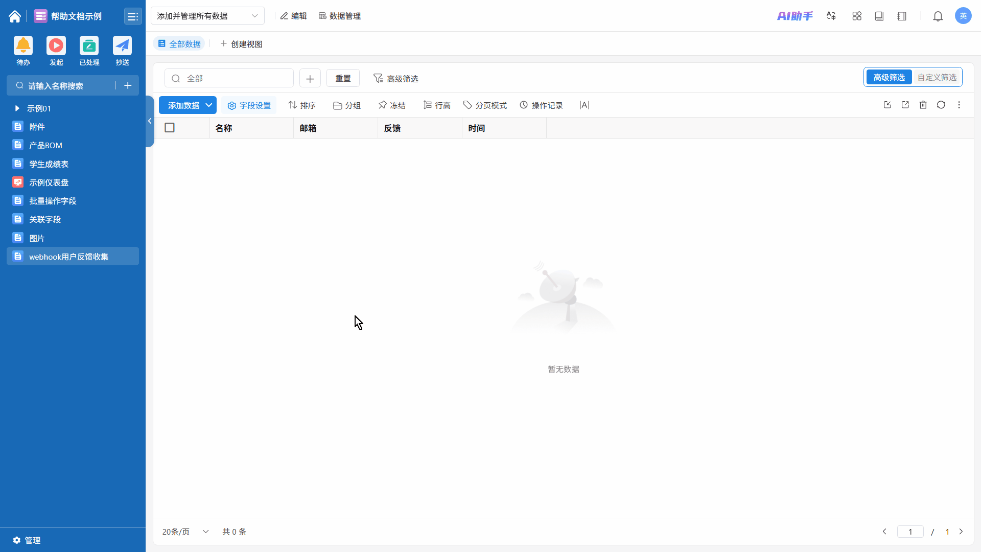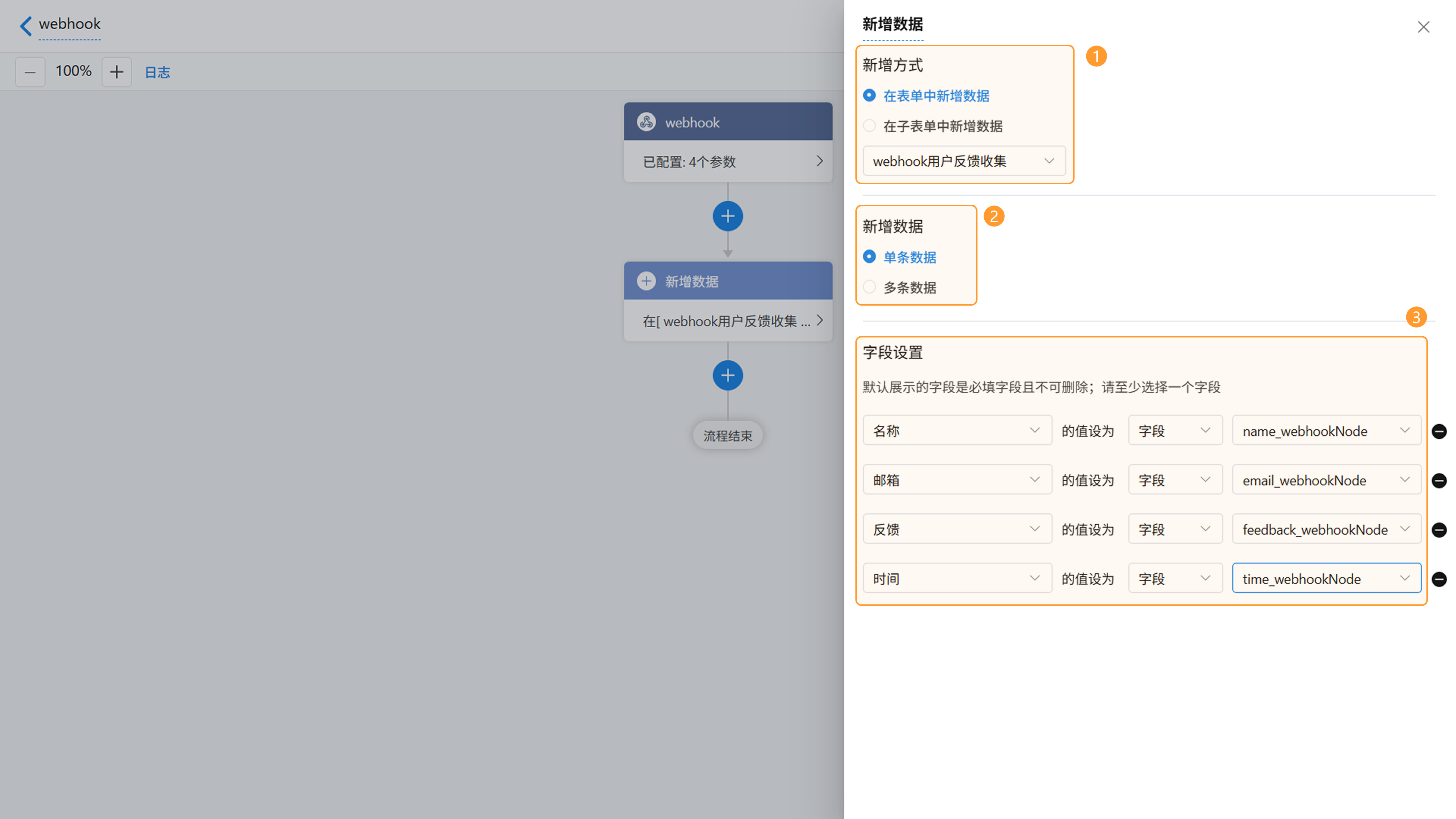 以下以“新增数据”节点为例,演示如何将 Webhook 数据写入指定表单并完成字段映射。