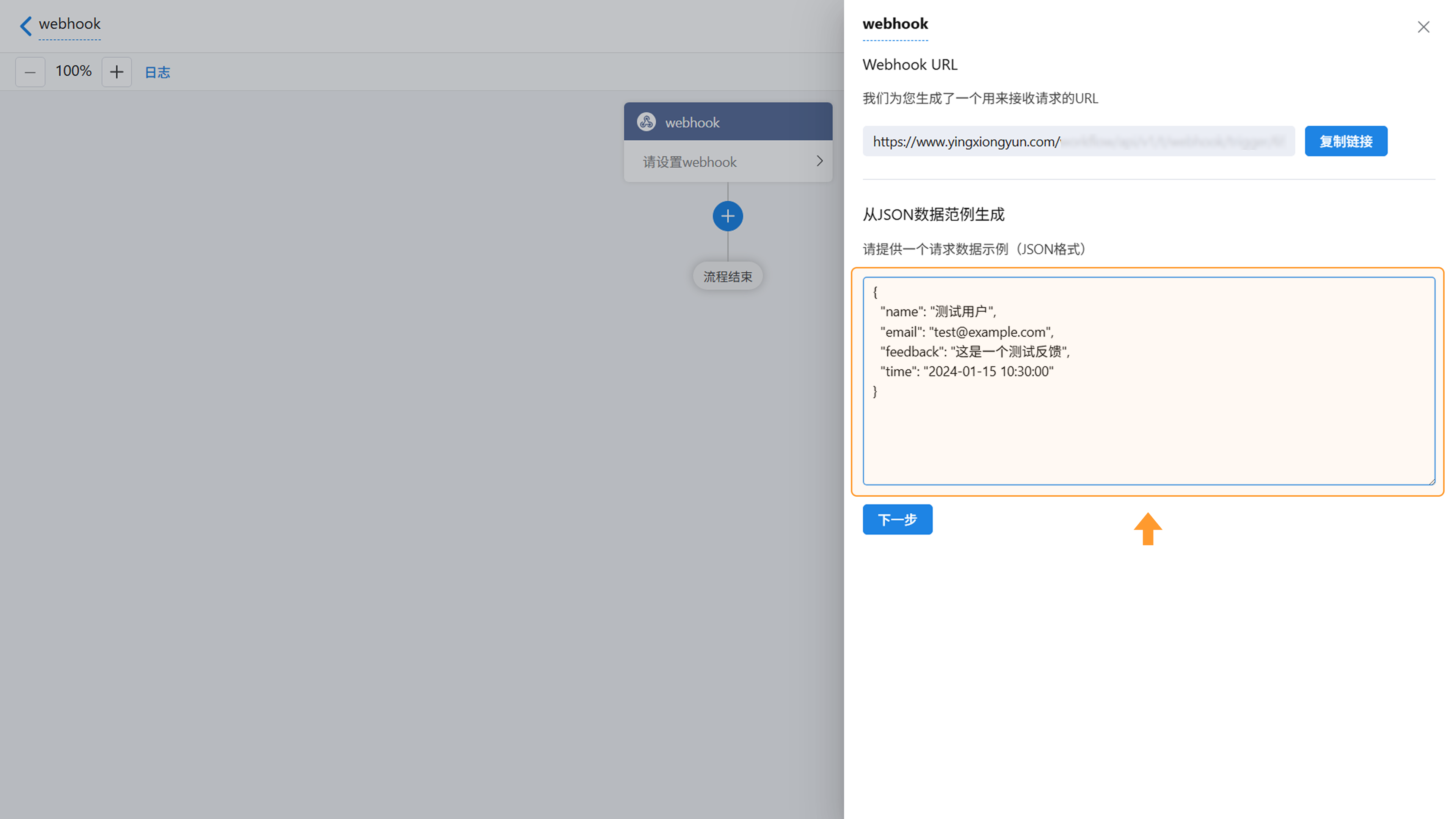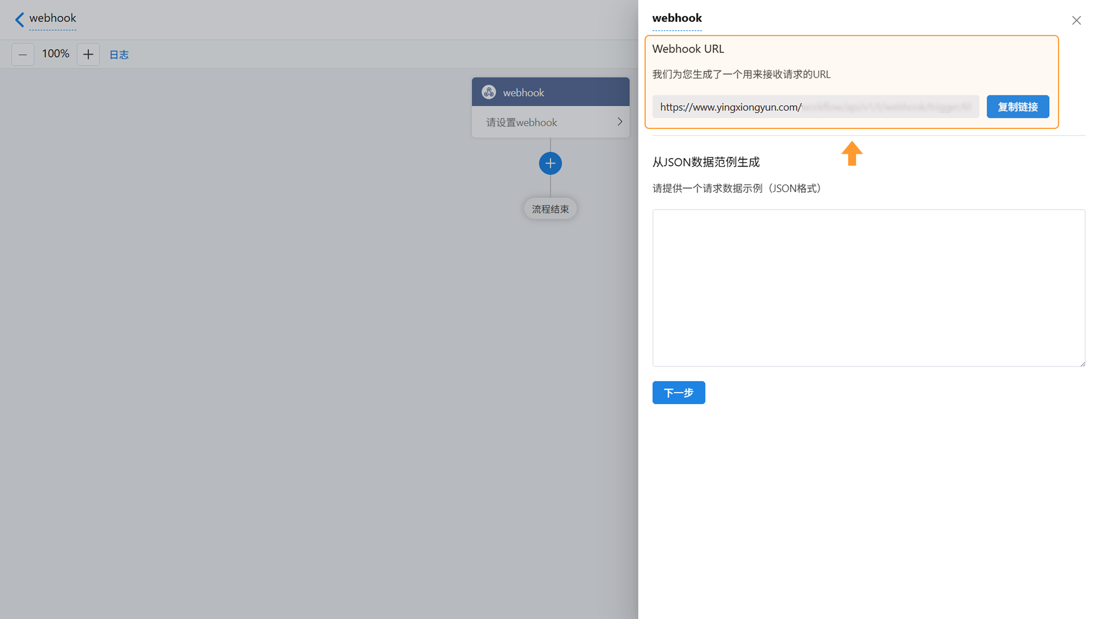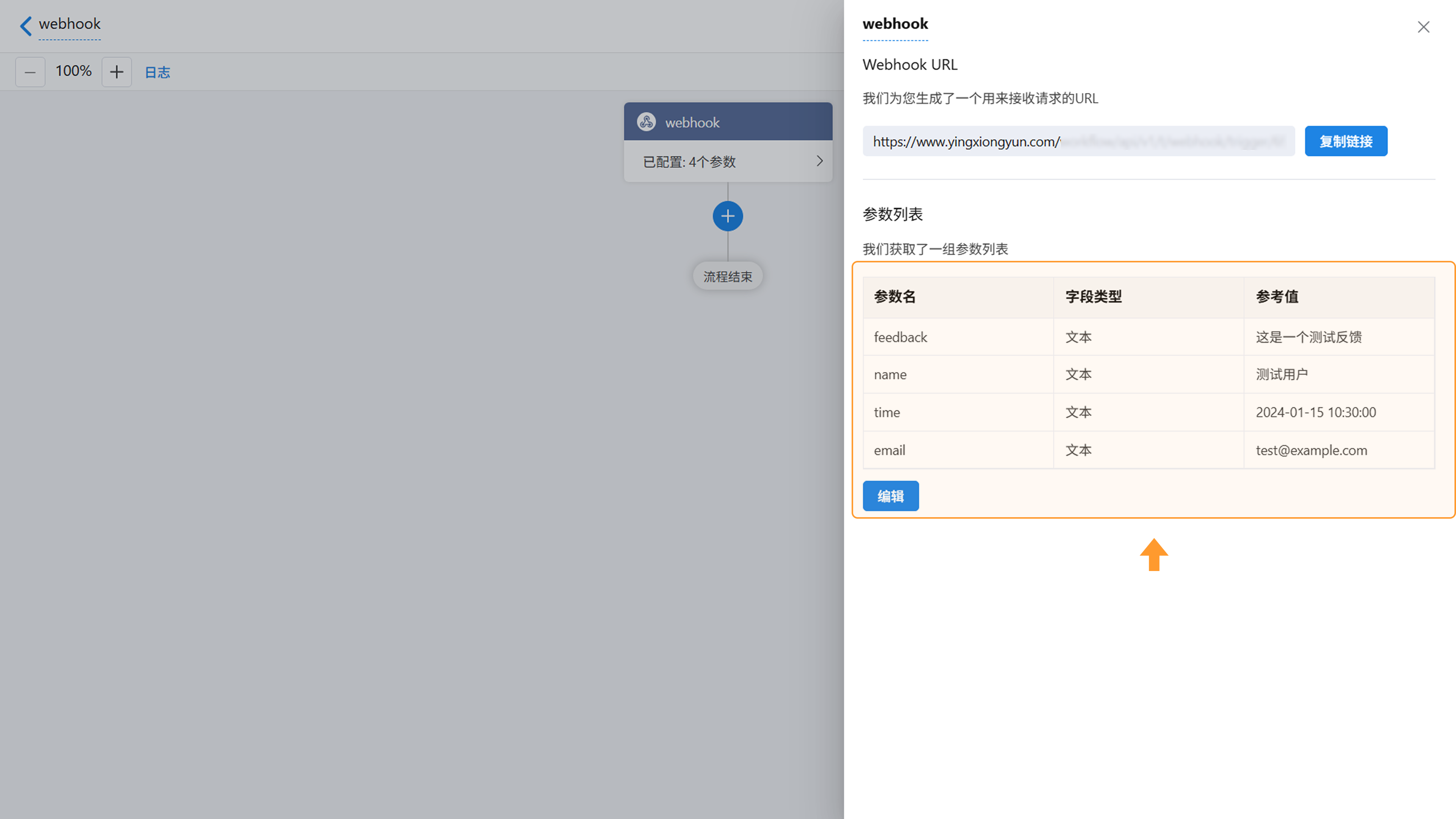 在工作流中创建 Webhook 工作流后,系统会自动生成一个专属 URL。将此地址配置到外部应用中,当此 URL 接收到数据后即可自动解析数据中的字段,并触发流程。