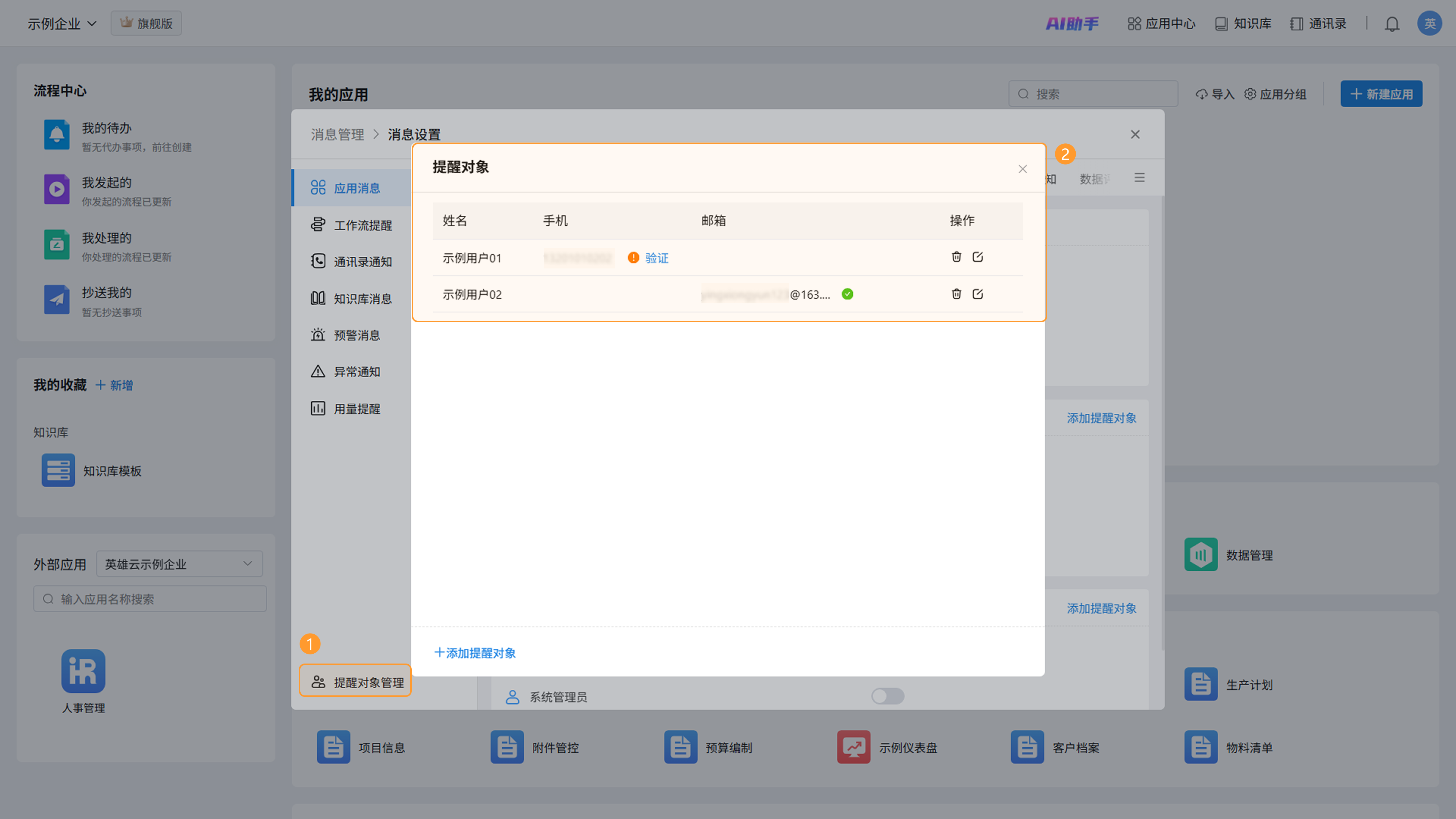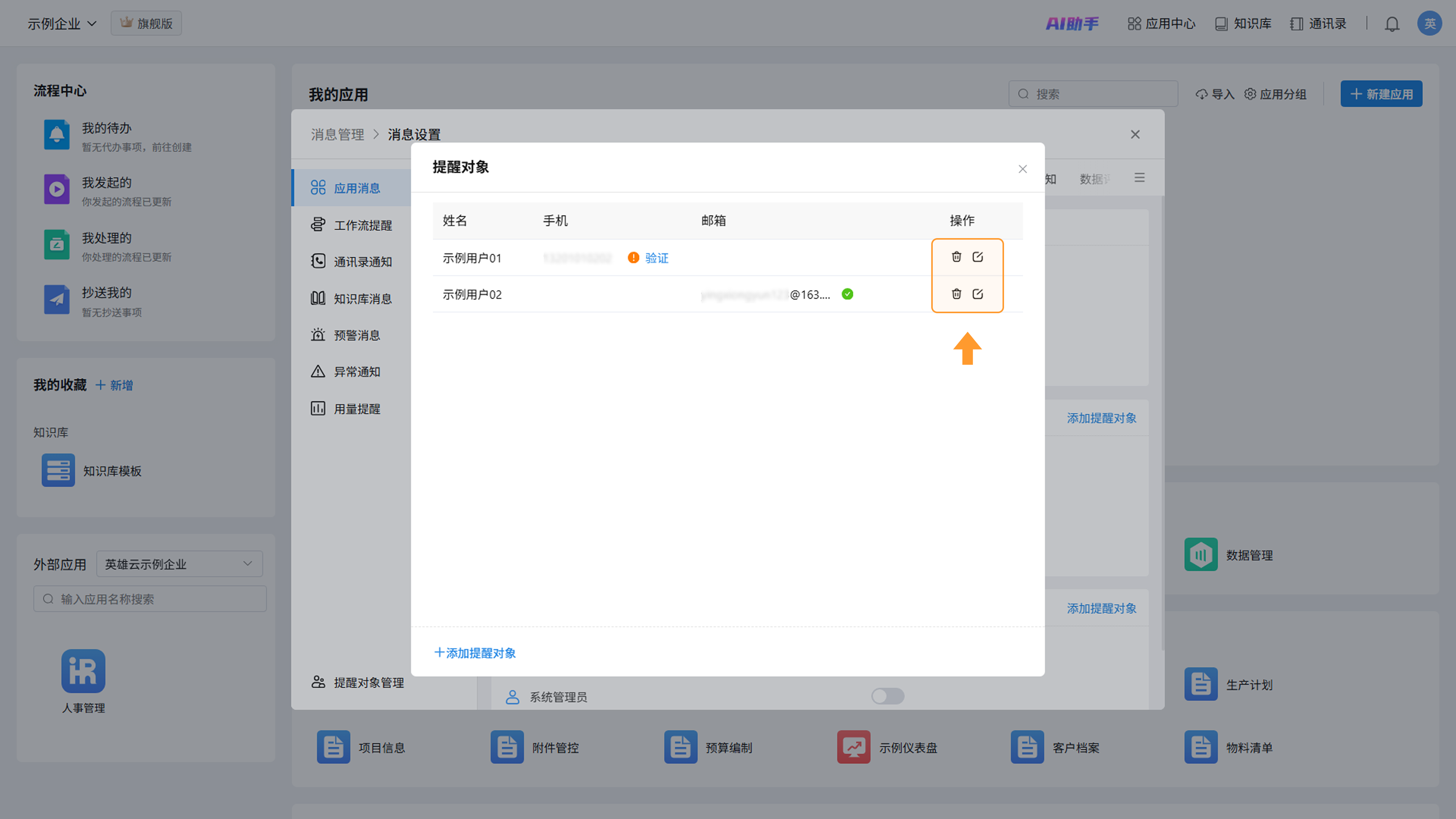 英雄云支持用户手动添加、编辑、删除提醒对象,灵活配置不同消息的接收范围。操作路径:点击消息设置页面左下角的「提醒对象管理」,进入提醒对象管理页面。