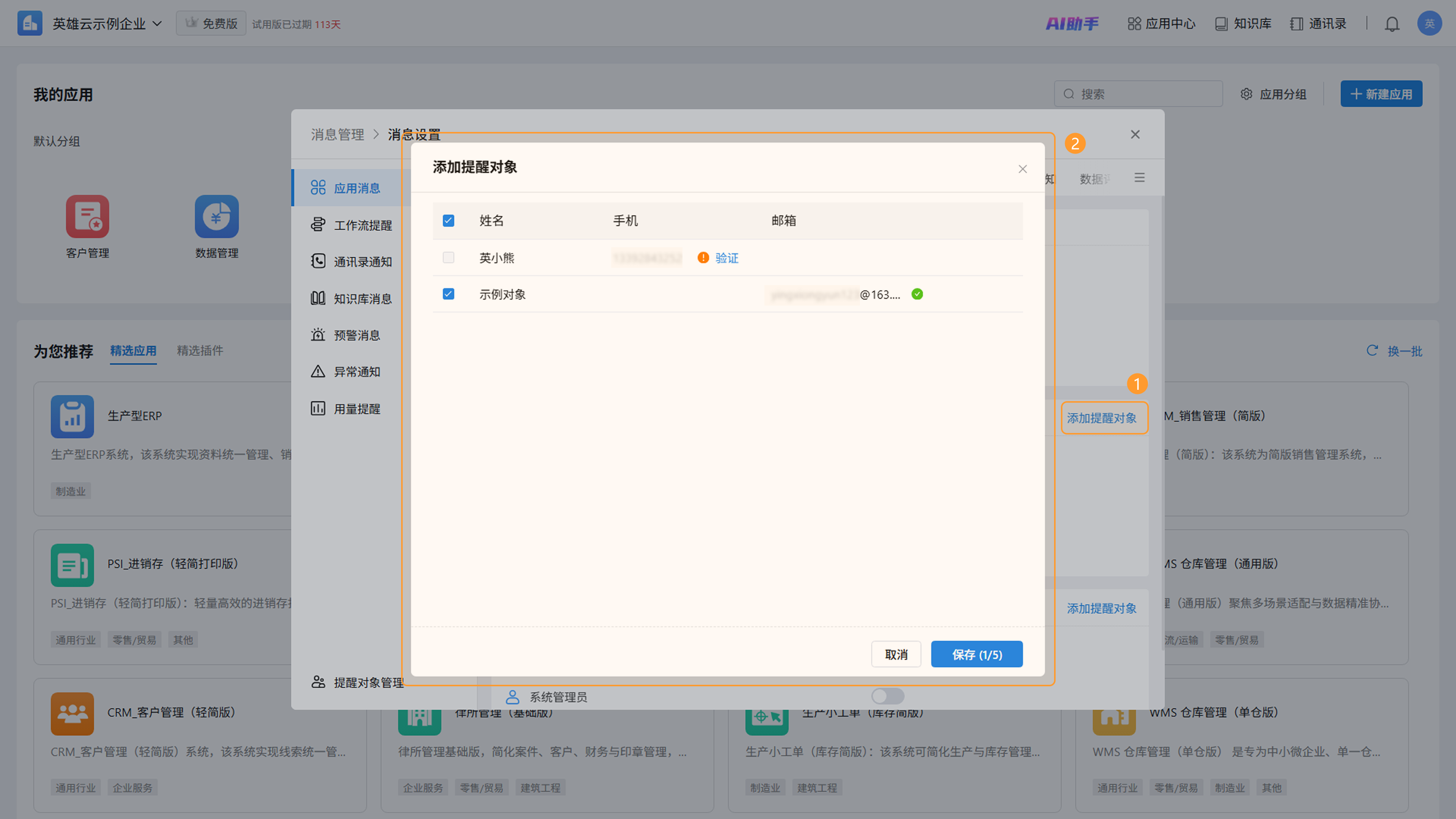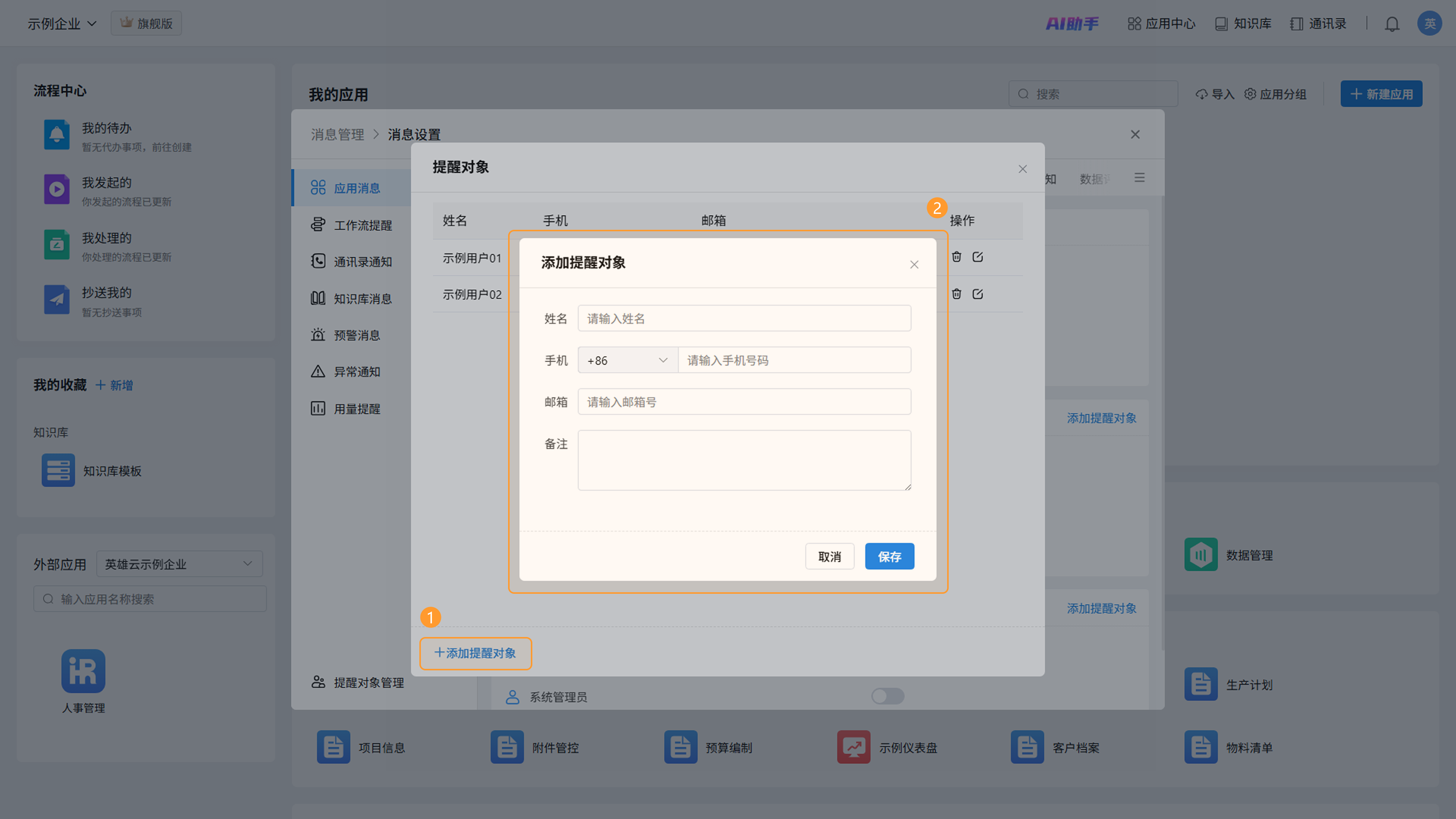 提醒对象指接收消息通知的用户,其中企业创建者与系统管理员默认为消息提醒对象,无需手动添加。