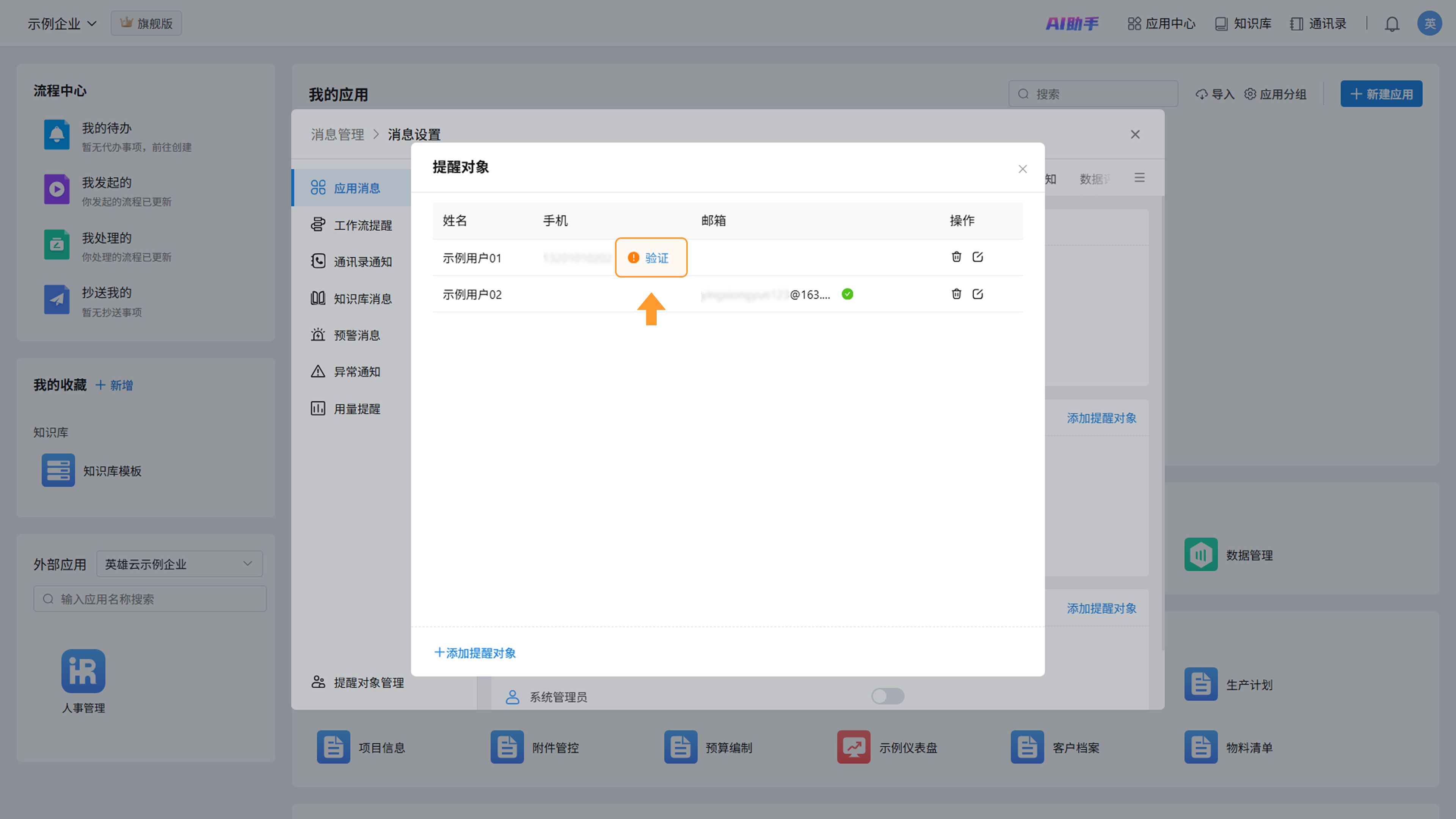 提醒对象添加后,点击「验证」,系统将向填写的手机号/邮箱发送验证信息,对方需接收并完成邀请验证,方可正式成为可配置的消息提醒对象。