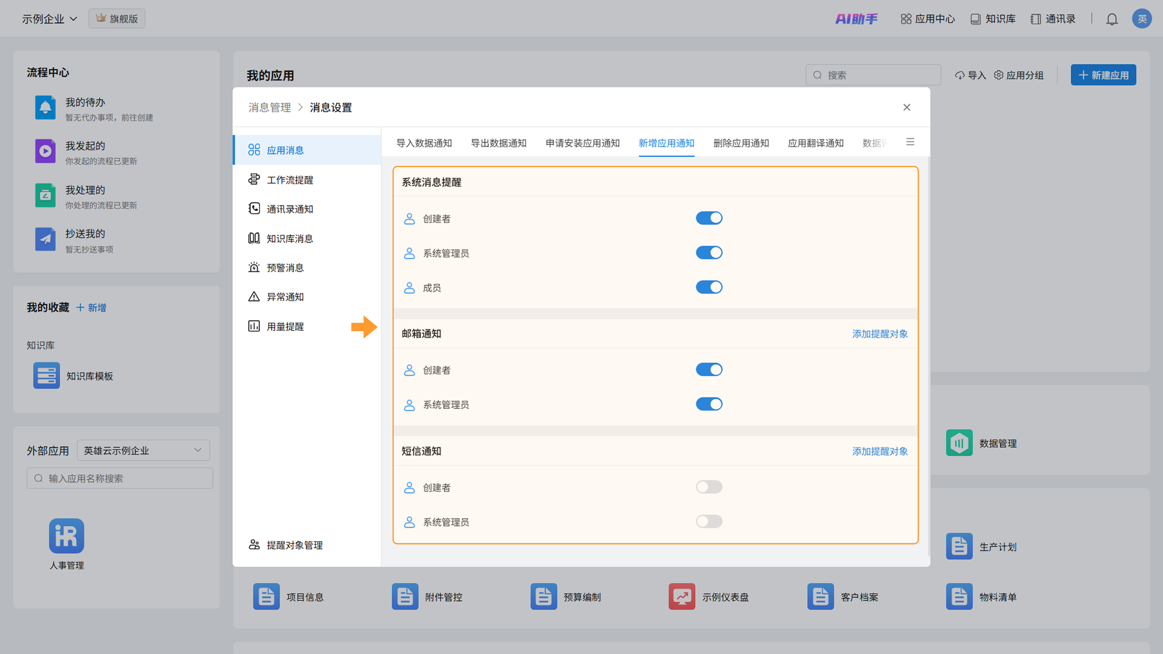 英雄云支持用户针对不同类型的消息,个性化配置接收提醒方式及提醒对象,满足企业多样化的消息通知需求。