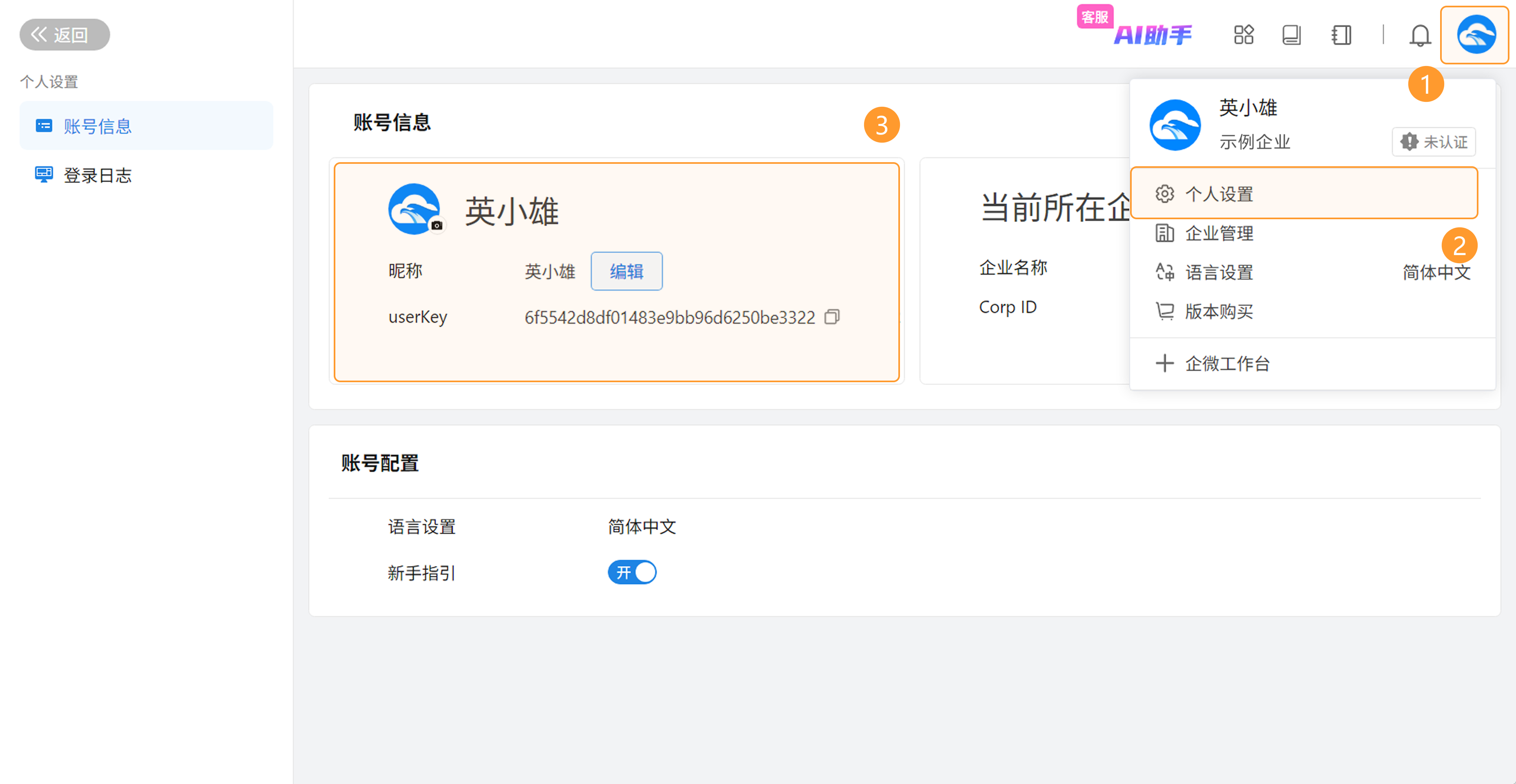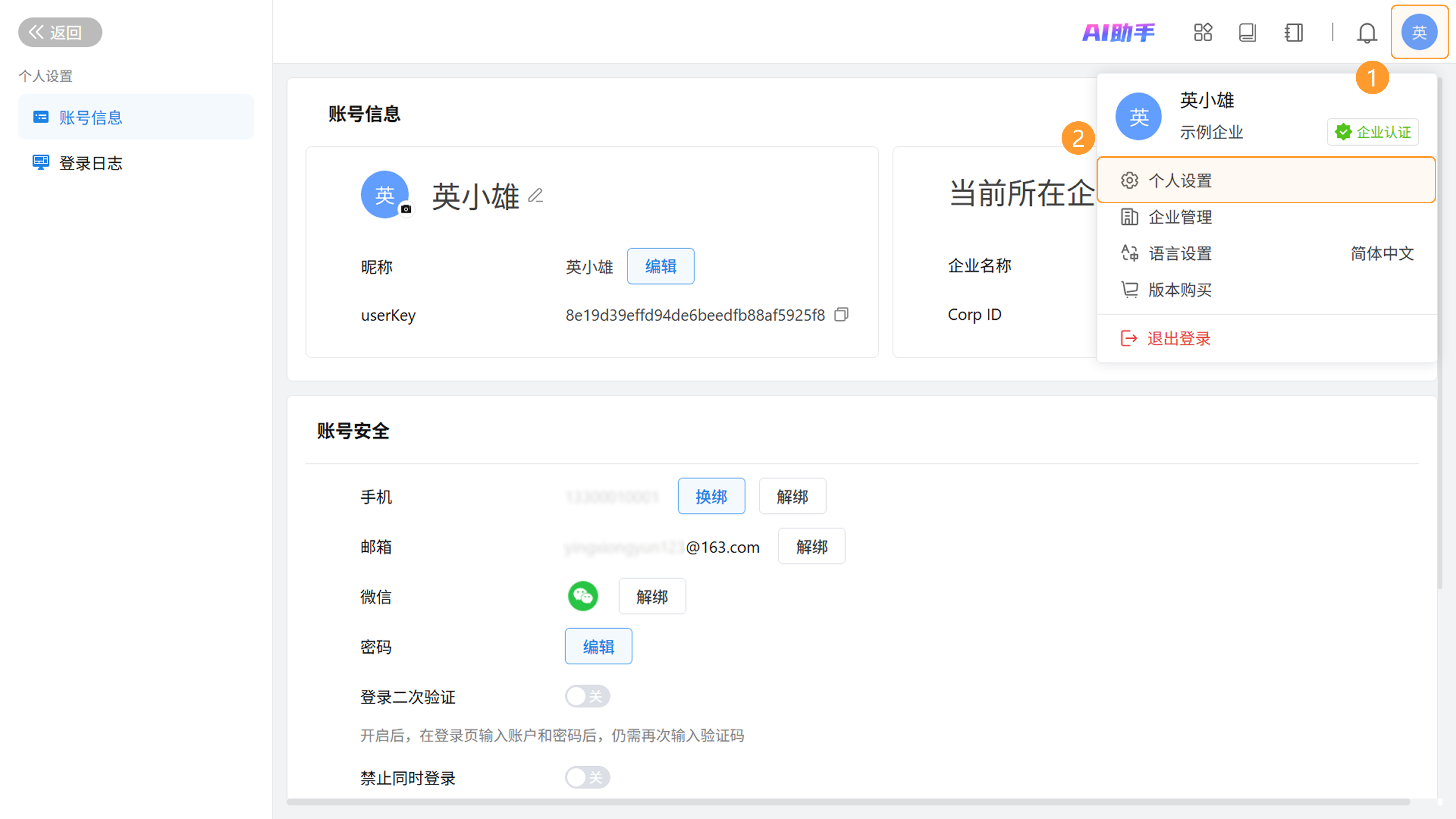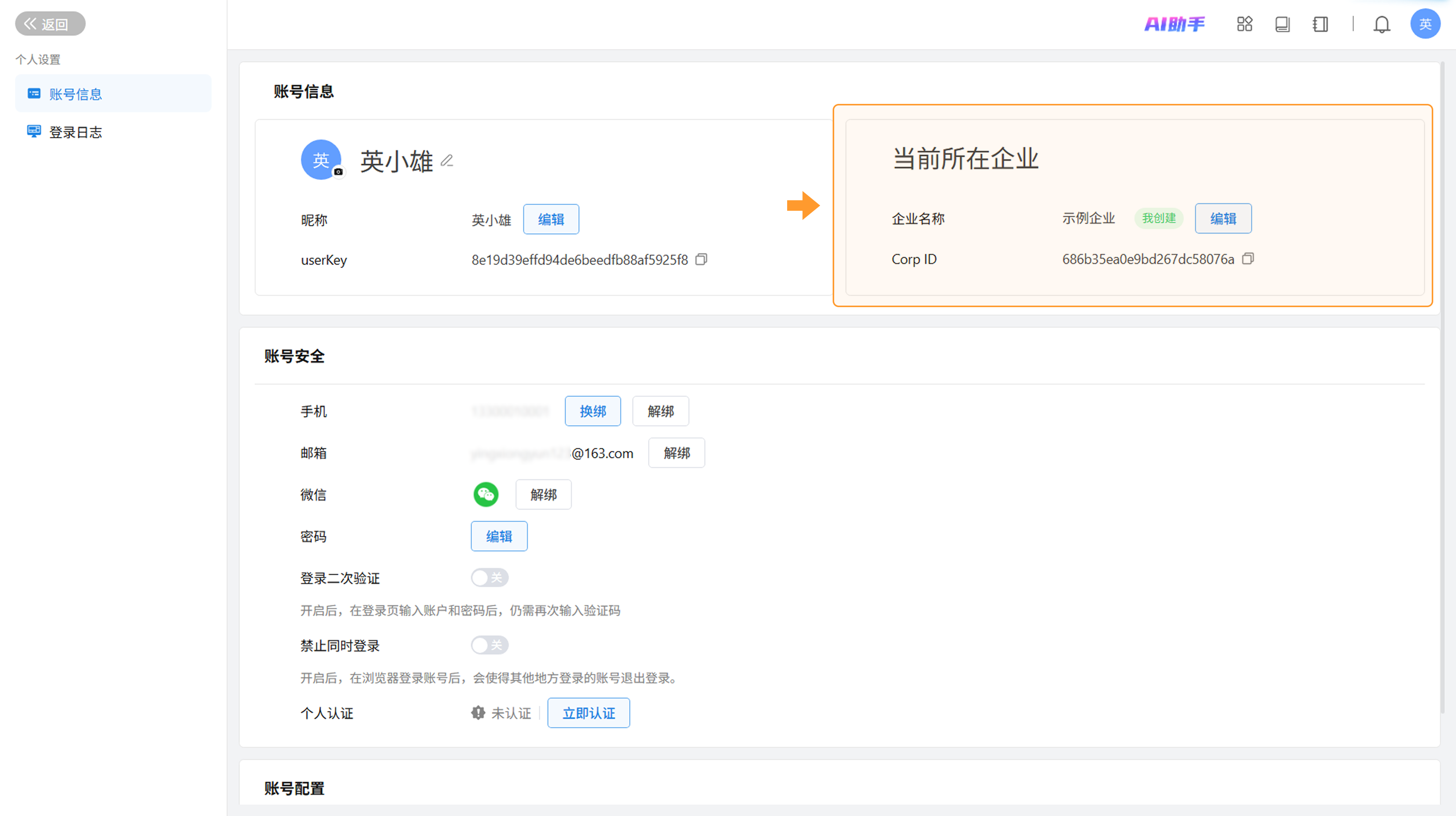 账号信息页面展示当前账号加入/创建的企业名称、企业Corp ID;仅企业创建者或系统管理员可编辑企业名称。