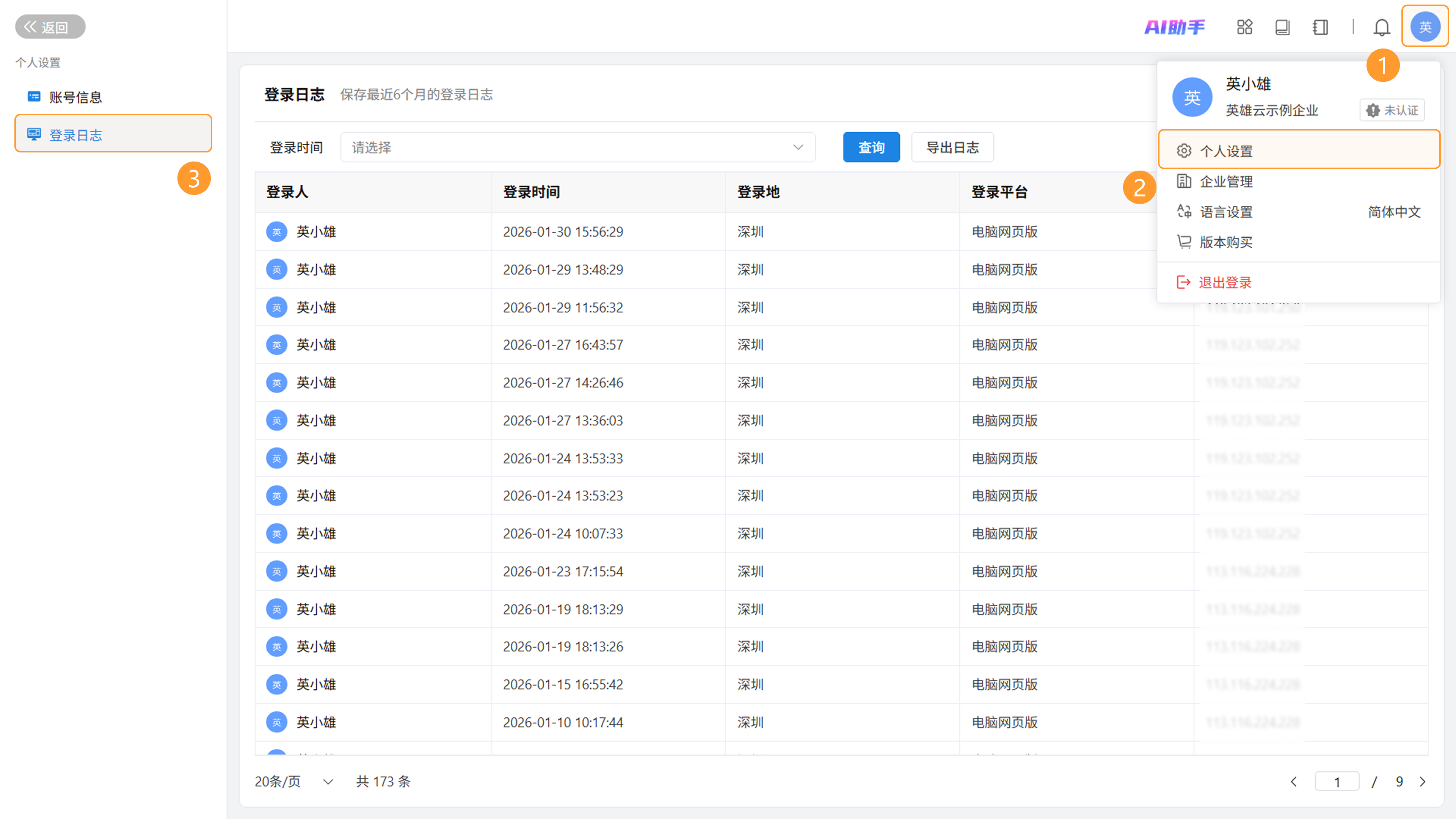 此页面可查看个人登录详情(含登录时间、地点、平台、IP),支持按登录时间筛选,也可导出日志文件。