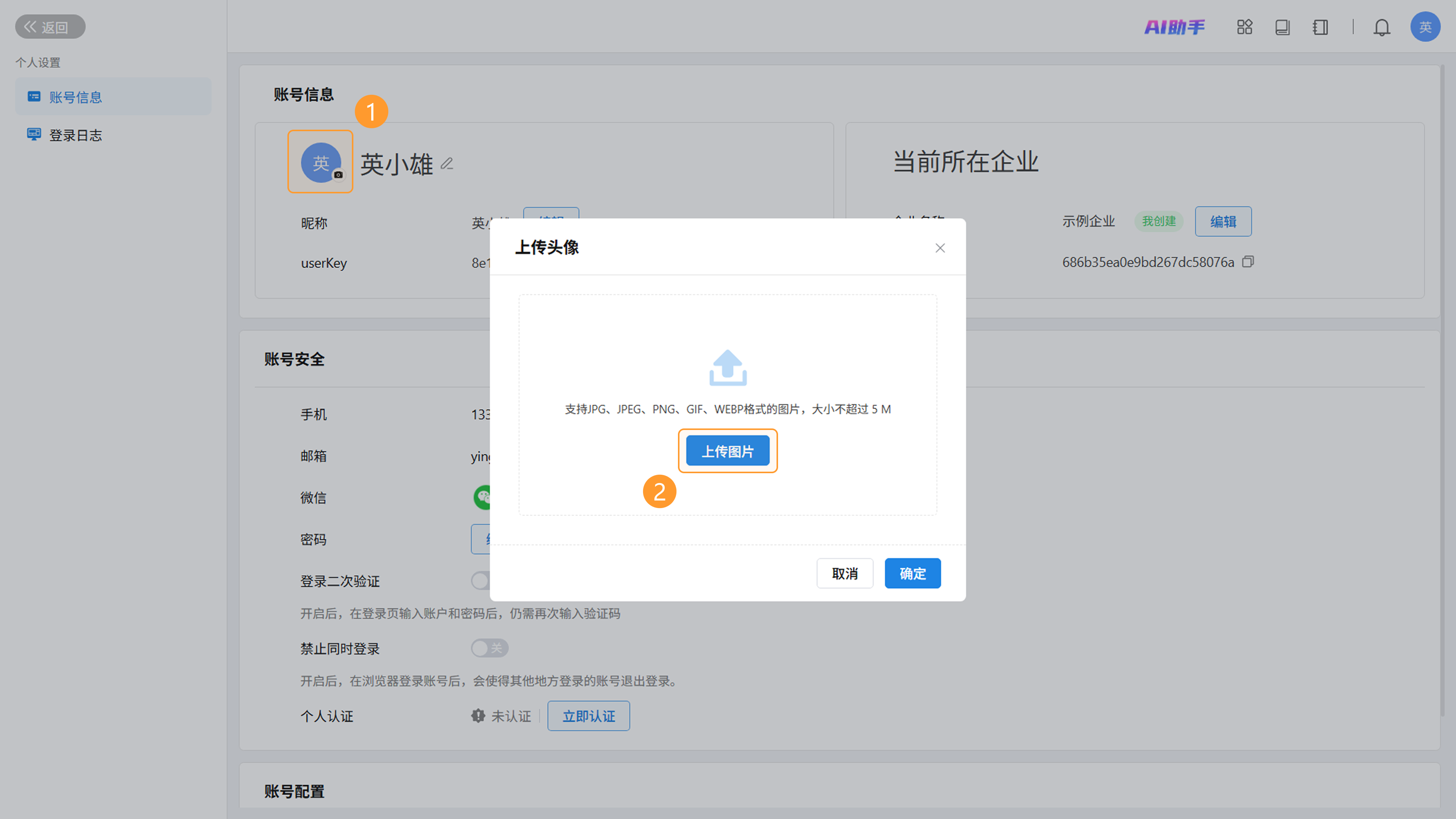 点击头像,在弹出窗口上传本地图片(支持JPG、JPEG、PNG、GIF、WEBP格式);上传后可调整图片选取范围或「更换图片」,点击「确定」即可完成更换。