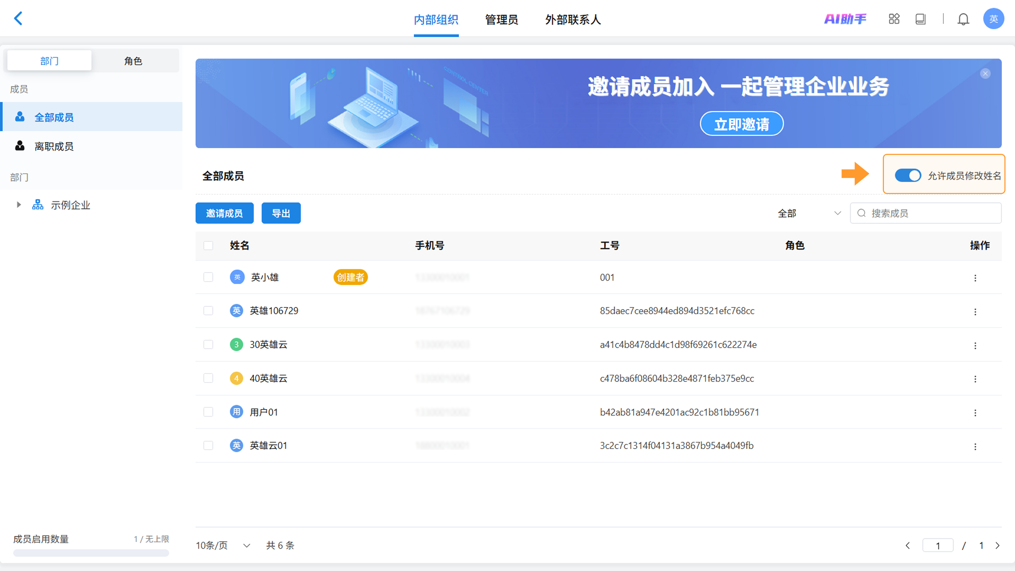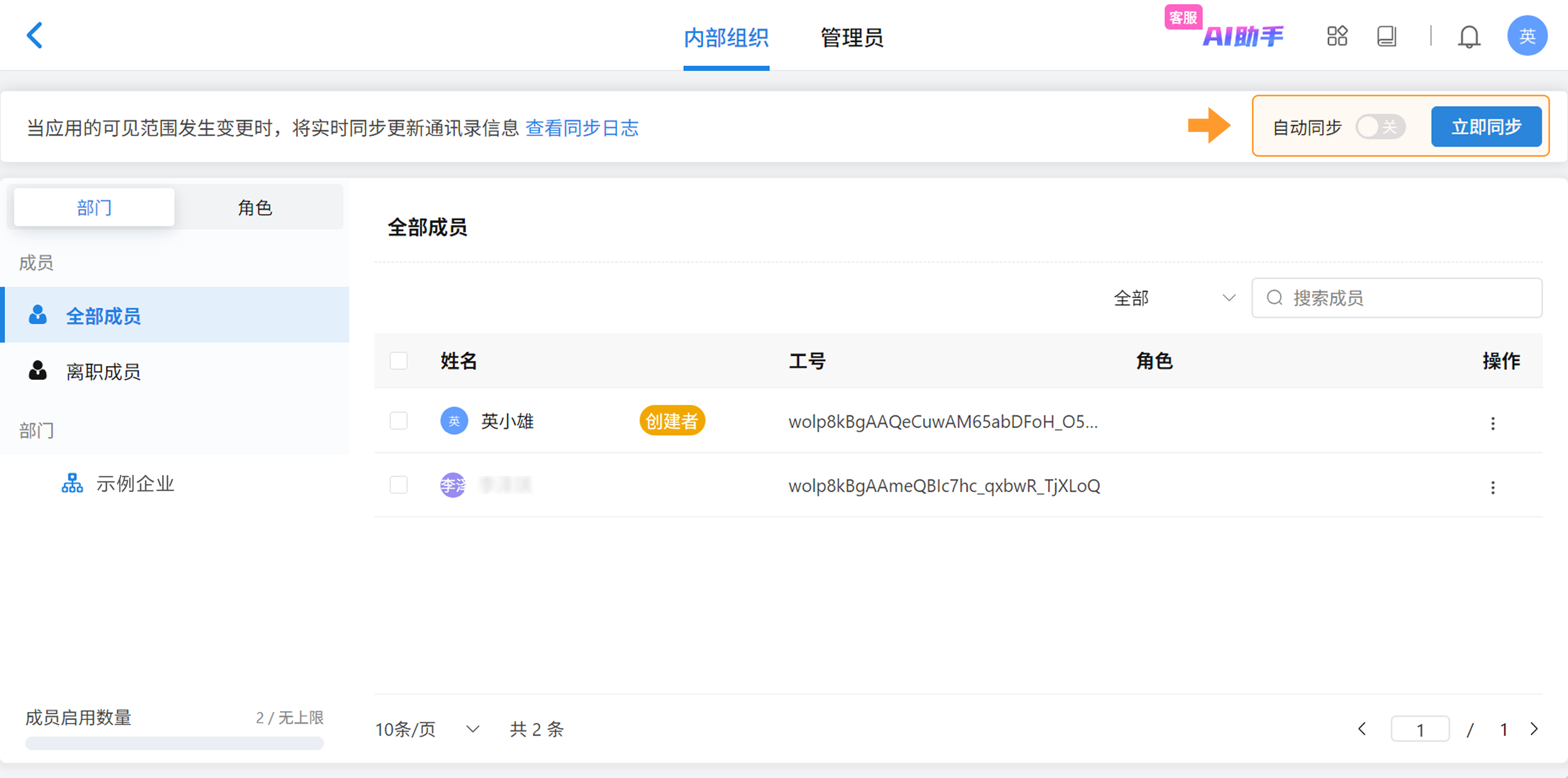 注:集成模式下,通讯录姓名同步自第三方组织架构,不支持修改;系统管理员可设置成员信息手动或自动同步。
