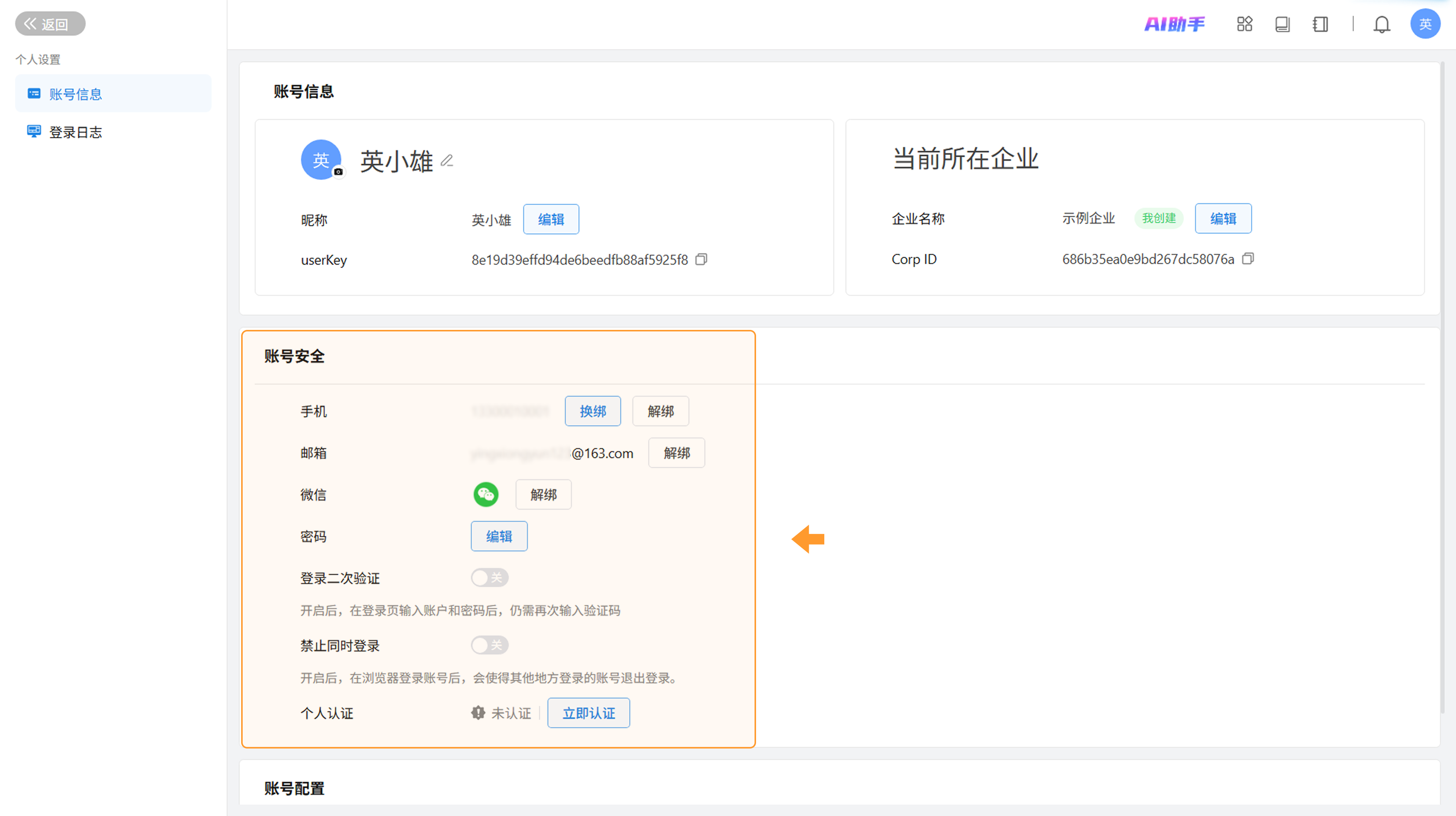 账号安全模块包含密码设置、手机/邮箱/微信绑定、登录二次验证、禁止同时登录及个人认证功能,可有效提升账号安全性。