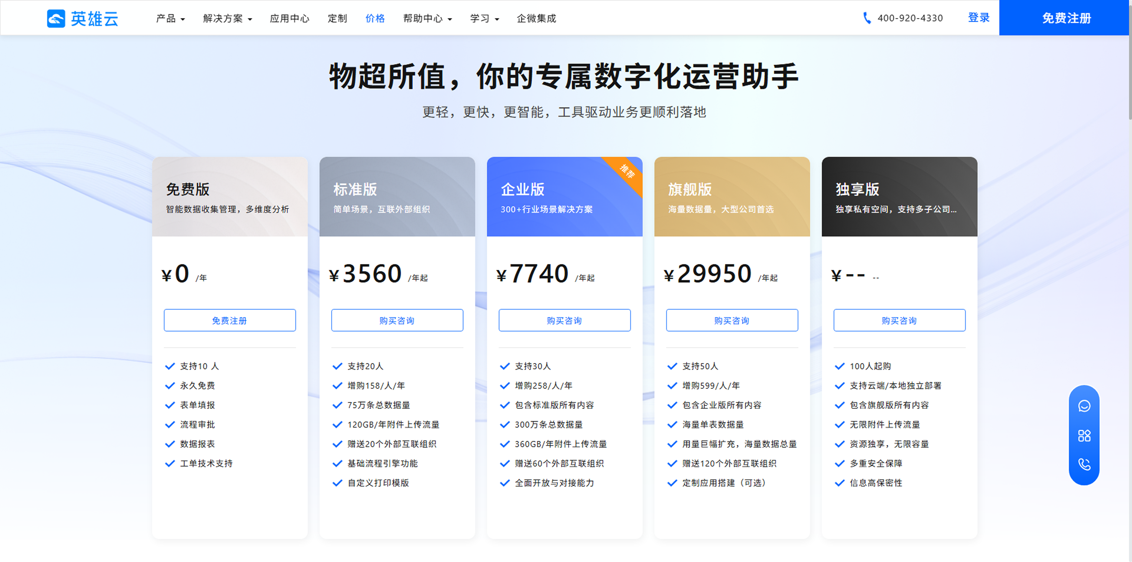 英雄云提供多种版本供用户选择,您可根据企业人数、业务需求等选择适合自己的版本。