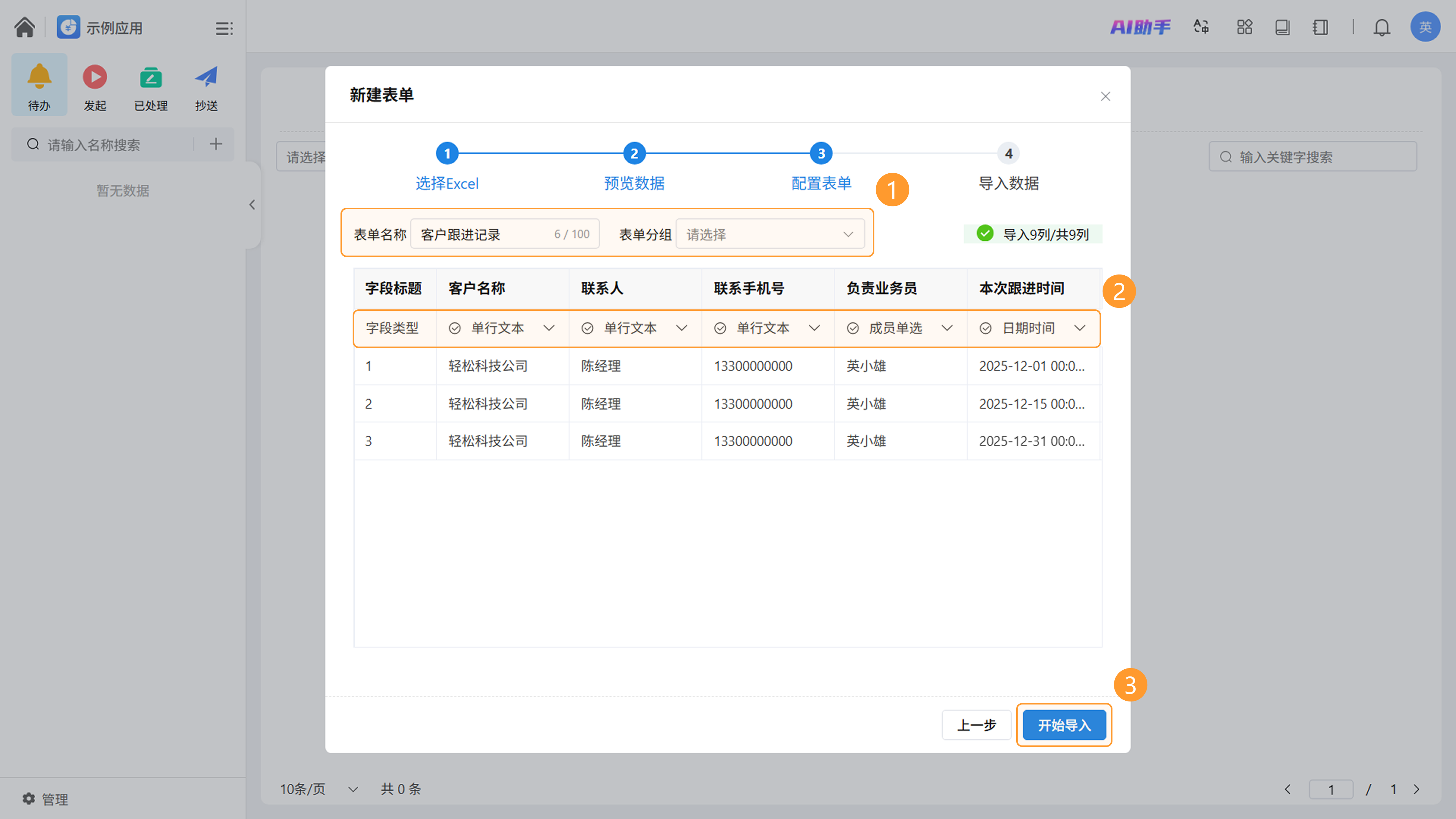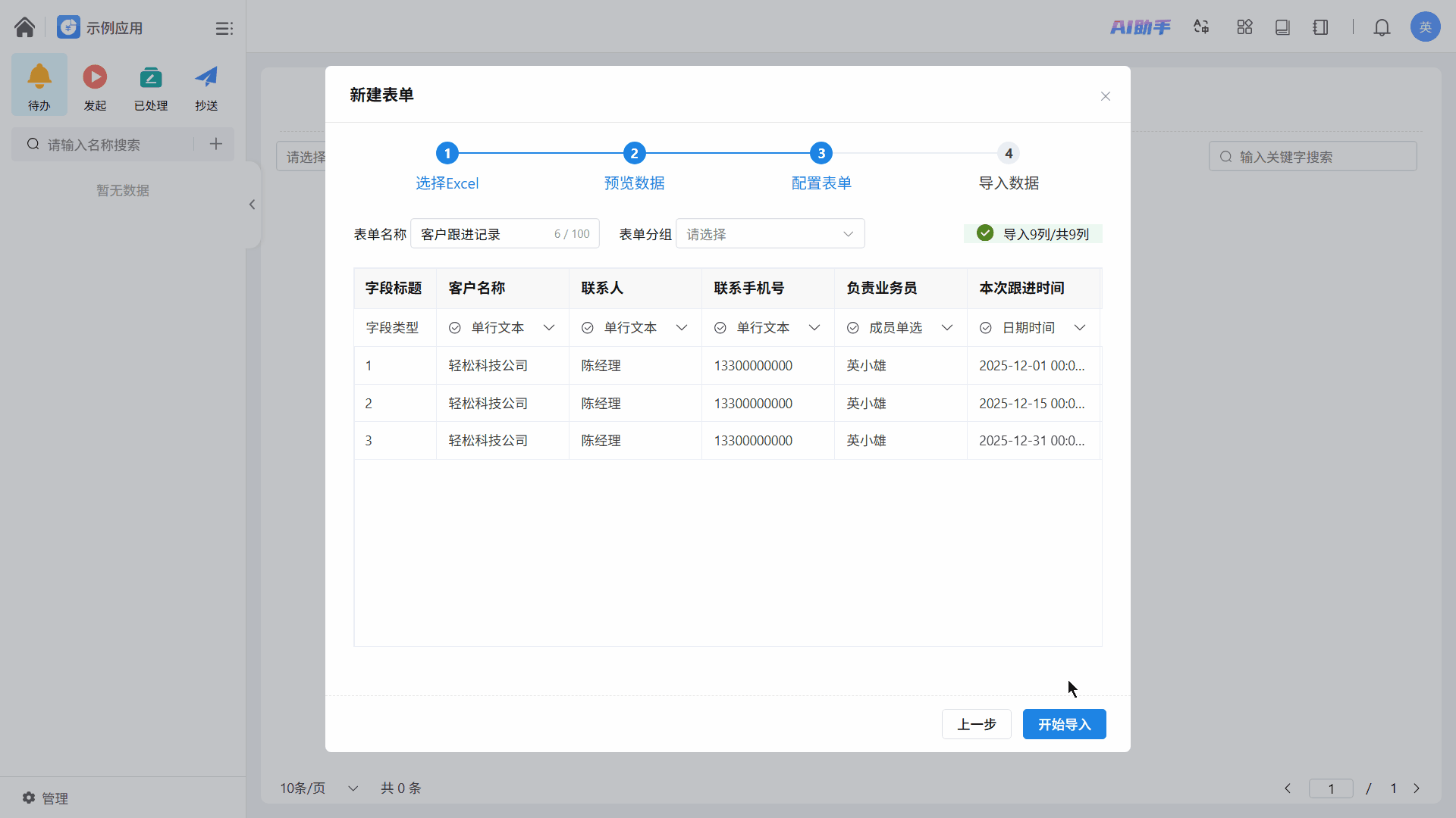 上传成功后,用户可以修改生成的表单名称、所属分组,并为每一列数据指定对应的字段类型。确认无误后,点击「开始导入」。