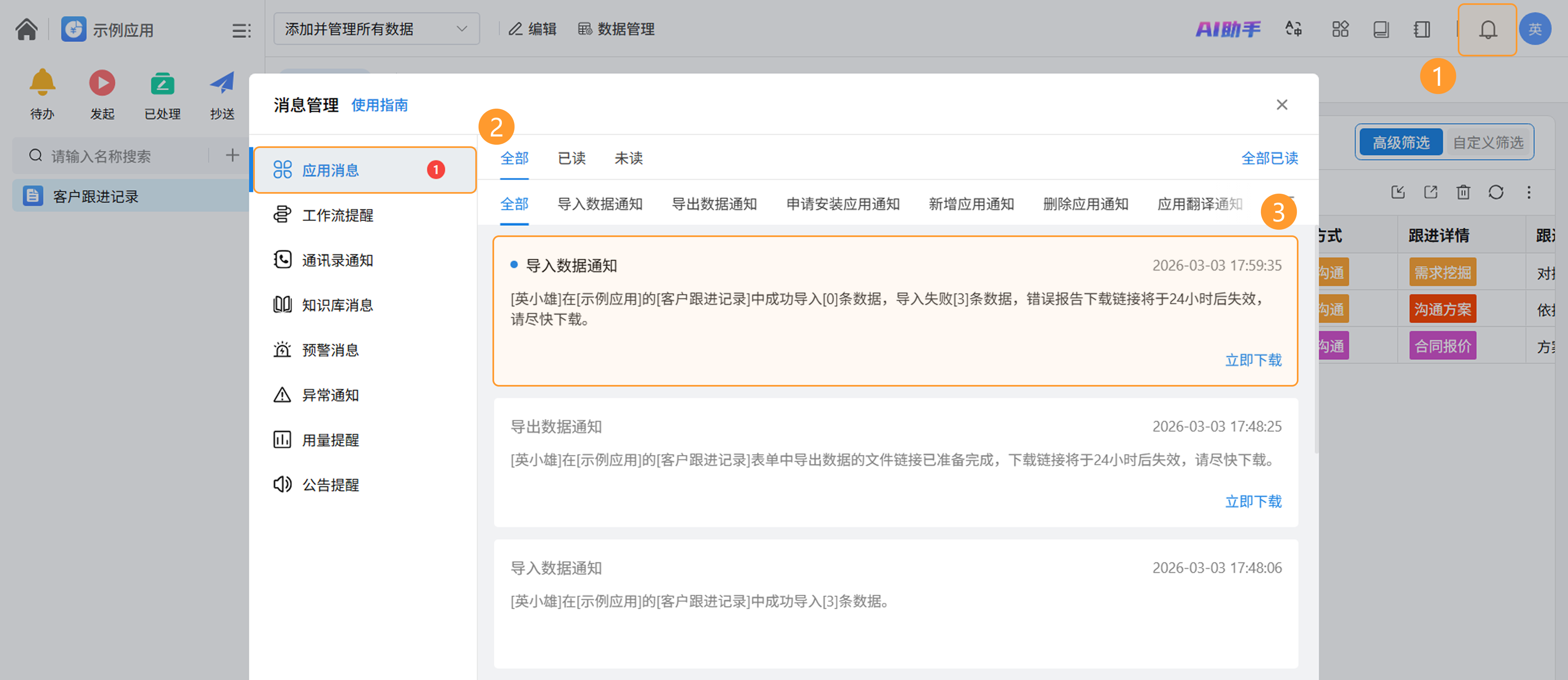 若导入失败,系统会发送应用消息。请前往「消息 >> 应用消息」查看“导入数据通知”,并点击「立即下载」错误报告,以获取具体的失败原因及修改建议。