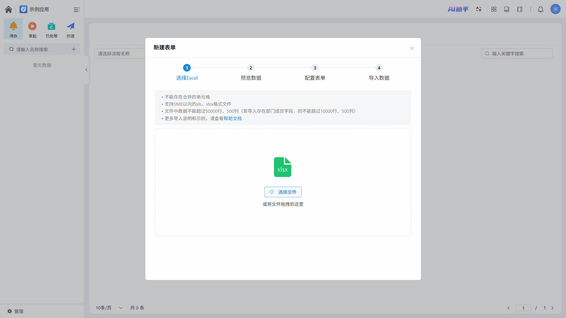 - 上传文件:支持点击选择文件或手动拖拽上传(xls/xlsx 格式)