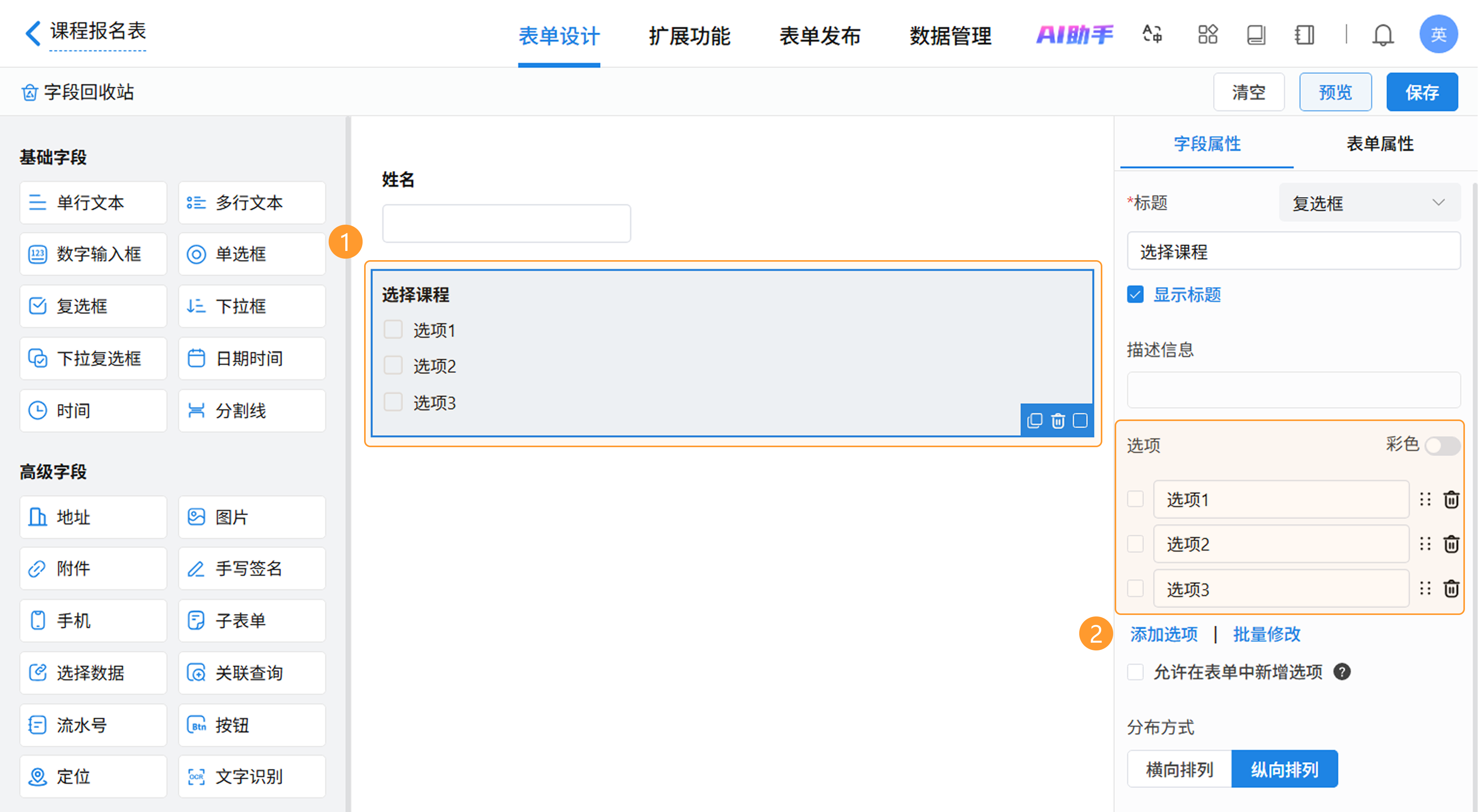 导入单选框、复选框等含有固定选项的字段后,需在表单设计页面手动配置其具体的选项内容。