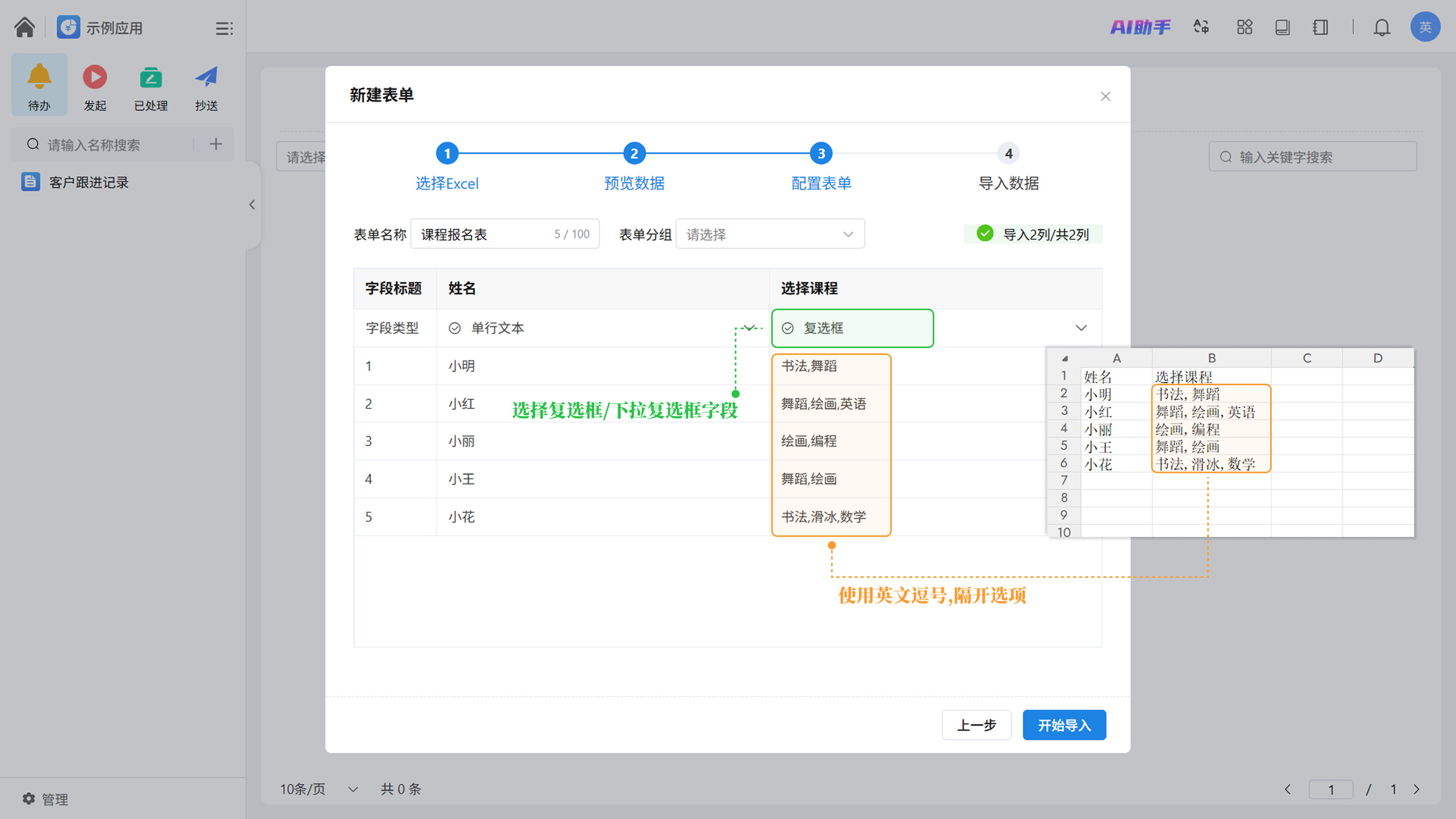 在 Excel 中,复选框或下拉复选框的不同选项需以英文逗号 , 隔开。导入时,请确保手动指定字段类型为对应的“复选框”或“下拉复选框”。