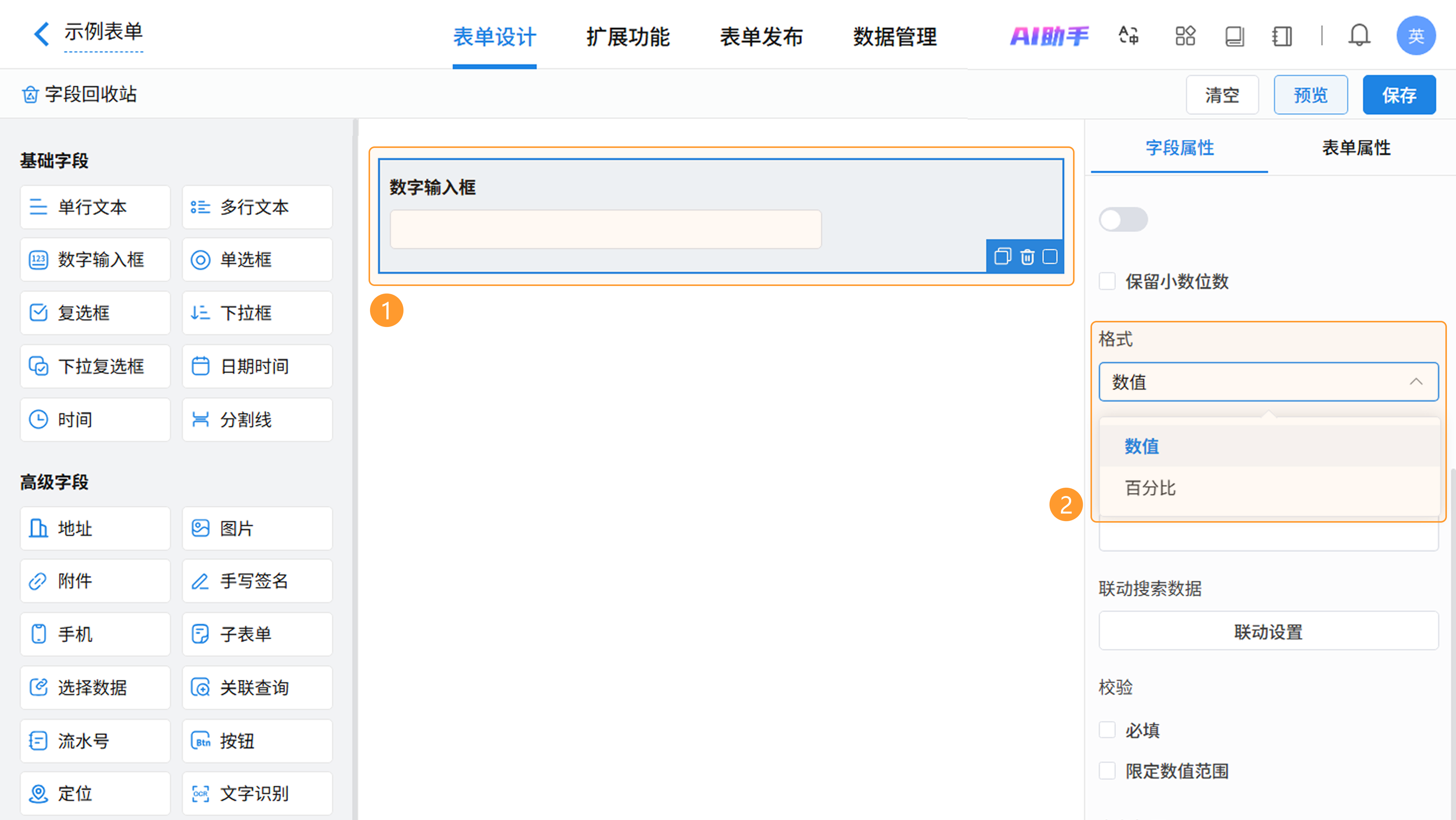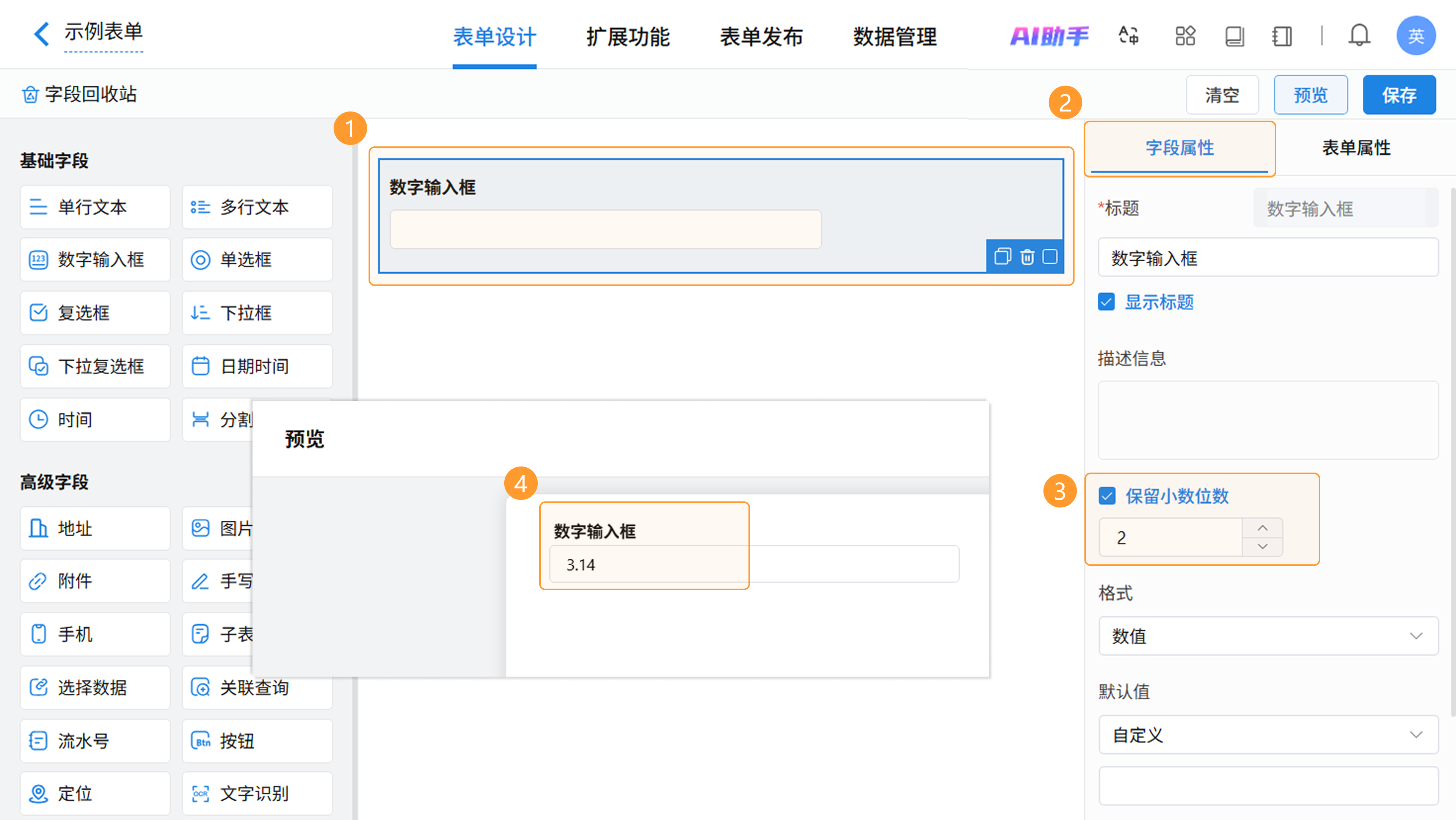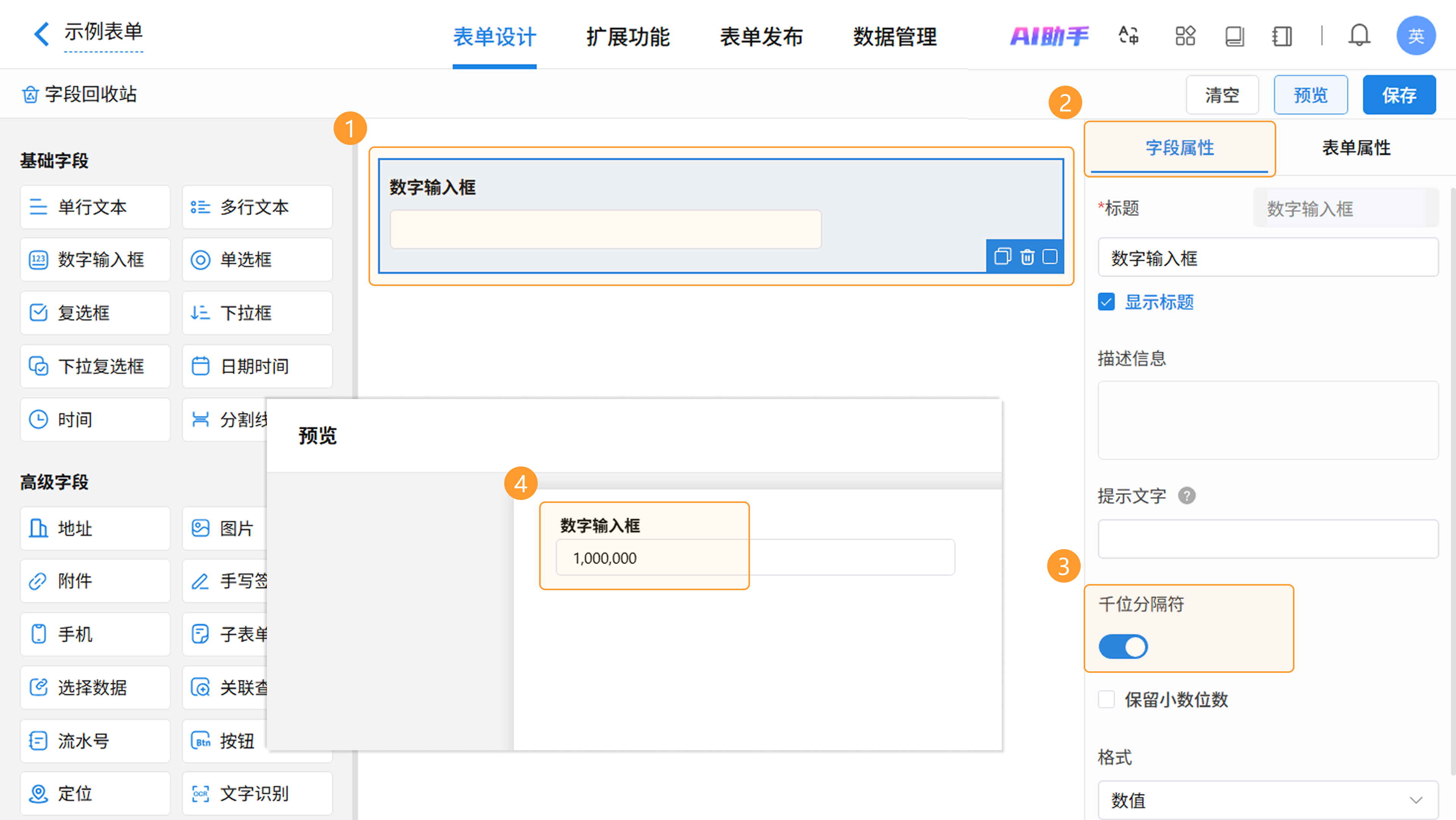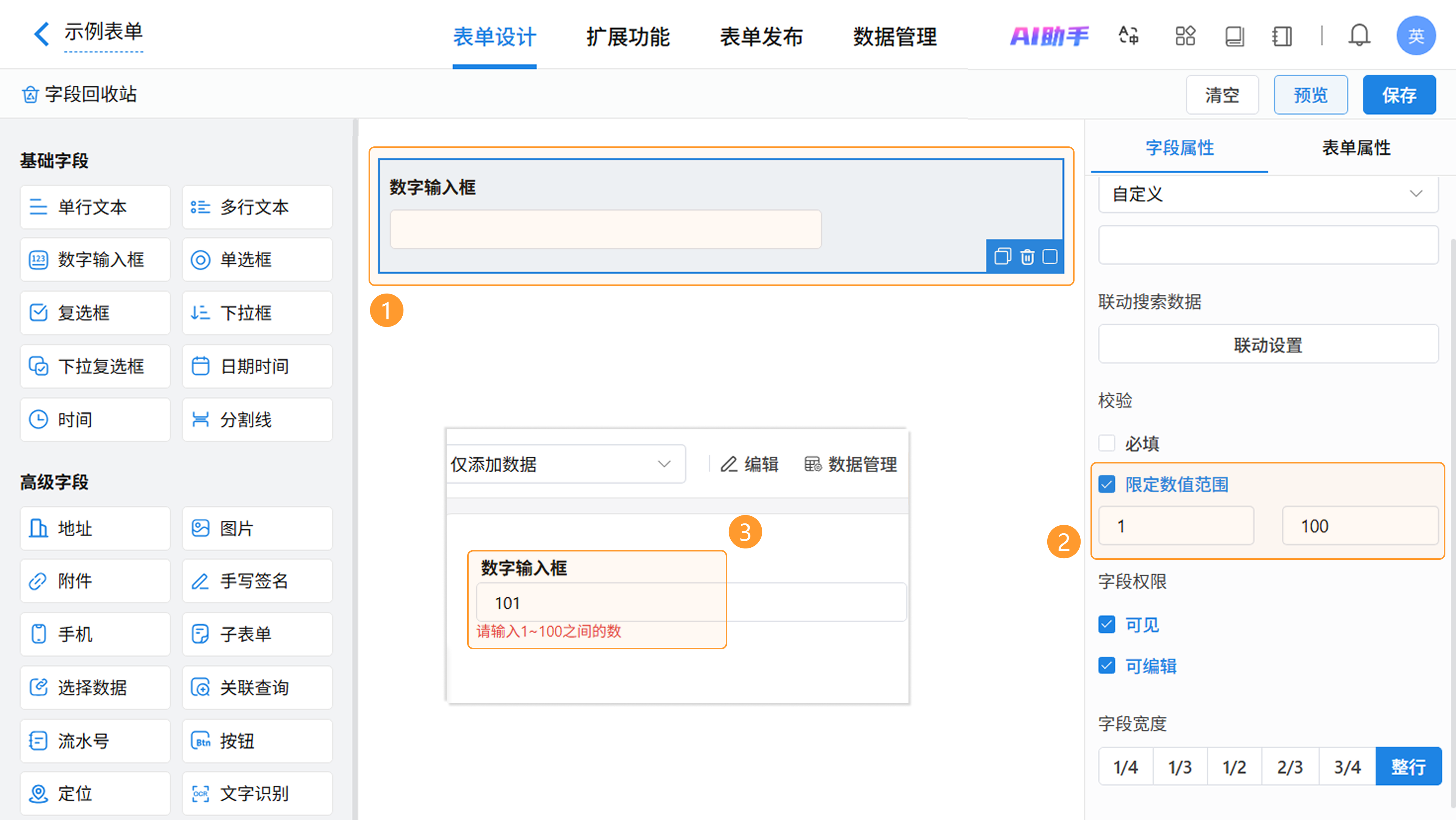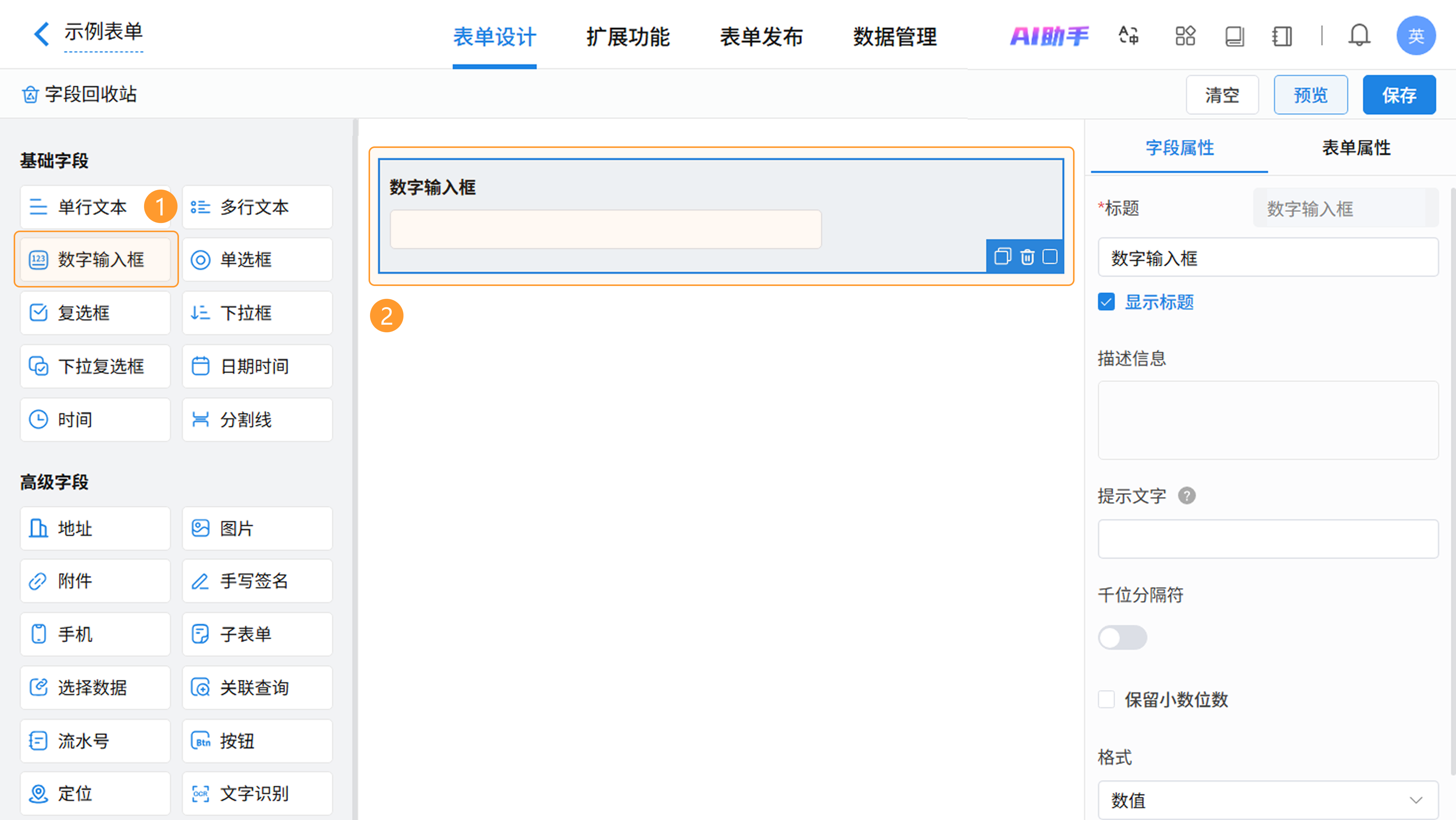在表单设计页面,从左侧字段区拖拽或点击即可添加数字输入框字段,在右侧属性区进行配置。
