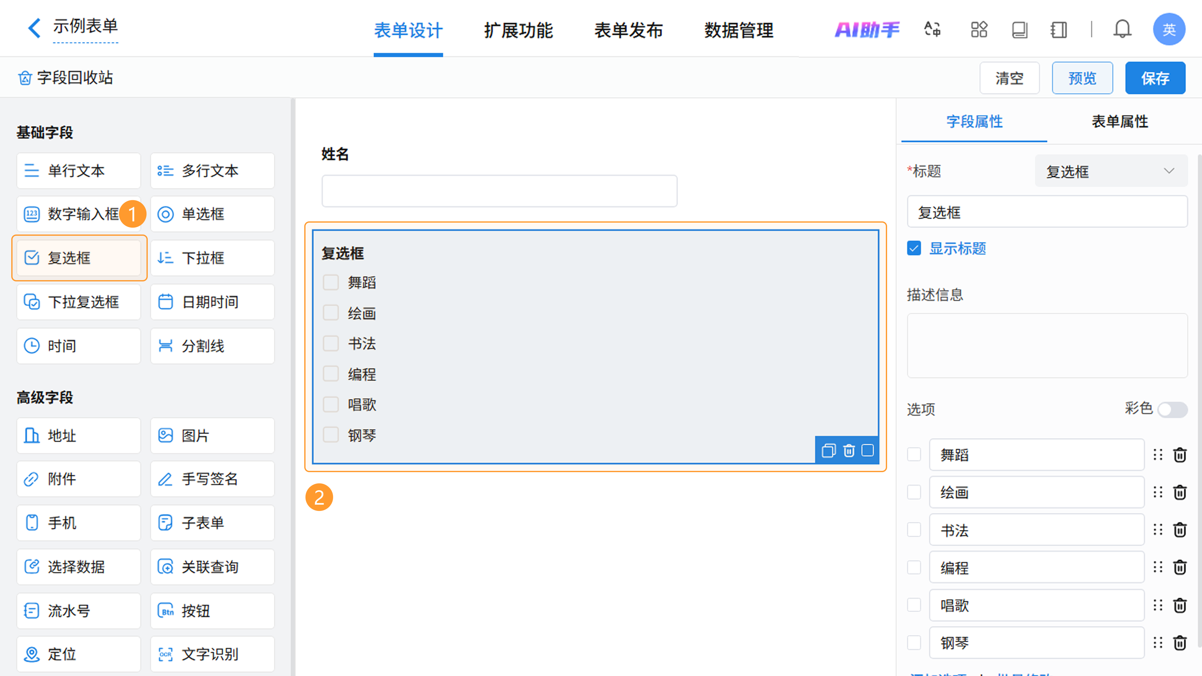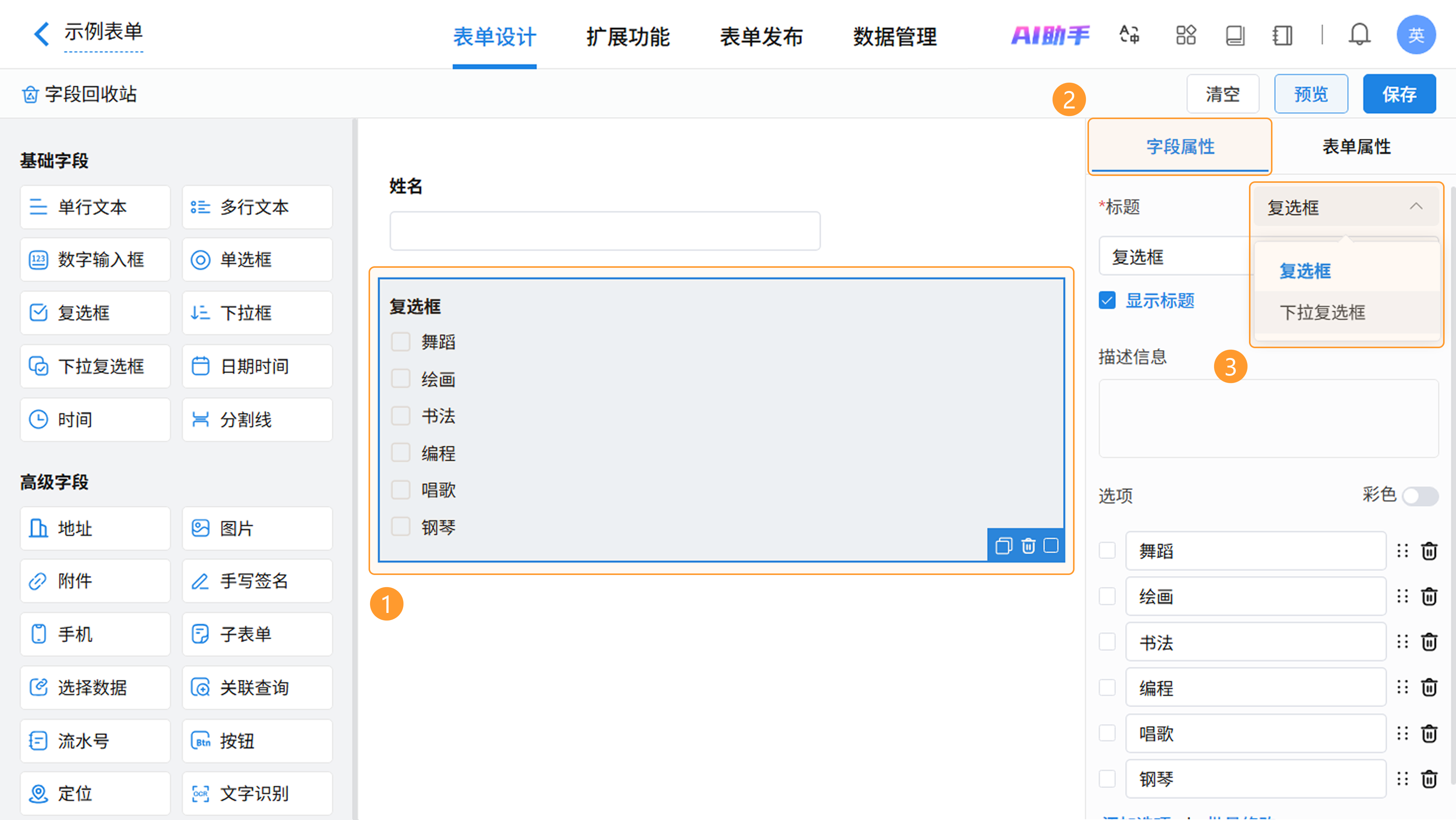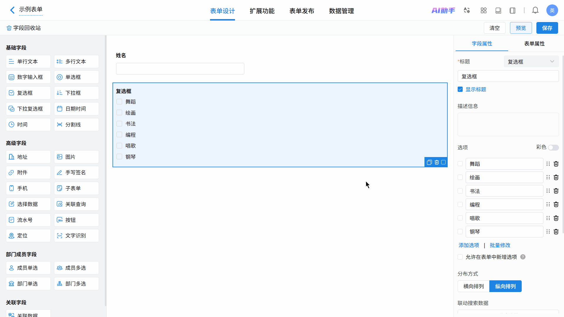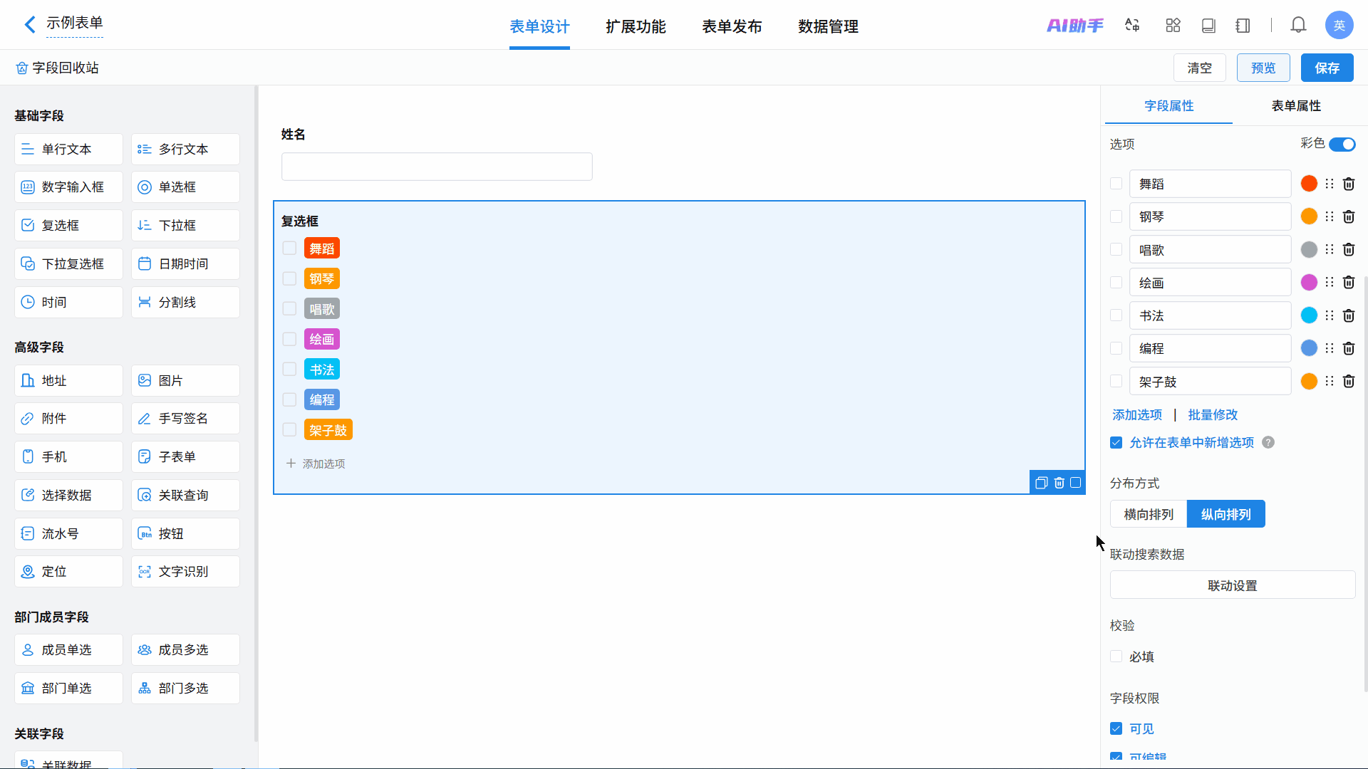 在表单设计页面,从左侧字段区拖拽或点击即可添加复选框字段,在右侧属性区进行个性化配置。