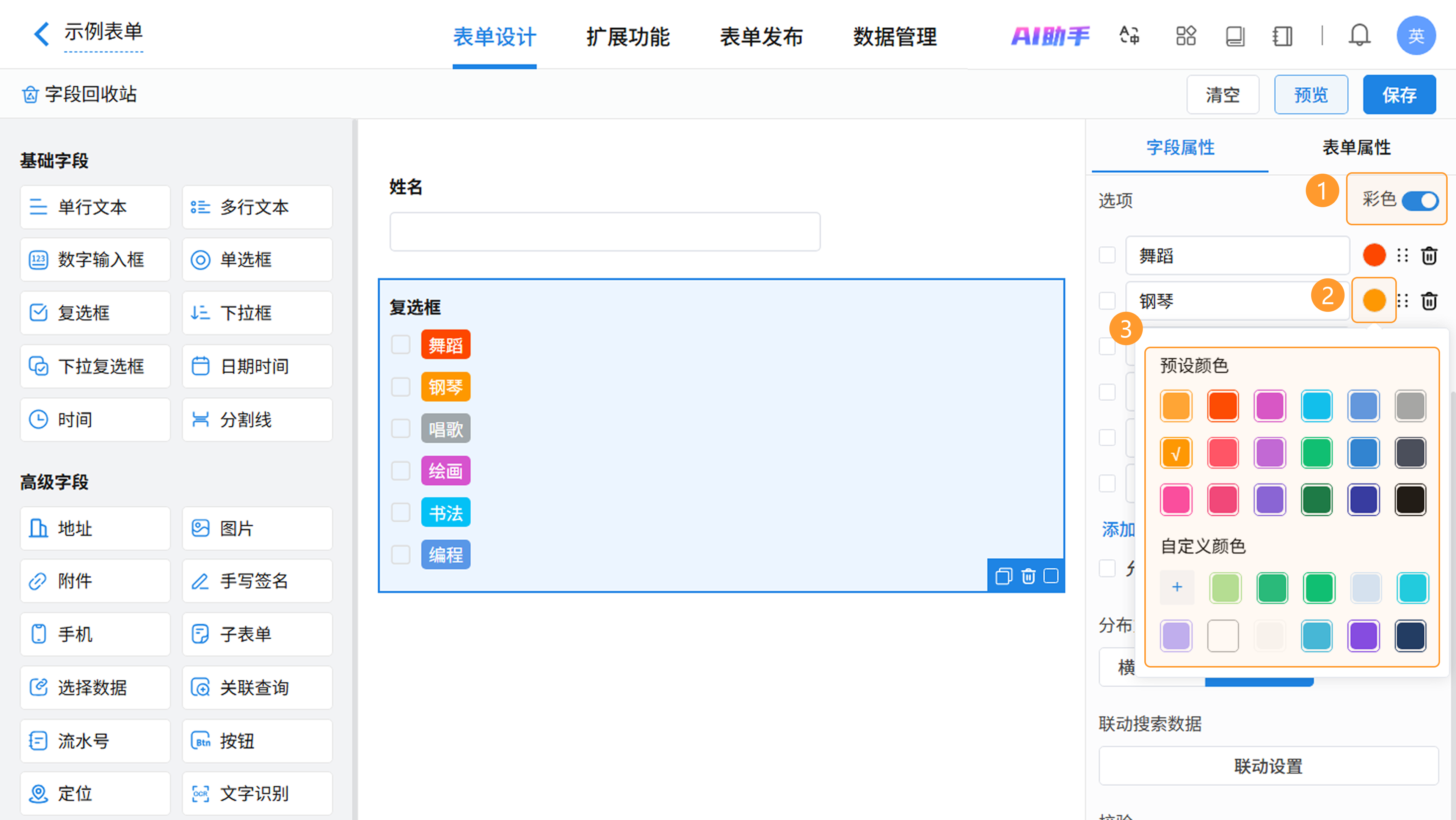 开启复选框的「彩色」功能后,系统会为各选项自动分配颜色。您可以点击颜色色块进行切换或自定义,增强视觉辨识度。