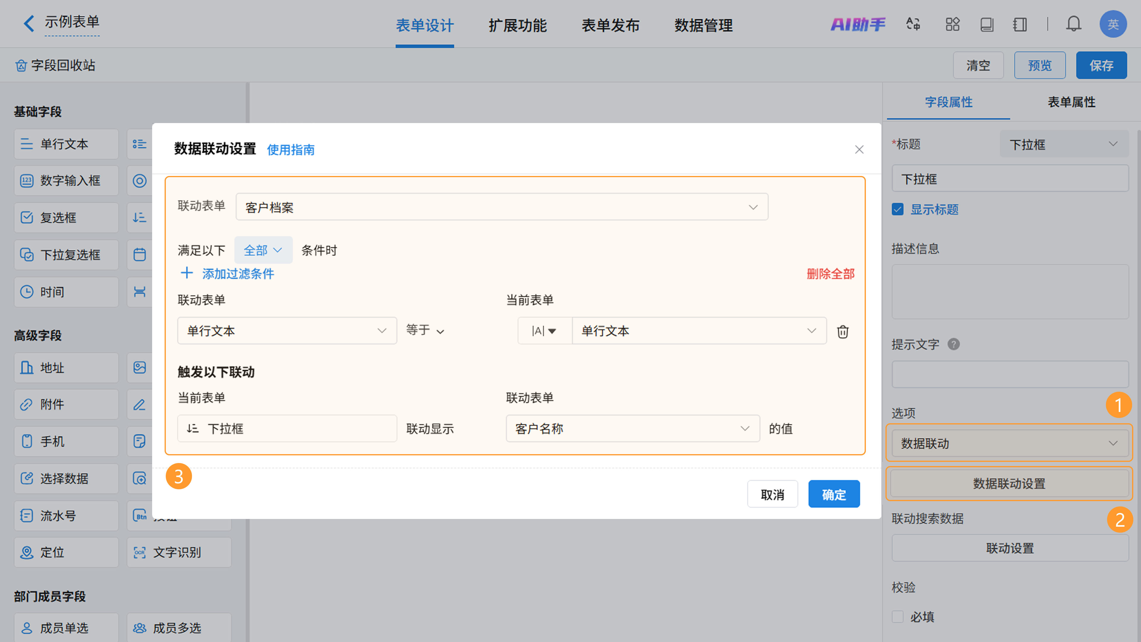 数据联动是指,根据当前表单中其他字段的值,动态筛选其他表单中满足特定条件的数据作为下拉选项。