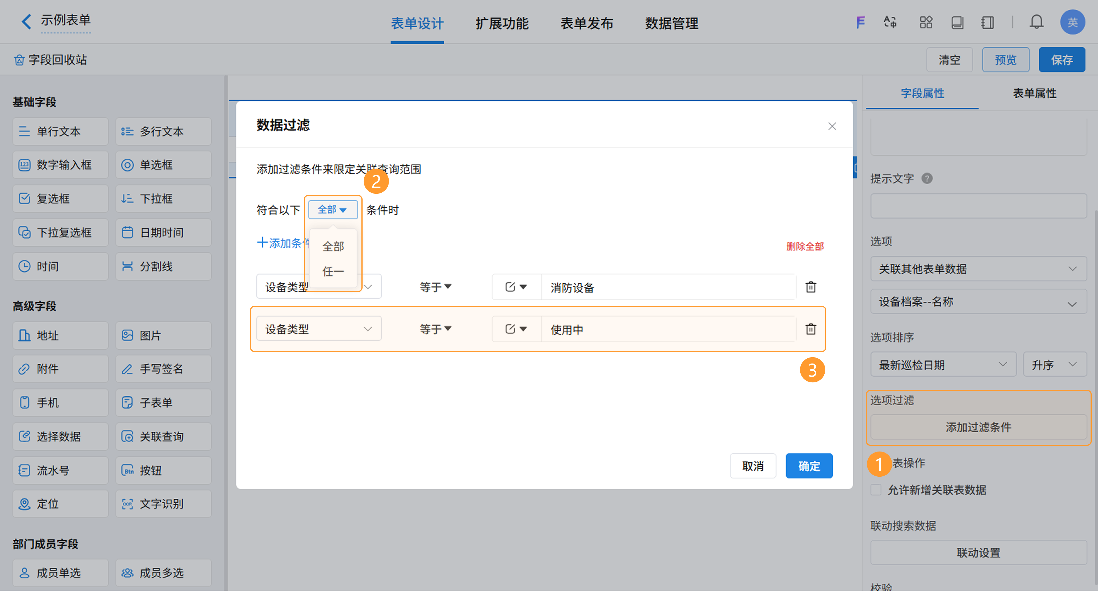 3)数据过滤:可添加过滤条件,仅让满足要求的数据出现在选项中。存在多个条件时,可选择满足「所有」或「任一」条件。