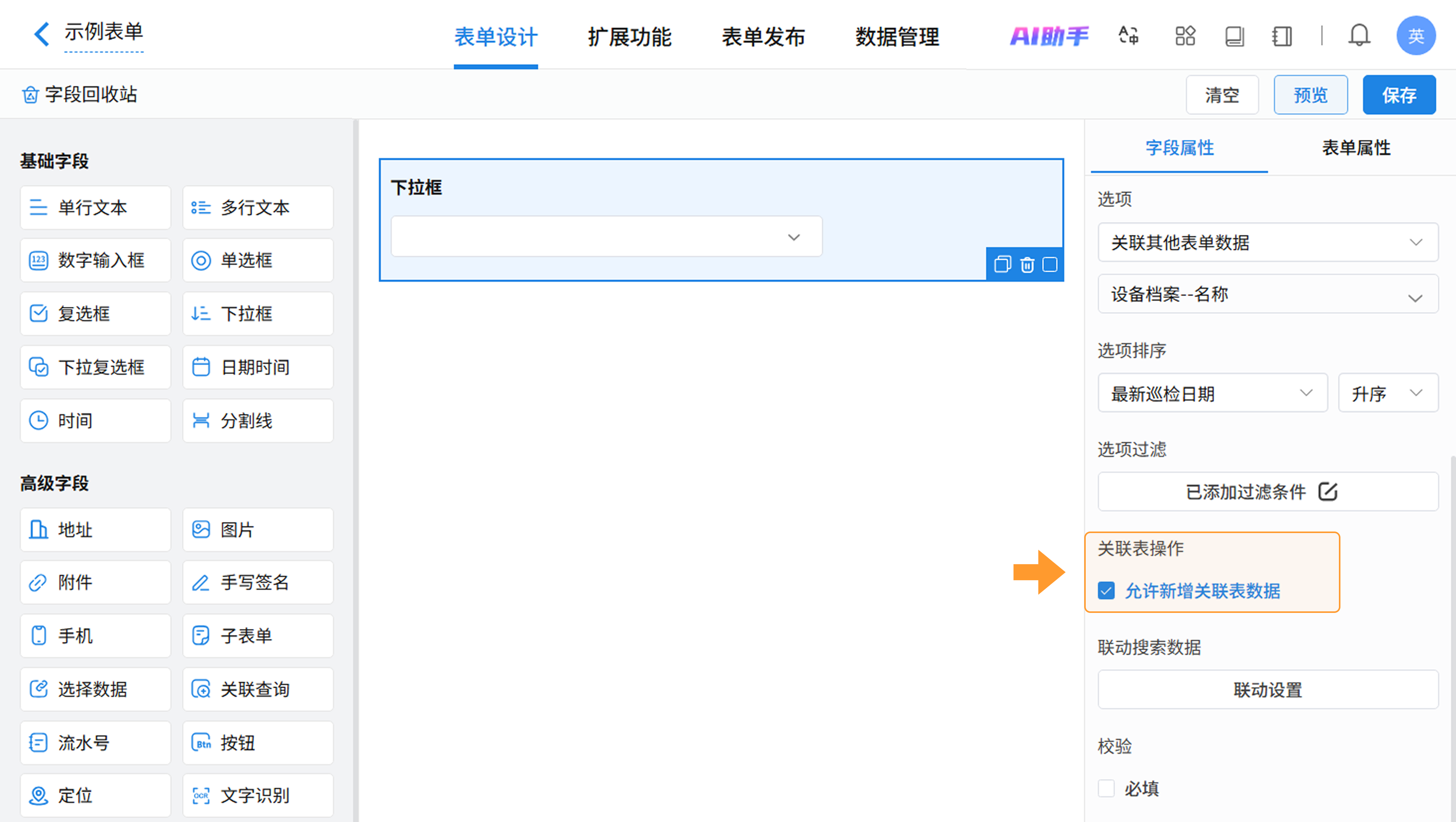 4)允许新增关联表数据:勾选此项后,填表人在录入数据时,若发现选项不满足需求,可点击「添加」图标直接打开关联表的新增数据弹窗。