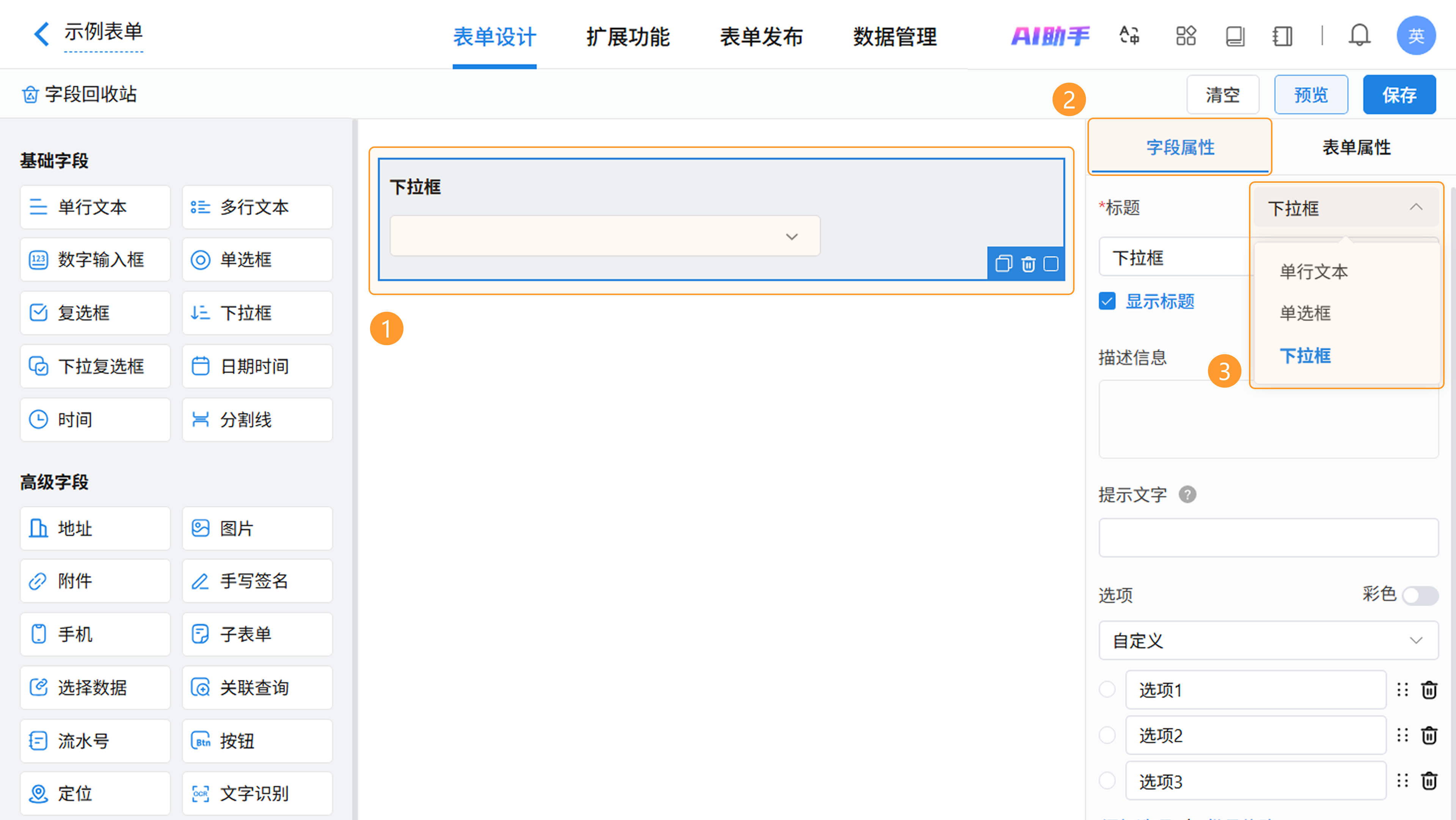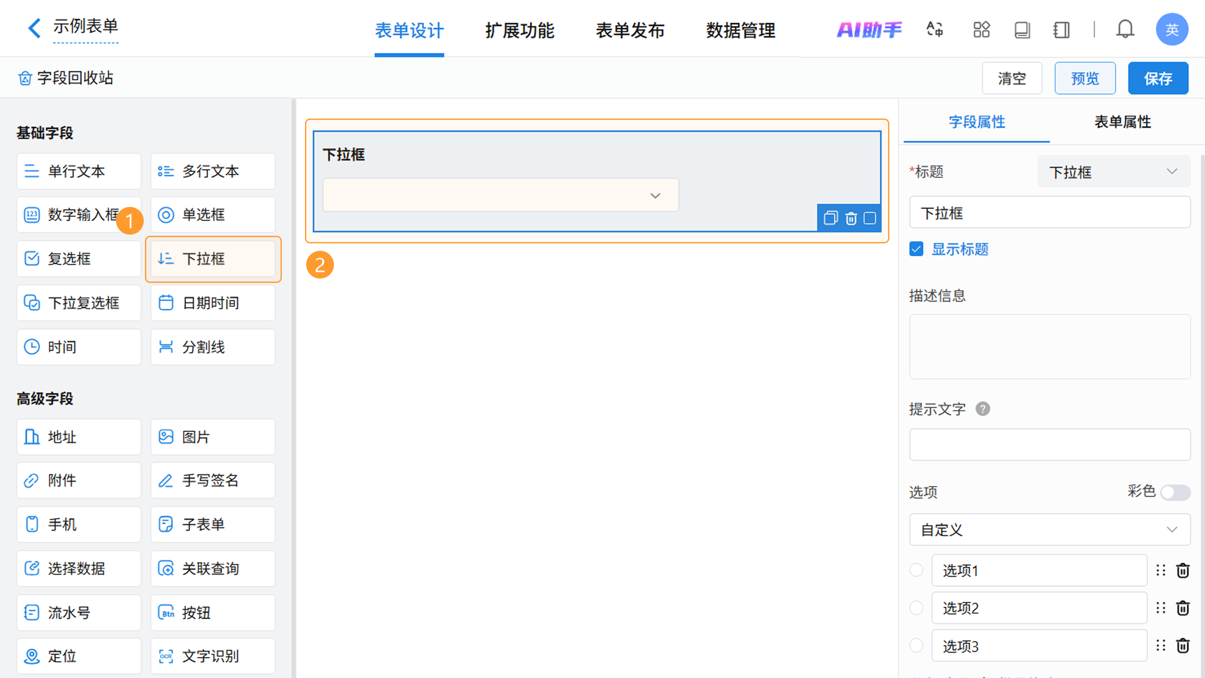 在表单设计页面,从左侧字段区拖拽或点击即可添加下拉框字段,在右侧属性区进行个性化配置。
