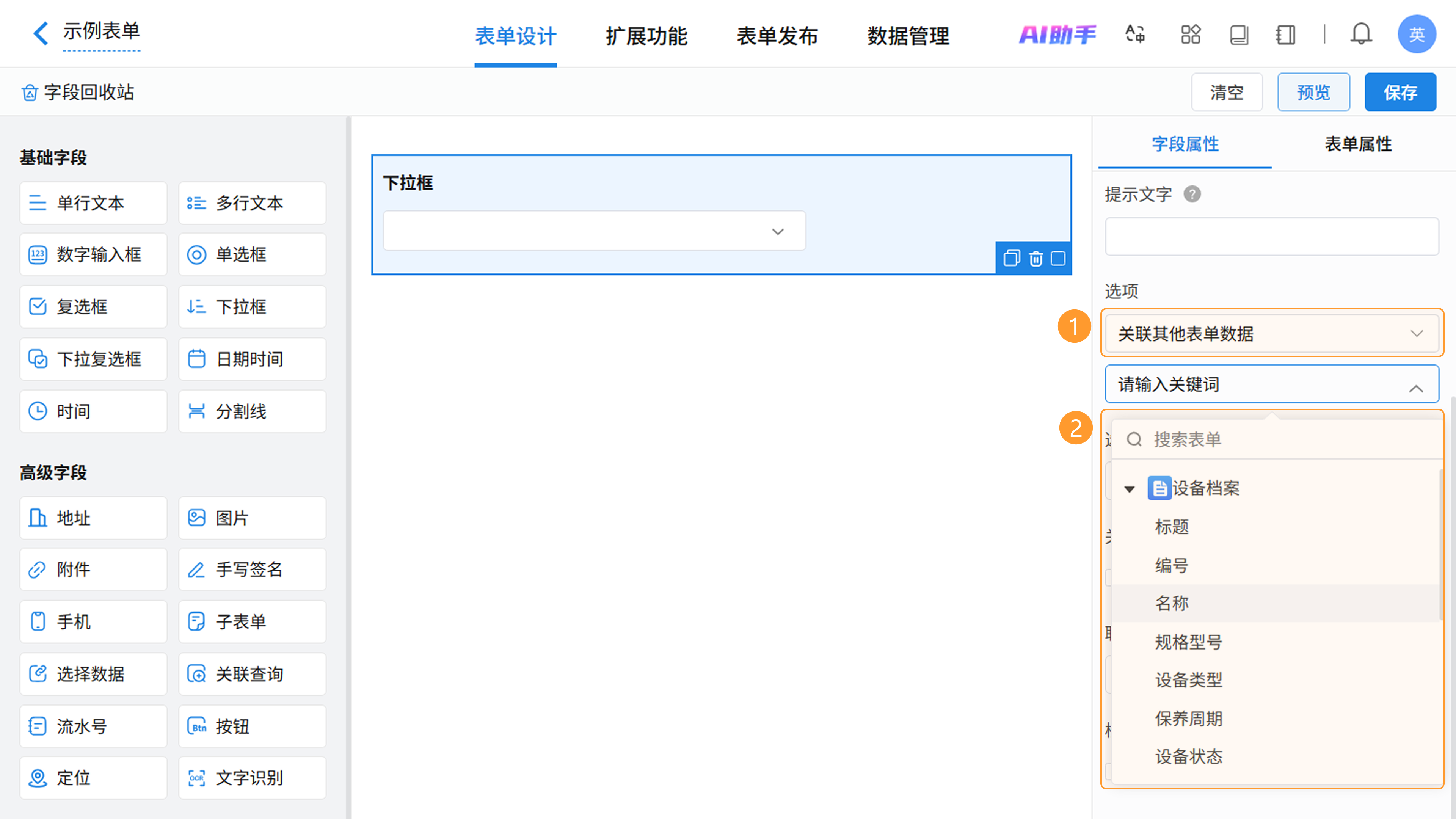 1)基础设置:选择「关联其他表单数据」后,在下拉框中选择需要关联的目标表单及其具体字段;