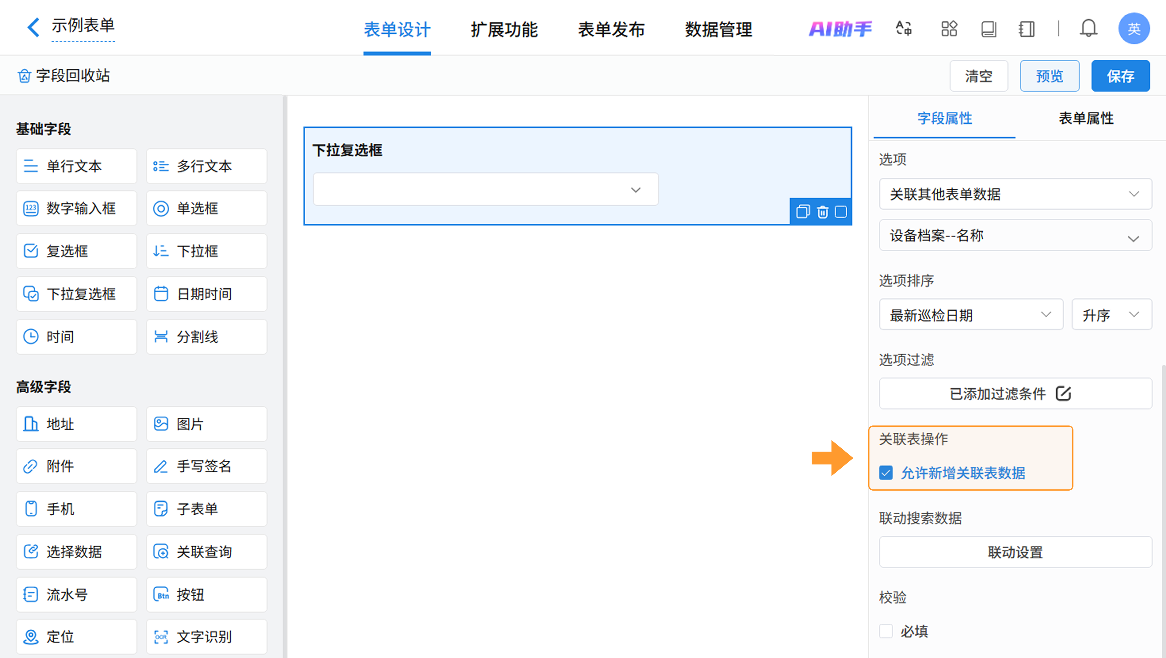 下拉复选框支持与复选框进行类型互转,您可在字段属性中快速完成字段类型调整。